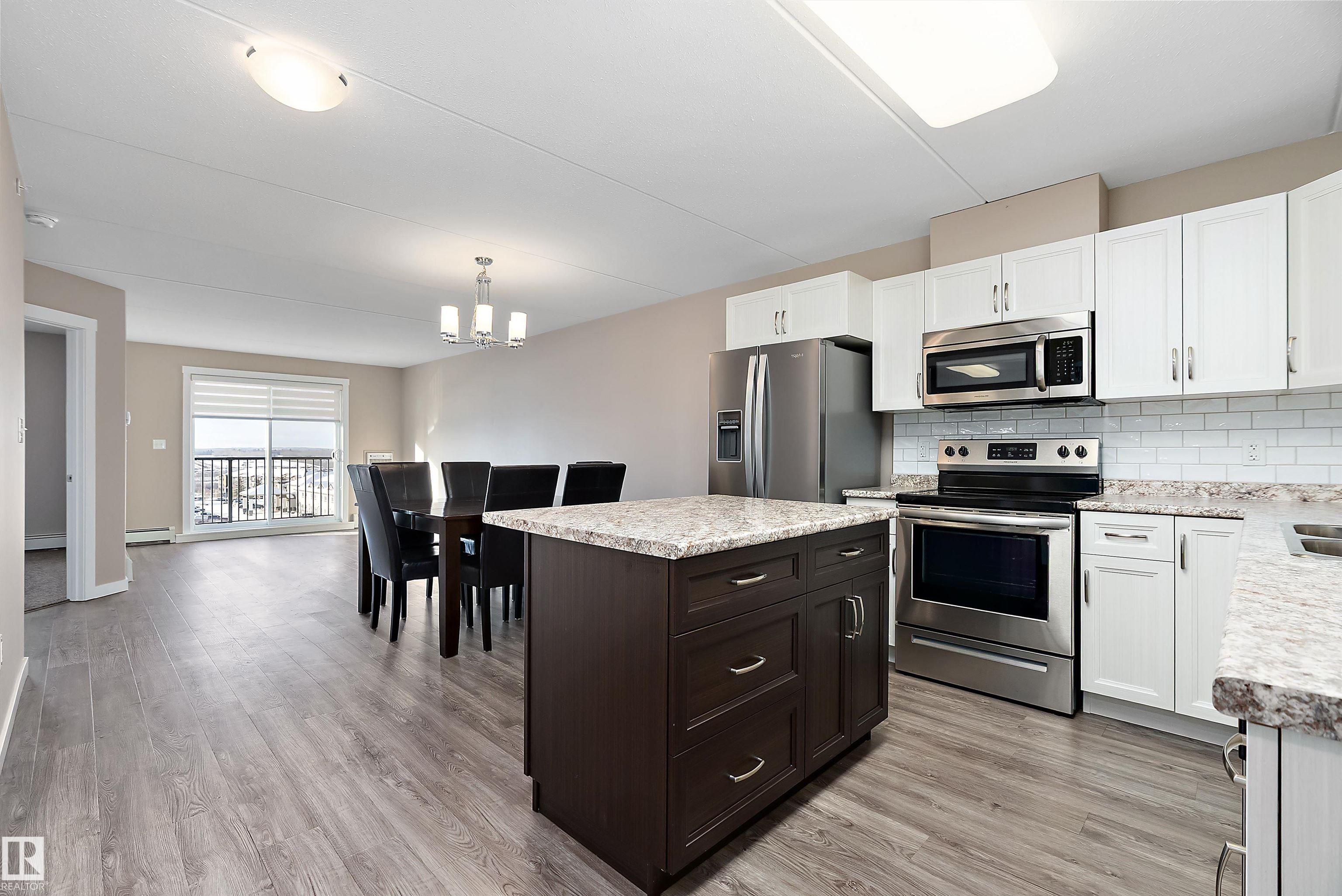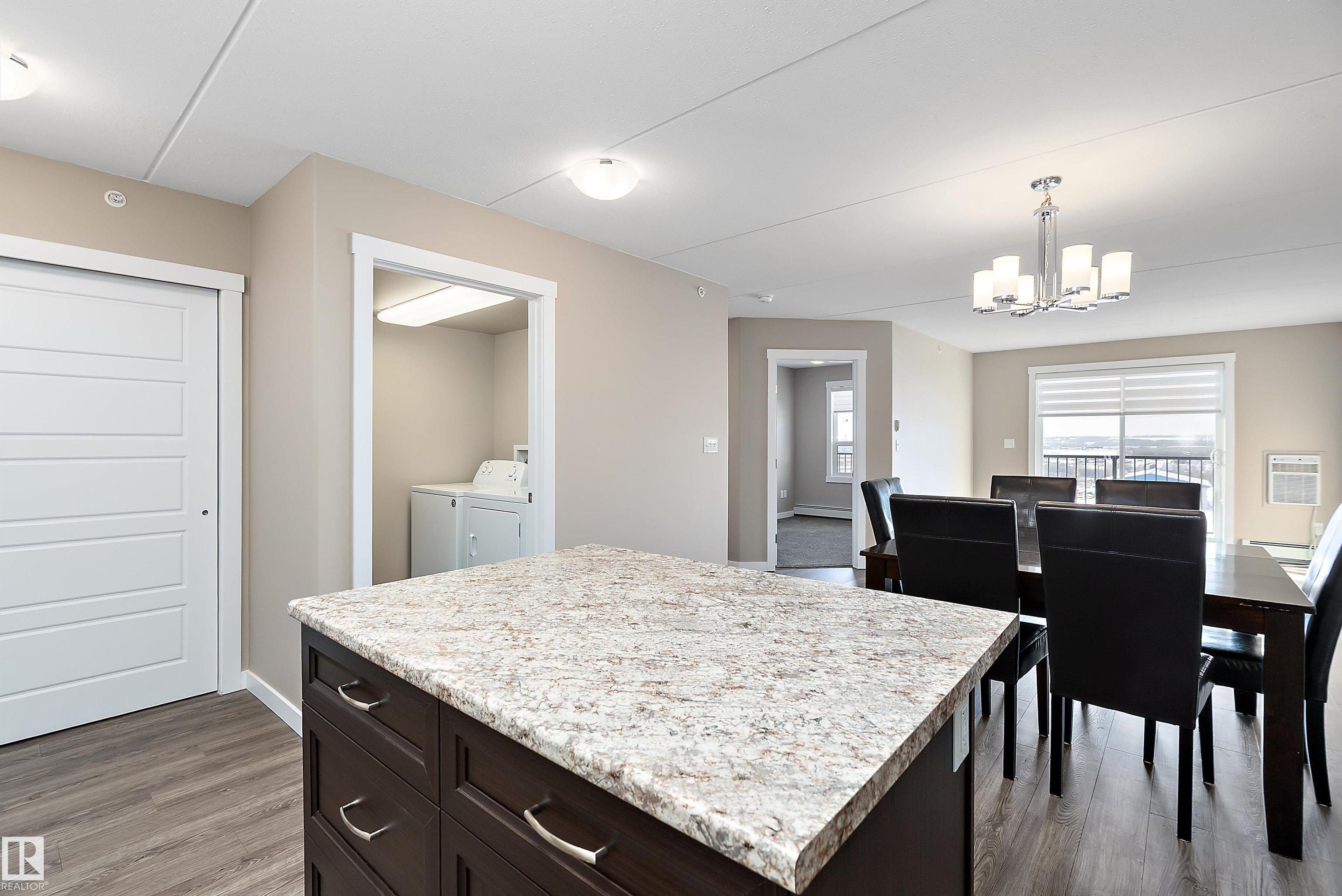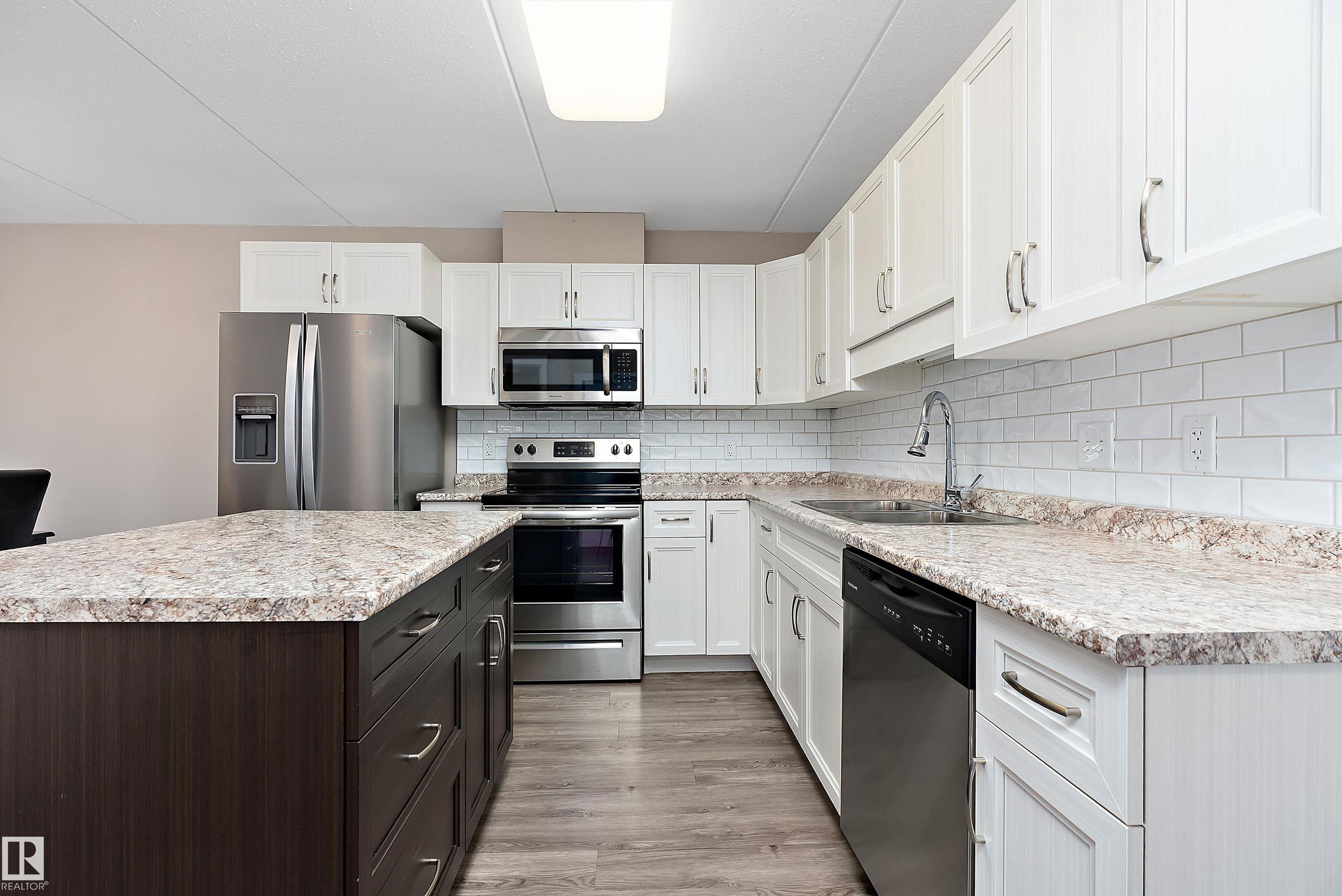 This unique two-bedroom, two-bathroom floor plan offers an airy, open layout designed for comfortable everyday living. Built for durability and quiet enjoyment, the building features 8-inch concrete hollow-core floors and steel stud construction. Inside, you'll find modern cabinetry, a chef's island, vinyl plank flooring, generous closet space, and a primary ensuite with a four-foot walk-in shower. Enjoy west-facing outdoor living on the finished vinyl deck balcony, complete with a gas BBQ outlet and dedicated storage shed. The unit also includes an under-building heated parking stall and benefits from some of the most competitive condo fees in the area, covering nearly everything except power. Bright, solid, and well-appointed, this home offers exceptional value for buyers seeking quality construction and low-maintenance living. Impeccably well cared for and ready to be called "Home" .