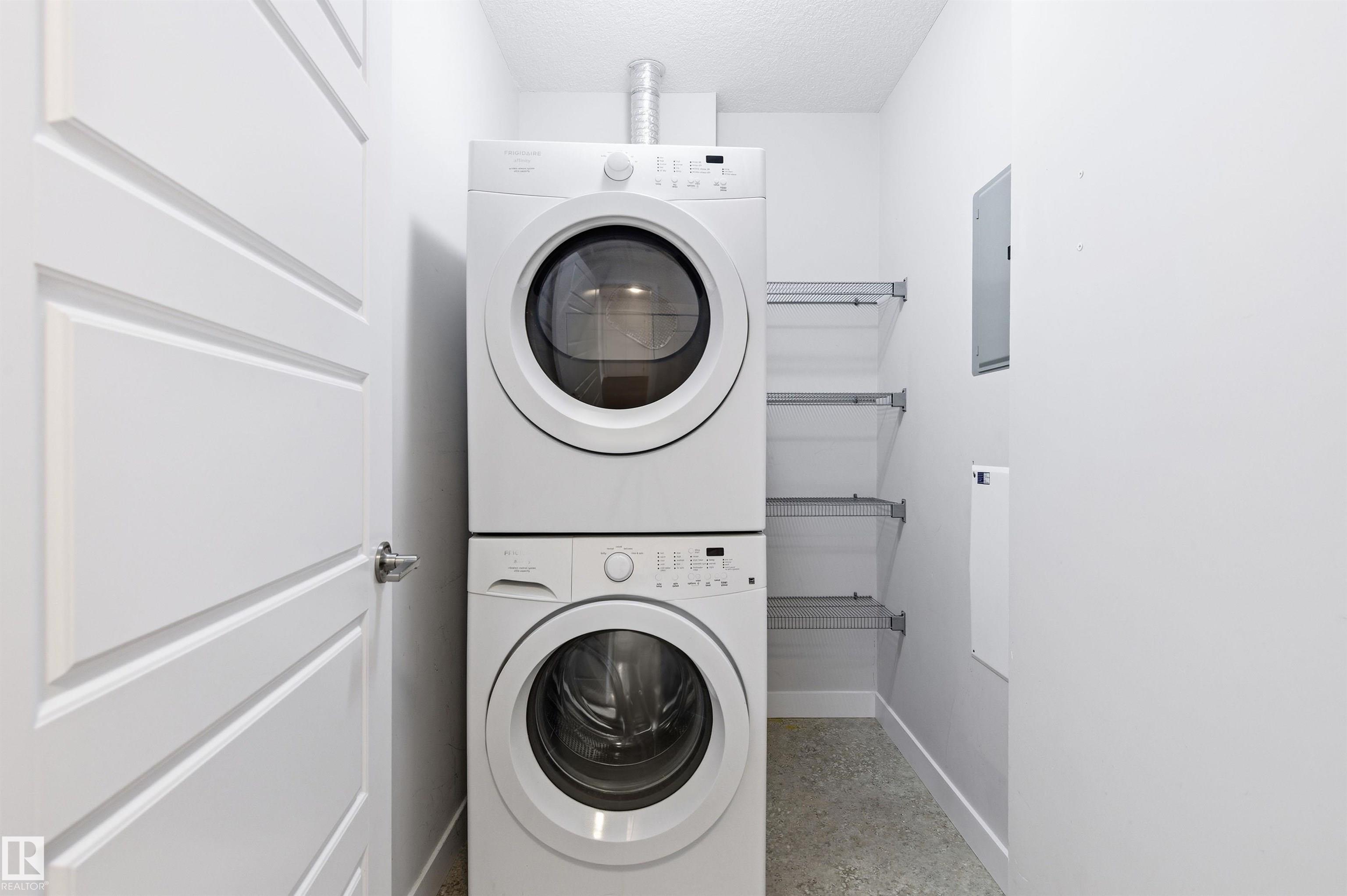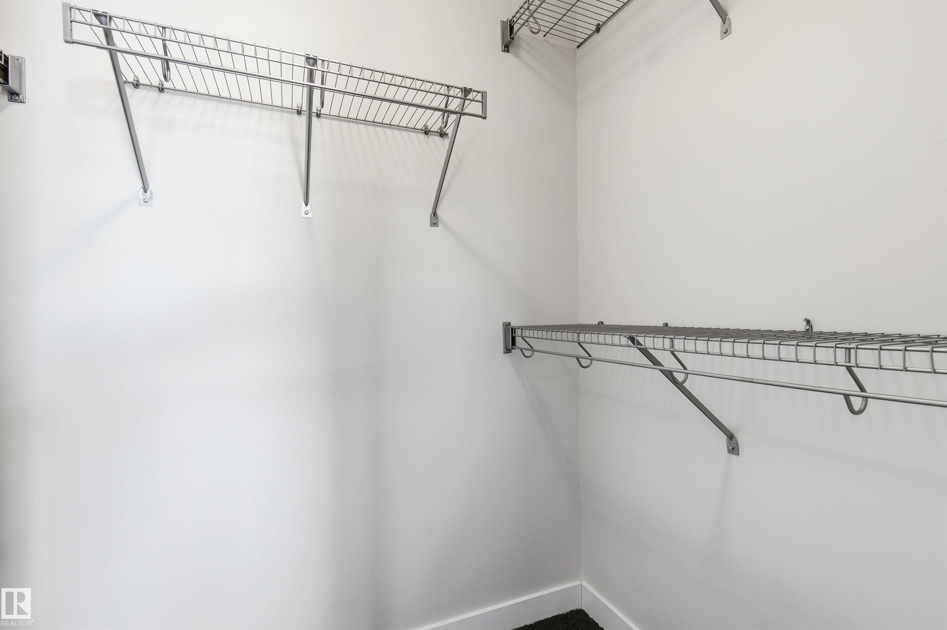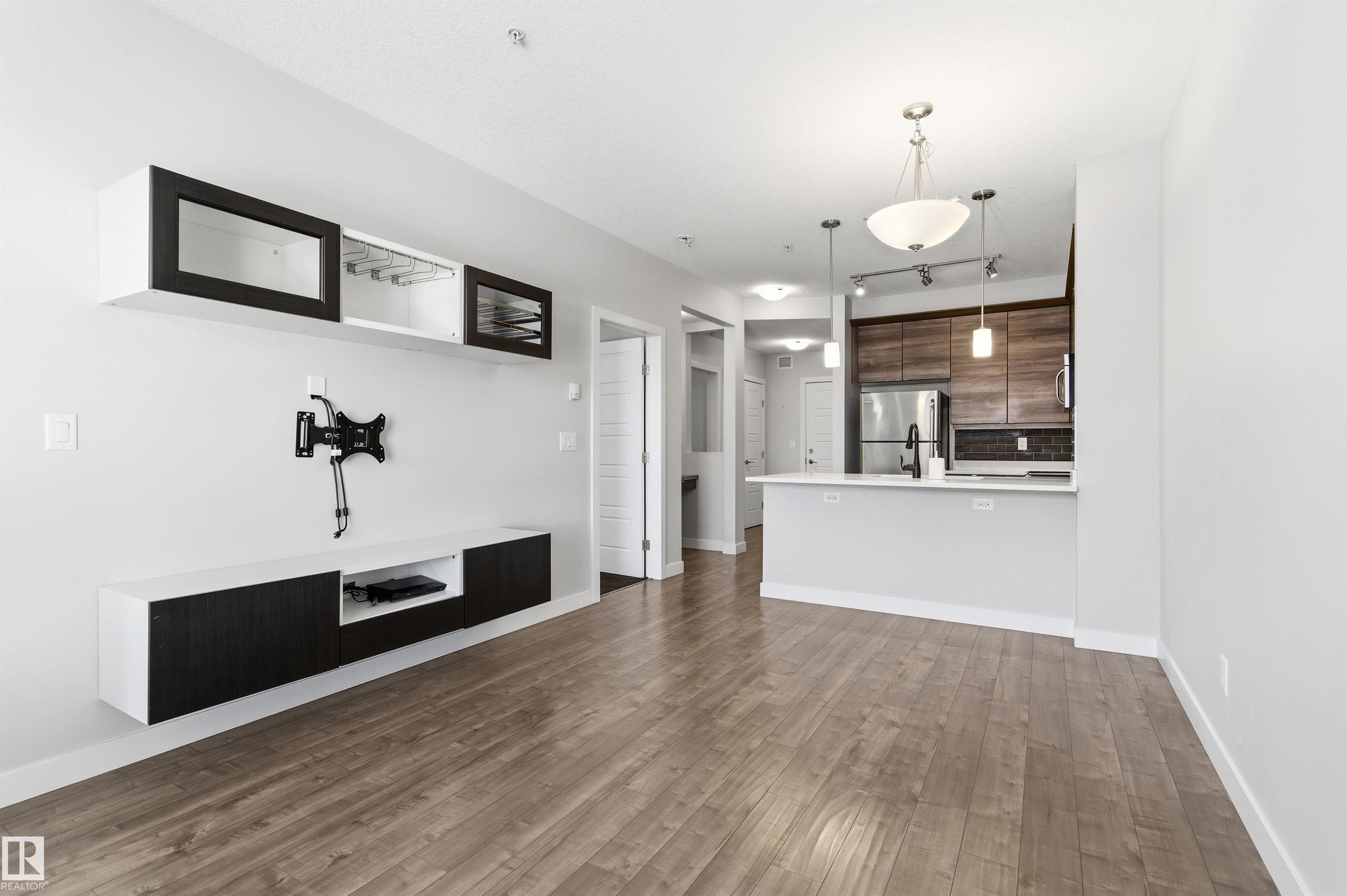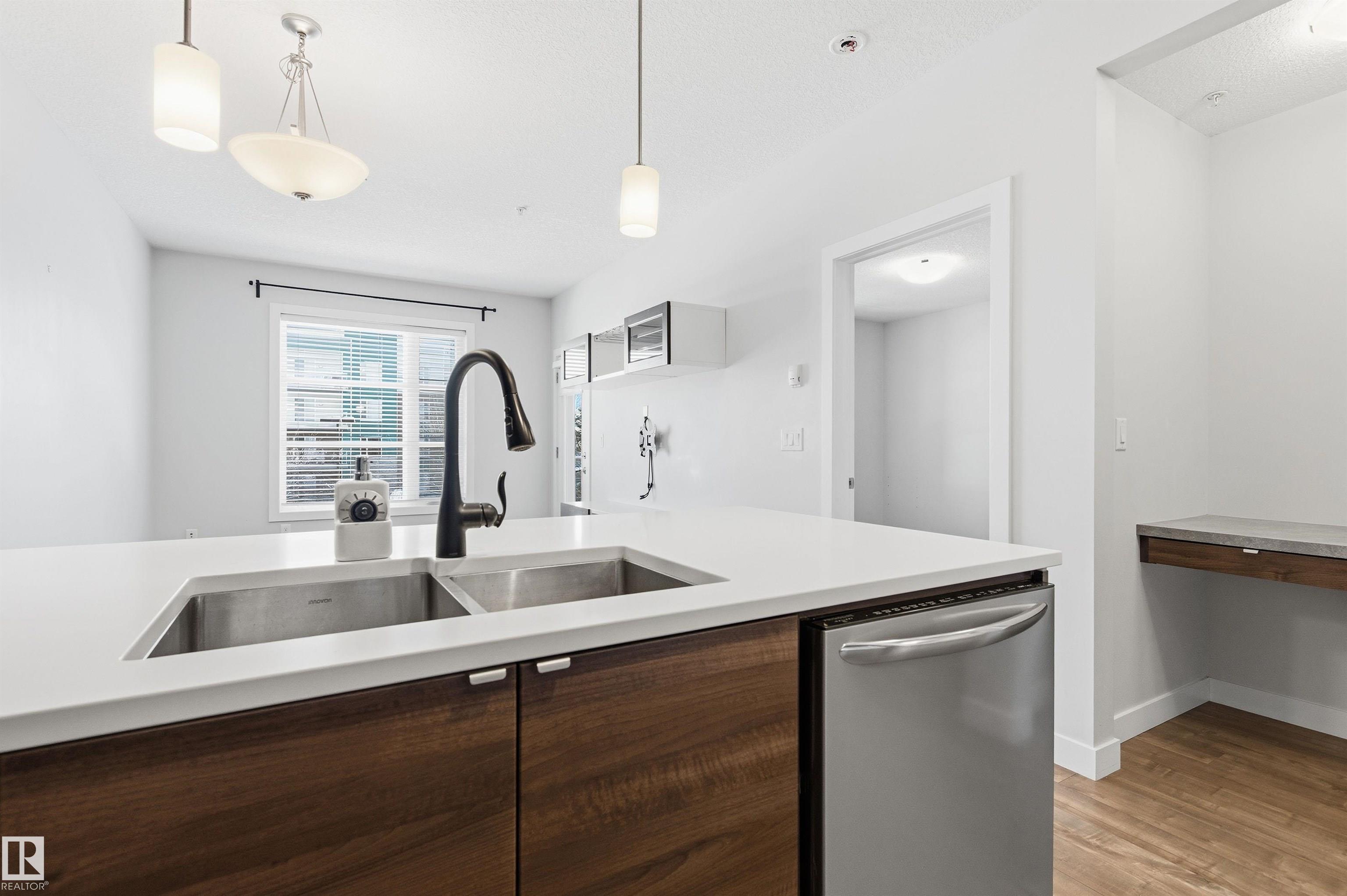 Welcome to life at The Ion in Ambleside, one of Southwest Edmonton's most loved buildings. With scenic trails and parks right outside your door, plus the shops, restaurants, and everyday conveniences of Currents of Windermere are just minutes away. This bright and welcoming 2nd-floor unit features 9-foot ceilings, updated engineered hardwood floors, and a beautiful layout that feels both spacious and inviting. The refreshed kitchen shines with white quartz countertops, and the beautifully updated bathroom has a modern tile surround for a cohesive, elevated look. Enjoy peaceful treed views from your east-facing patio - private, quiet, and perfect for morning coffee. The bedroom has a walk-in closet, the laundry room offers extra storage, and a built-in desk creates the ideal work-from-home space. Perfect as a first home, a stylish downsize or a smart investment. Previously rented for $1550 per month, this is an incredible opportunity in a building that continues to be a favourite!