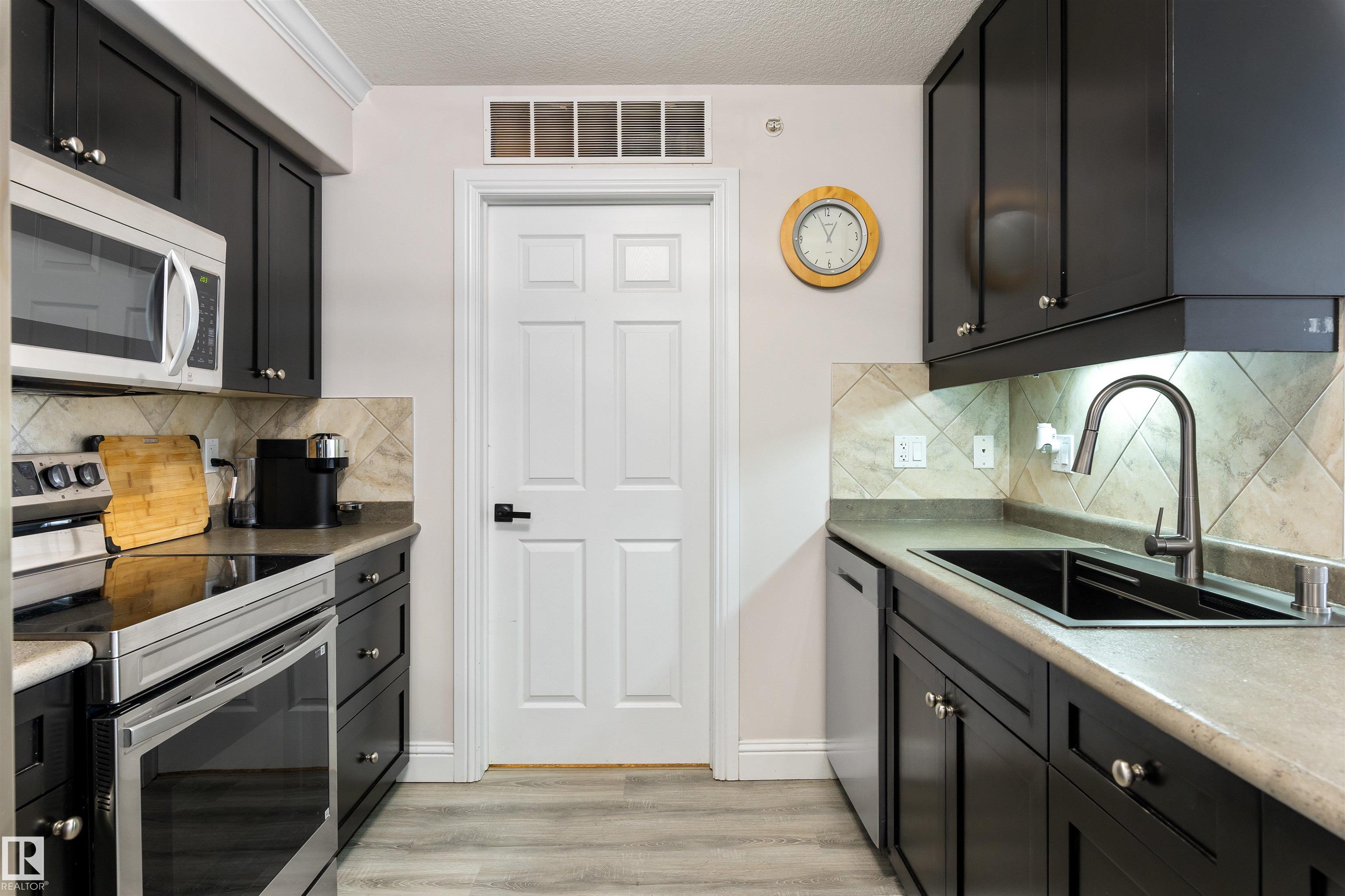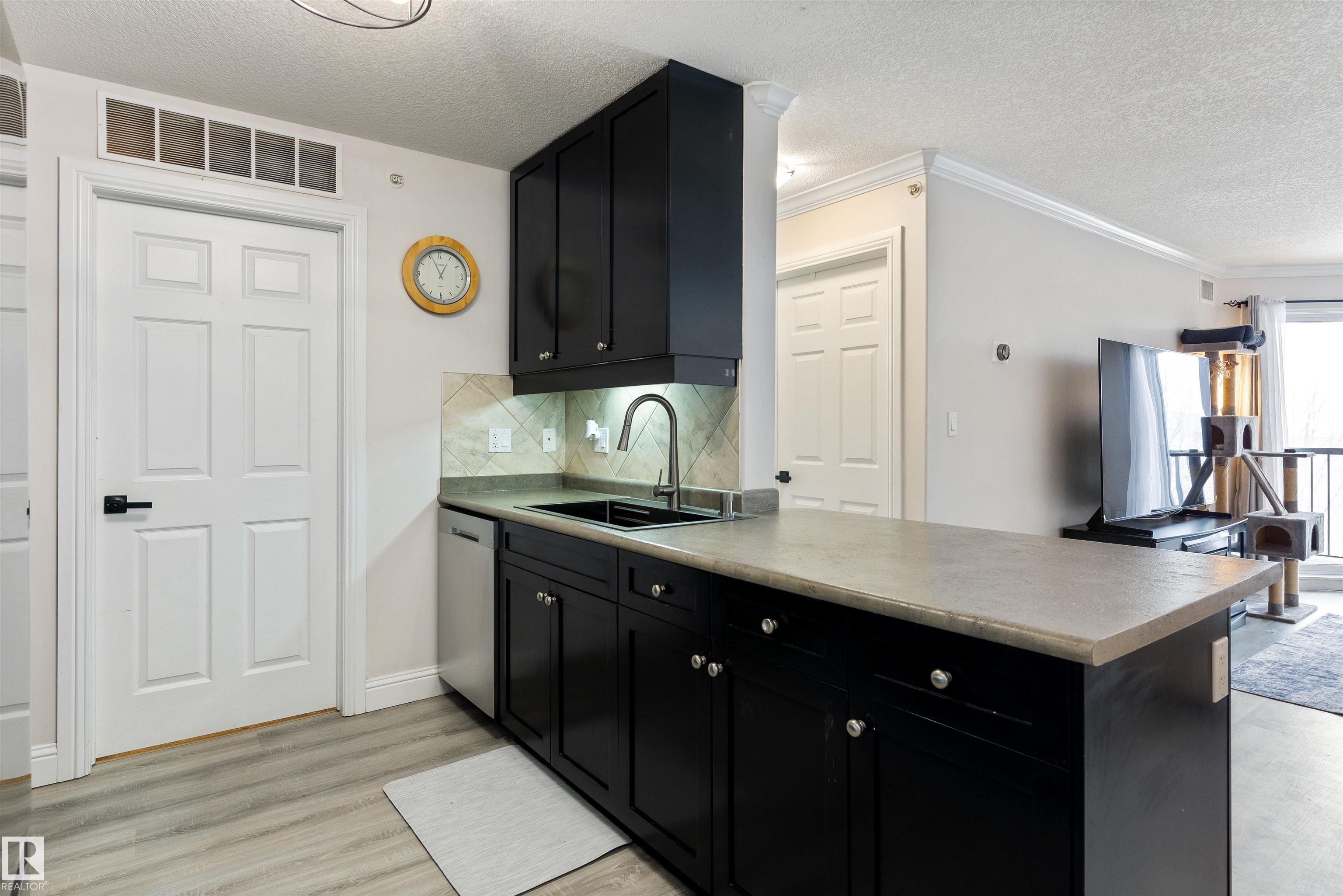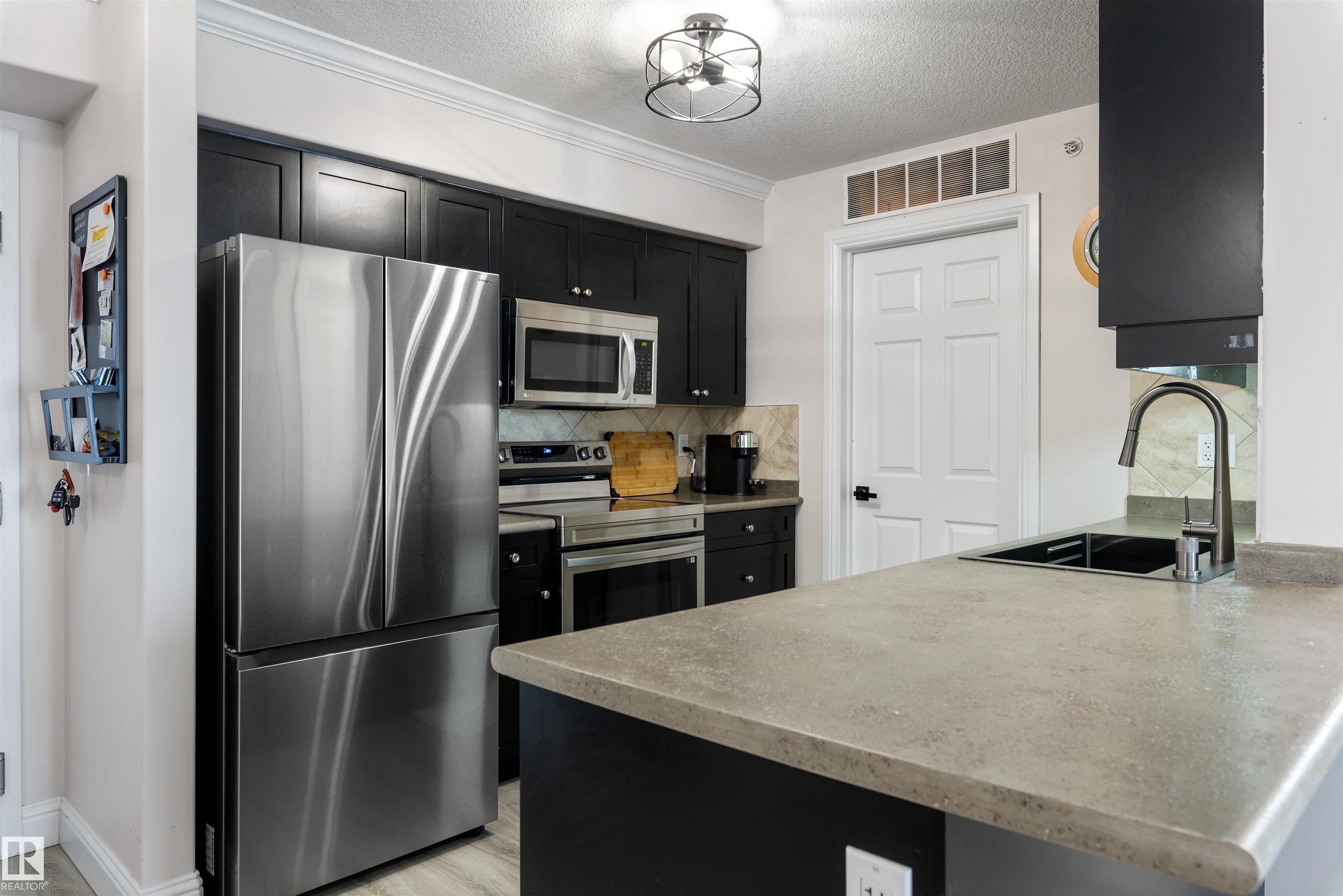 Rare TOP-FLOOR south-facing unit filled with natural sunshine and elegant designer-inspired RENOVATIONS offers an elevated standard of condo living. Flooded with natural light and enhanced by 9' ceilings, the interior features new laminate flooring, curated paint selections, updated black lighting, stainless steel appliances, sleek countertops, and a deep single-bowl stainless sink, creating a refined and cohesive feel. The OPEN-CONCEPT kitchen, dining, and living area flows seamlessly to a private south-facing balcony with natural gas BBQ hookup, perfect for relaxing or entertaining. The primary suite offers a WALK-IN closet and private 4-pc ensuite, while the second bedroom sits beside the main bath with walk-in shower, creating a well-proportioned layout for owners or guests. In-suite laundry and titled heated UNDERGROUND parking with STORAGE cage add everyday convenience. A rare combination of top-floor privacy, sunlight, and thoughtful upgrades, designed for comfortable, low-maintenance living.