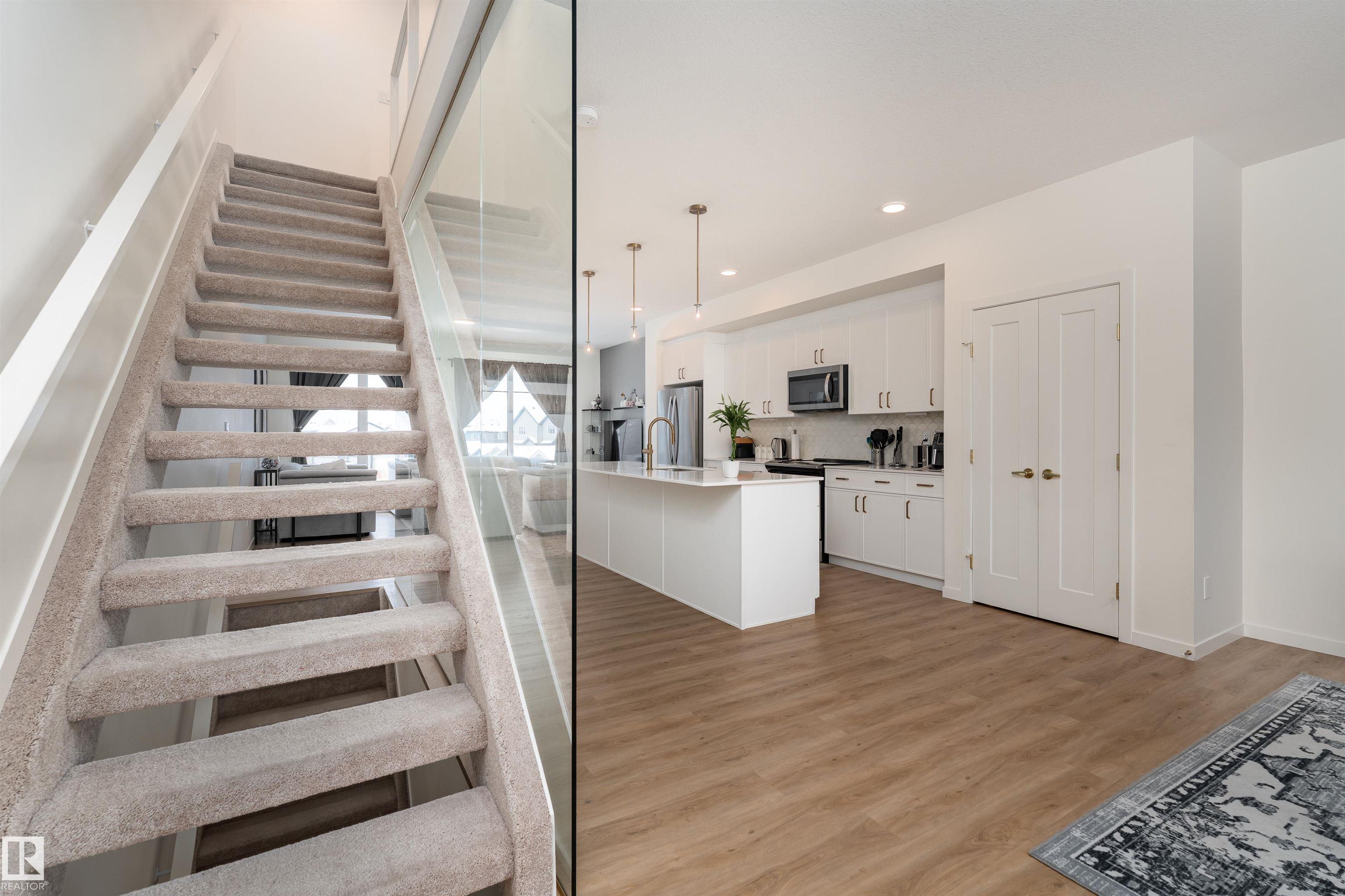 Natural light pours into this stunning 3 storey home built by Cantiro, creating a bright and welcoming feel throughout 1,870 sq ft of modern living space. With its east facing exposure, sunshine fills the home beautifully each morning. Step up to the 2nd level and enjoy the open concept layout featuring a spacious living room with oversized windows, a modern white kitchen with stainless steel appliances and a large island with a sink, and a dining area with direct access to the balcony. A convenient half bath completes this level. Upstairs on the 3rd floor, the primary bedroom offers an oversized window and a sleek 4 piece ensuite with ample counter space and a gorgeous soaker tub, along with 2 additional bedrooms and a full bathroom. On the ground floor, a bright den with large windows makes the perfect home office, plus access to the spacious 2 car tandem garage. Low maintenance landscaping and nearby disc golf and schools complete this impressive home. Come experience sun soaked elevated living today.