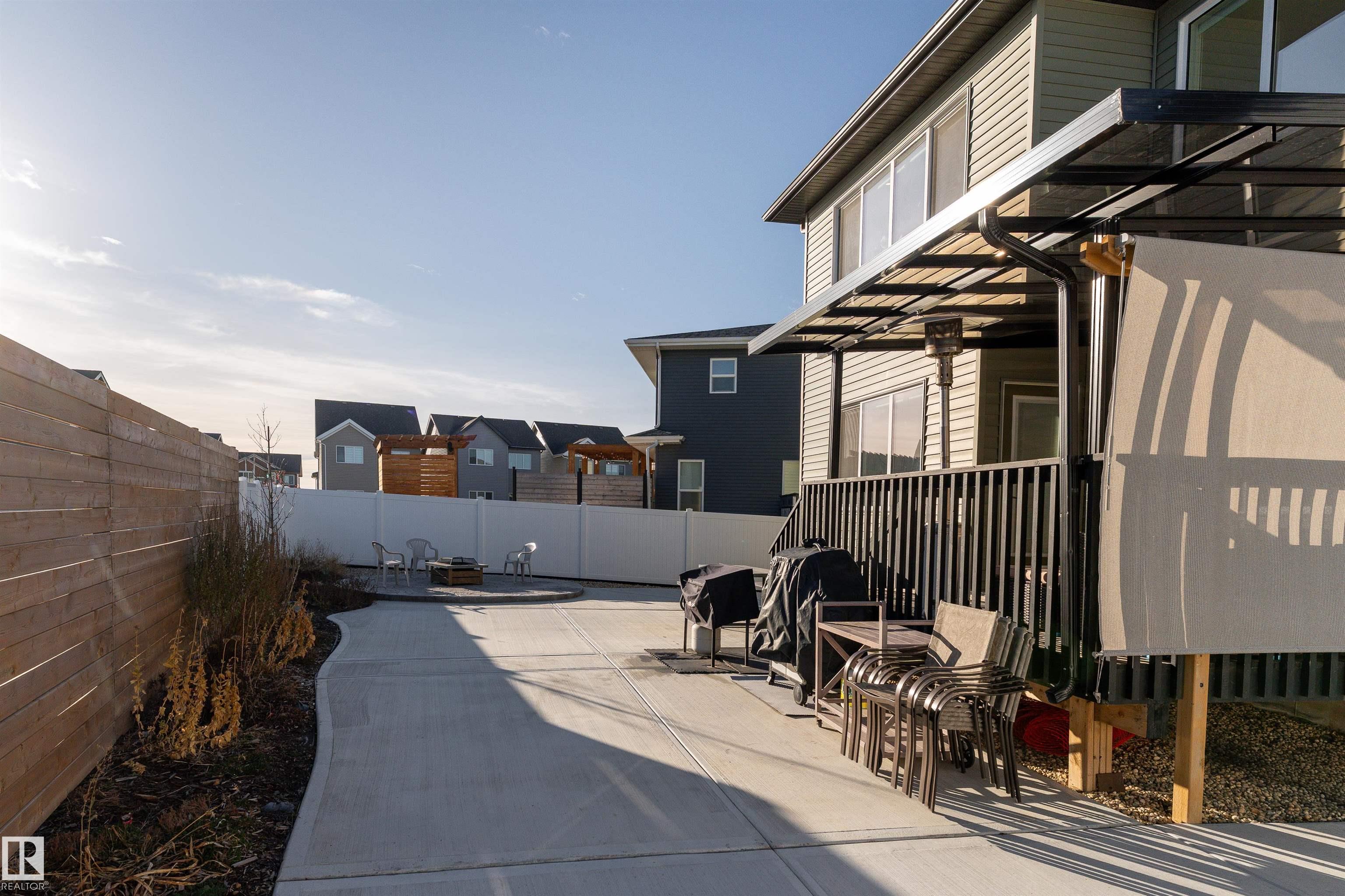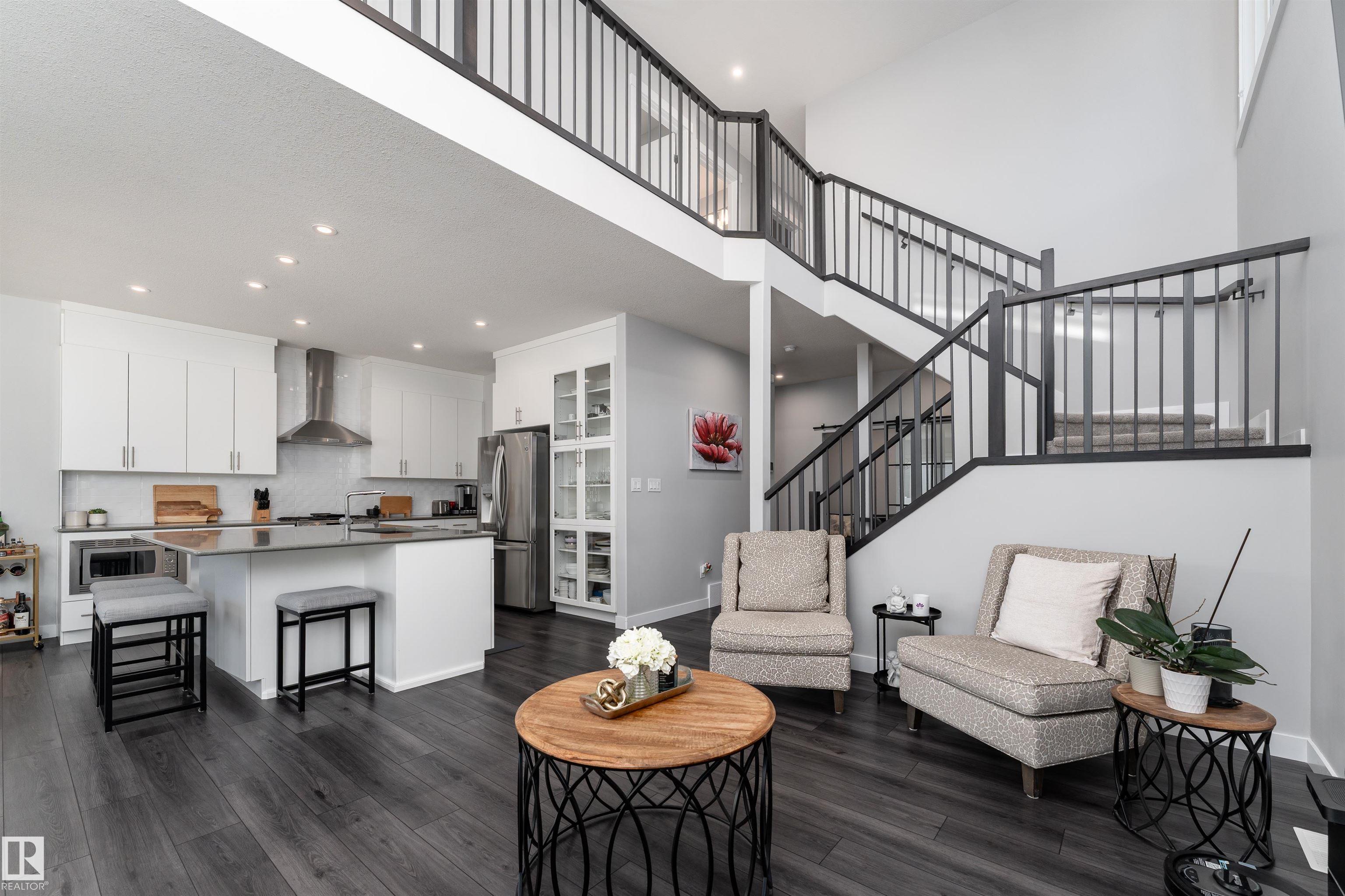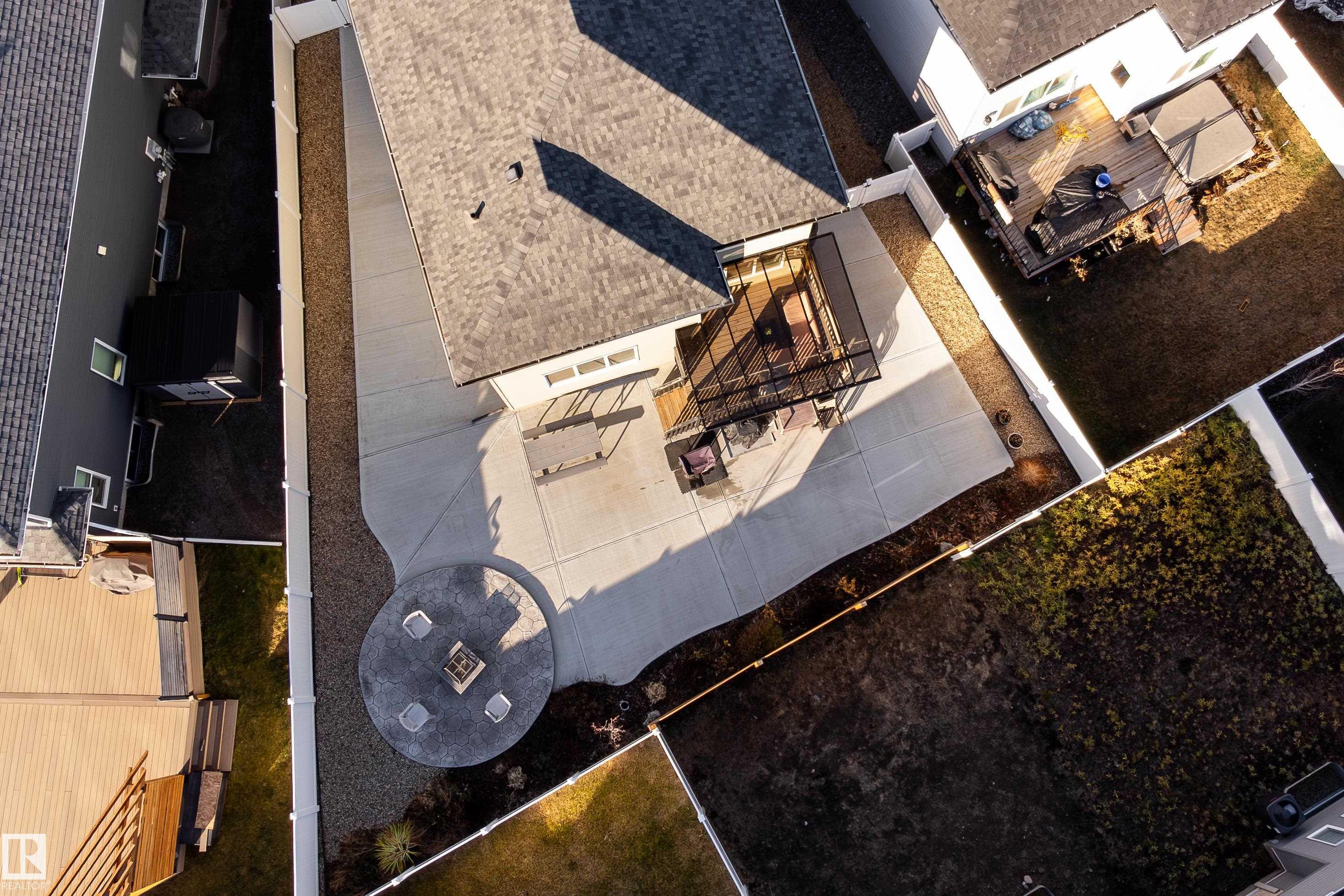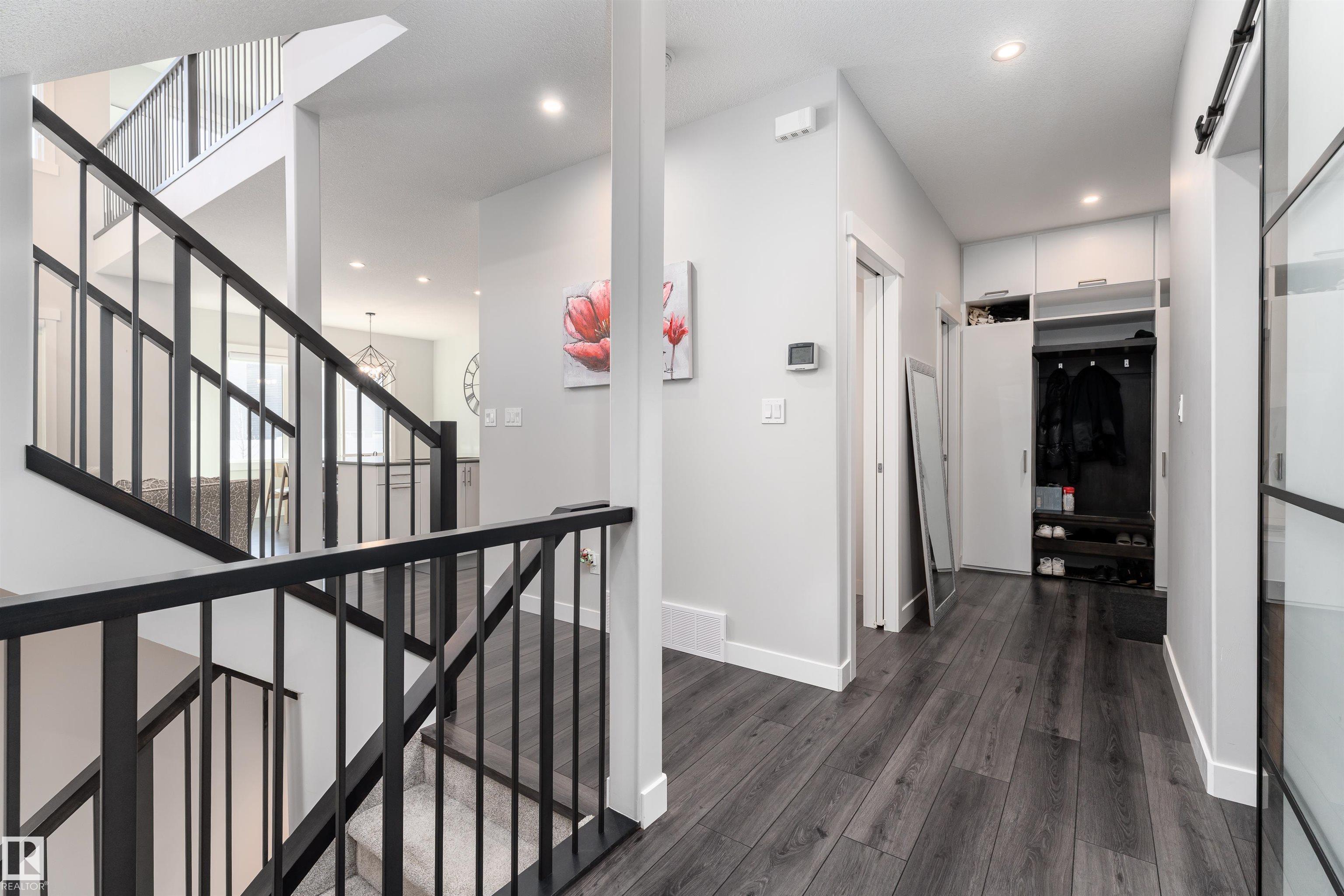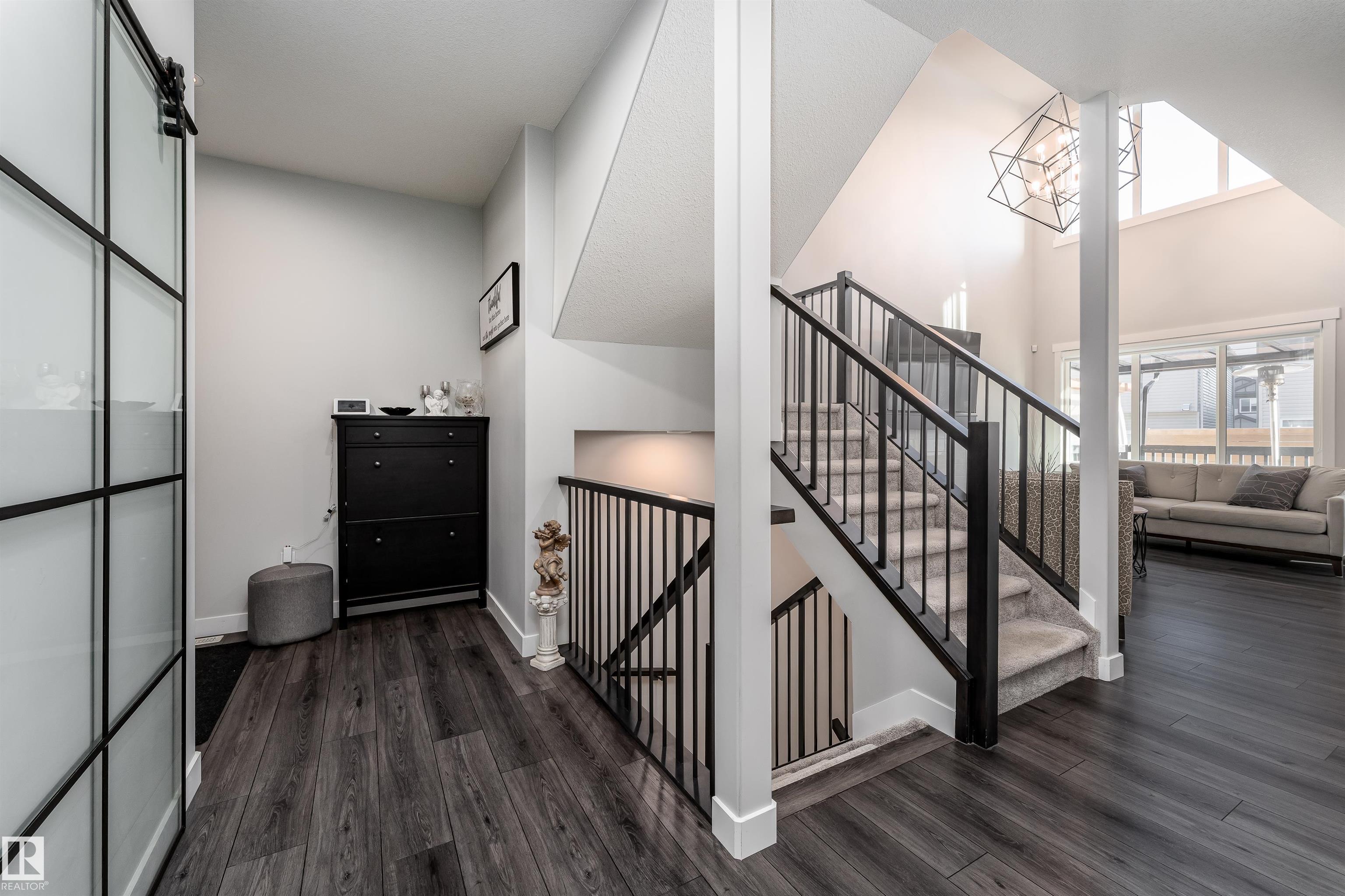 Move-in ready Coventry-built home offering upgraded, low-maintenance living on a quiet pie-shaped lot in a cul de sac! This stunning open-to-below floor plan features 3 bedrooms+den, 2.5 bathrooms, a cozy bonus room overlooking the living room, convenient upstairs laundry w/ sink & double-attached garage. The bright living room impresses w/ soaring ceilings, gas fireplace & is beautifully accented by upgraded railings. Chef's kitchen offers a massive island w/ extra storage, s/s appliances, gas stove, built-in wall oven & microwave, & glass cabinetry. The spacious primary retreat includes a sitting area, walk-in closet & spa-like ensuite w/ dual sinks, soaker tub & large shower. Enjoy countless upgrades: full concrete landscaped yard, finished stairs to the dbasement w/ rough-ins for bar & bath, 9ft ceilings on main & basement, fire pit, deck w/ glass cover, bench & organizers in mudroom, epoxy garage floors, water softener, tankless hot water & A/C. Convenient access to Anthony Henday & many amenities!