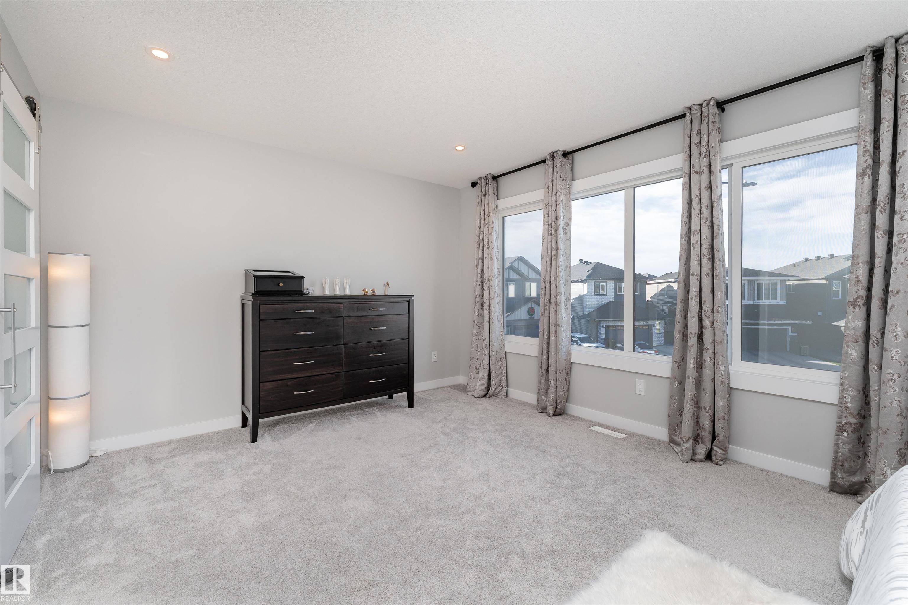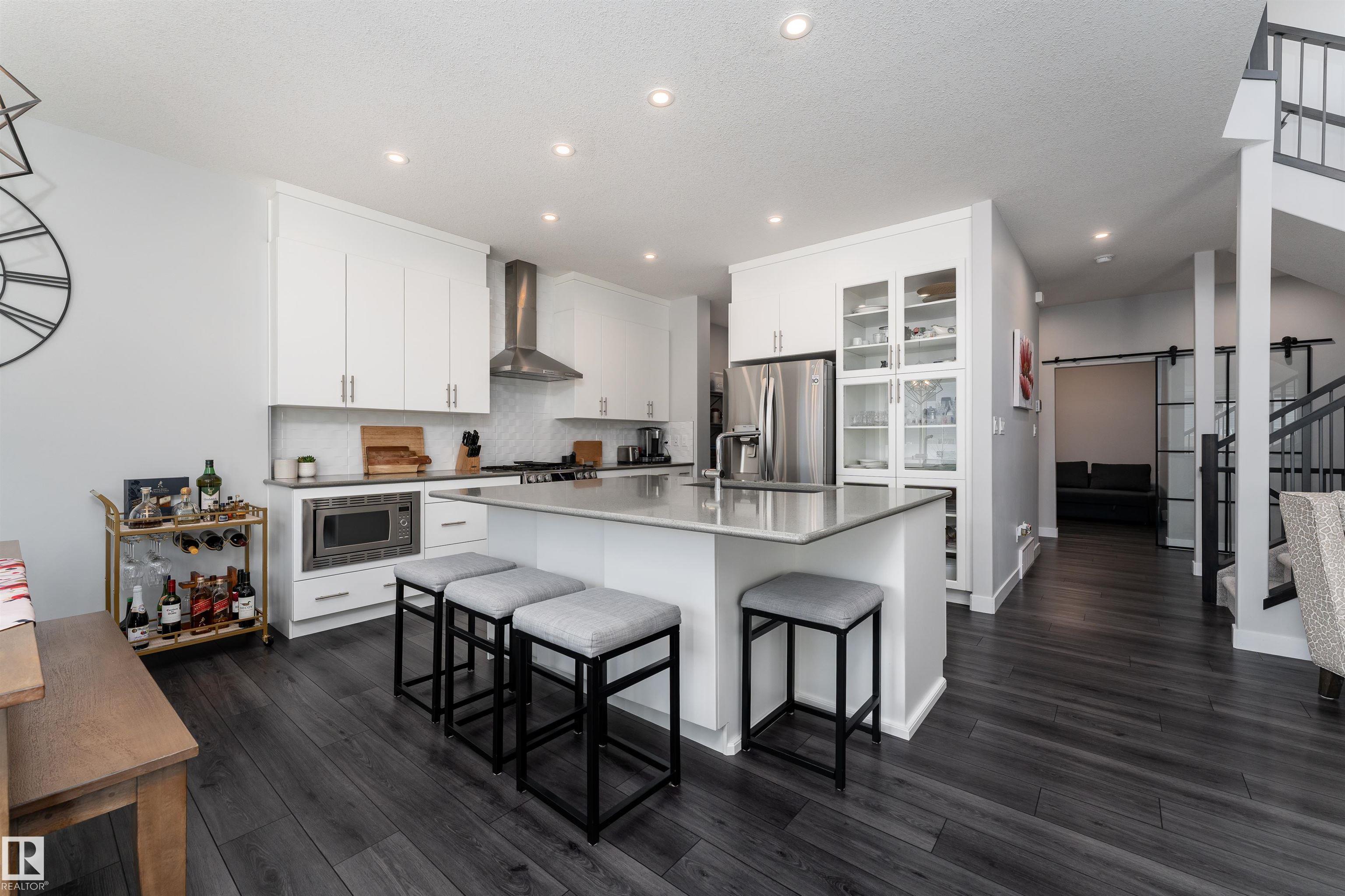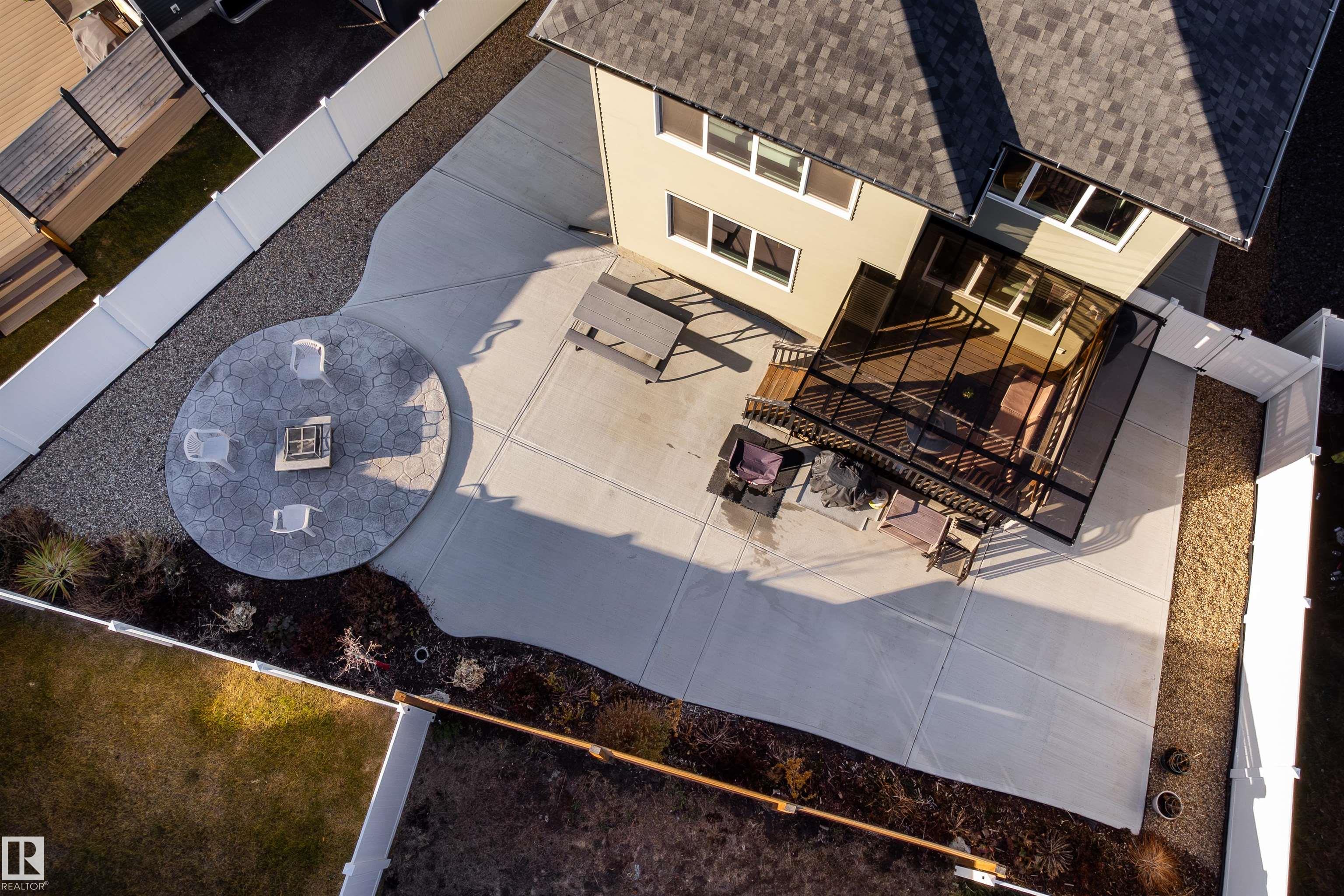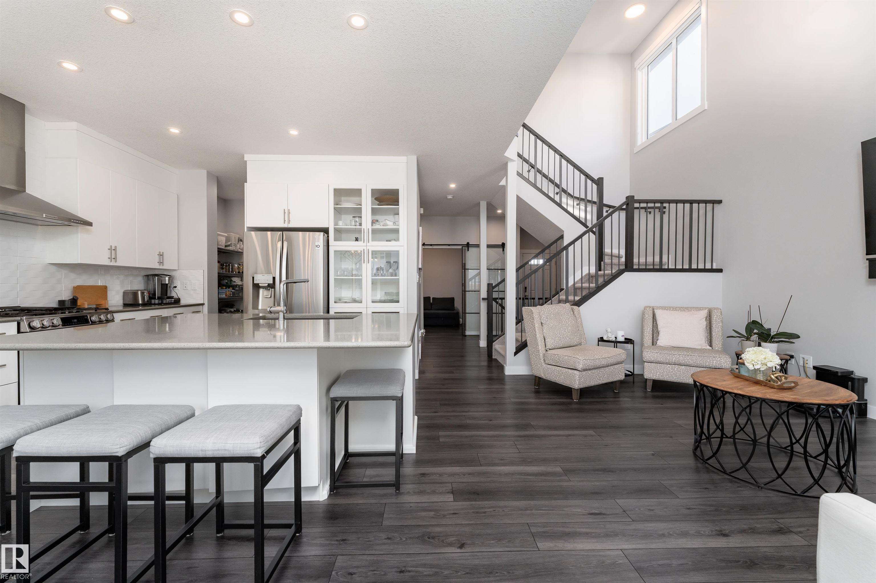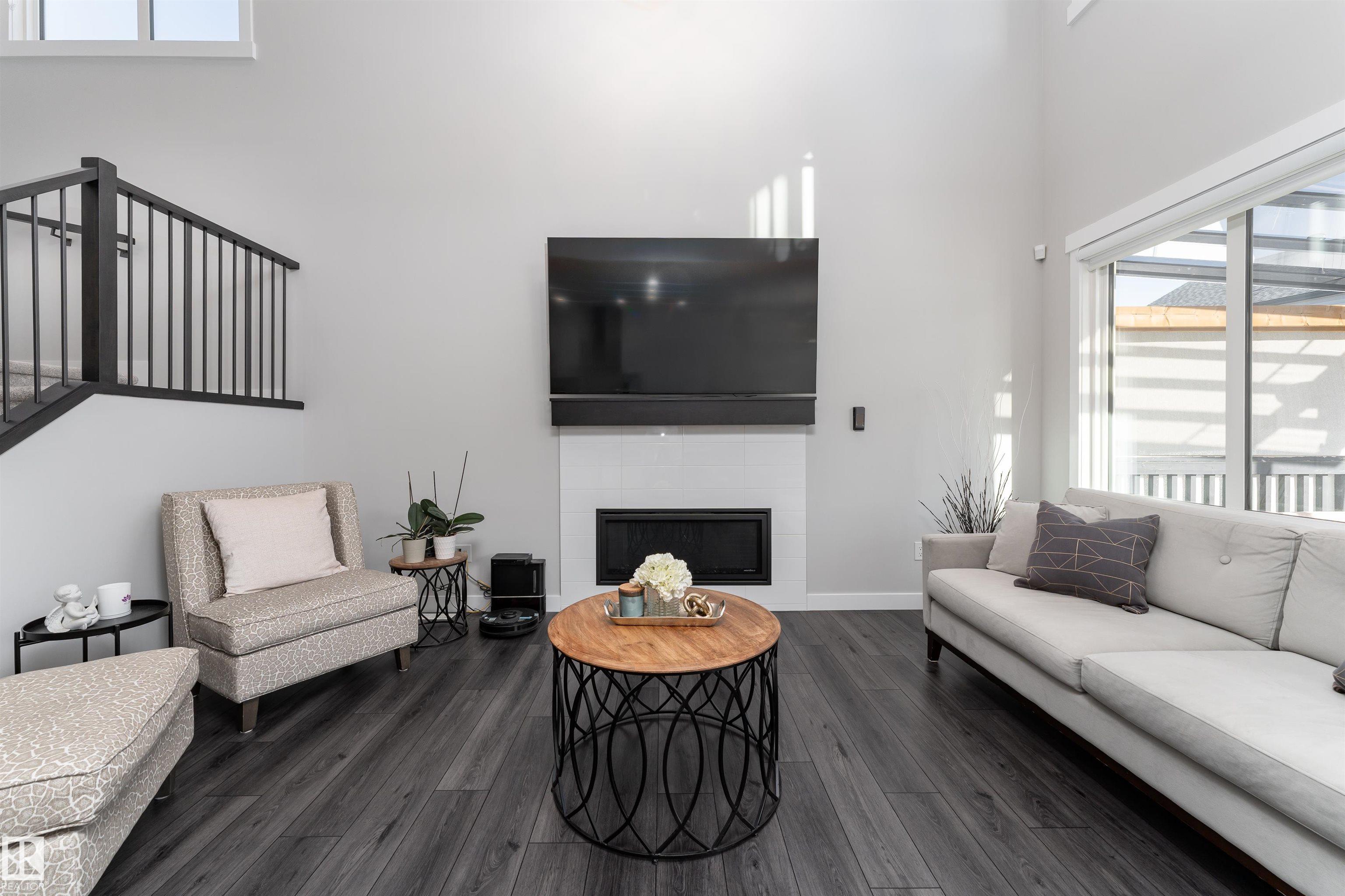 Move-in ready Coventry-built home offering upgraded, low-maintenance living on a quiet pie-shaped lot in a cul de sac! This stunning open-to-below floor plan features 3 bedrooms+den, 2.5 bathrooms, a cozy bonus room overlooking the living room, convenient upstairs laundry w/ sink & double-attached garage. The bright living room impresses w/ soaring ceilings, gas fireplace & is beautifully accented by upgraded railings. Chef's kitchen offers a massive island w/ extra storage, s/s appliances, gas stove, built-in wall oven & microwave, & glass cabinetry. The spacious primary retreat includes a sitting area, walk-in closet & spa-like ensuite w/ dual sinks, soaker tub & large shower. Enjoy countless upgrades: full concrete landscaped yard, finished stairs to the dbasement w/ rough-ins for bar & bath, 9ft ceilings on main & basement, fire pit, deck w/ glass cover, bench & organizers in mudroom, epoxy garage floors, water softener, tankless hot water & A/C. Convenient access to Anthony Henday & many amenities!