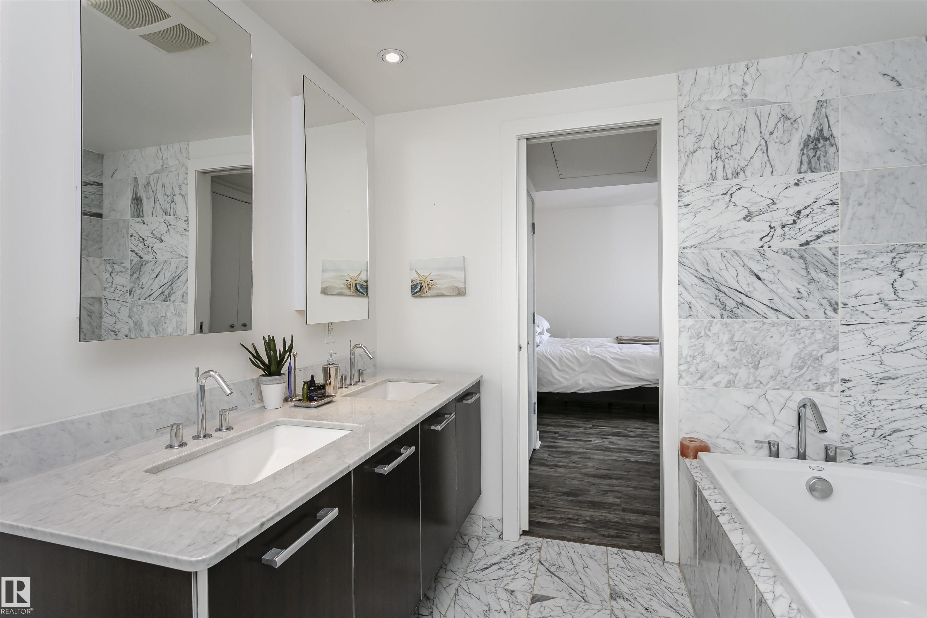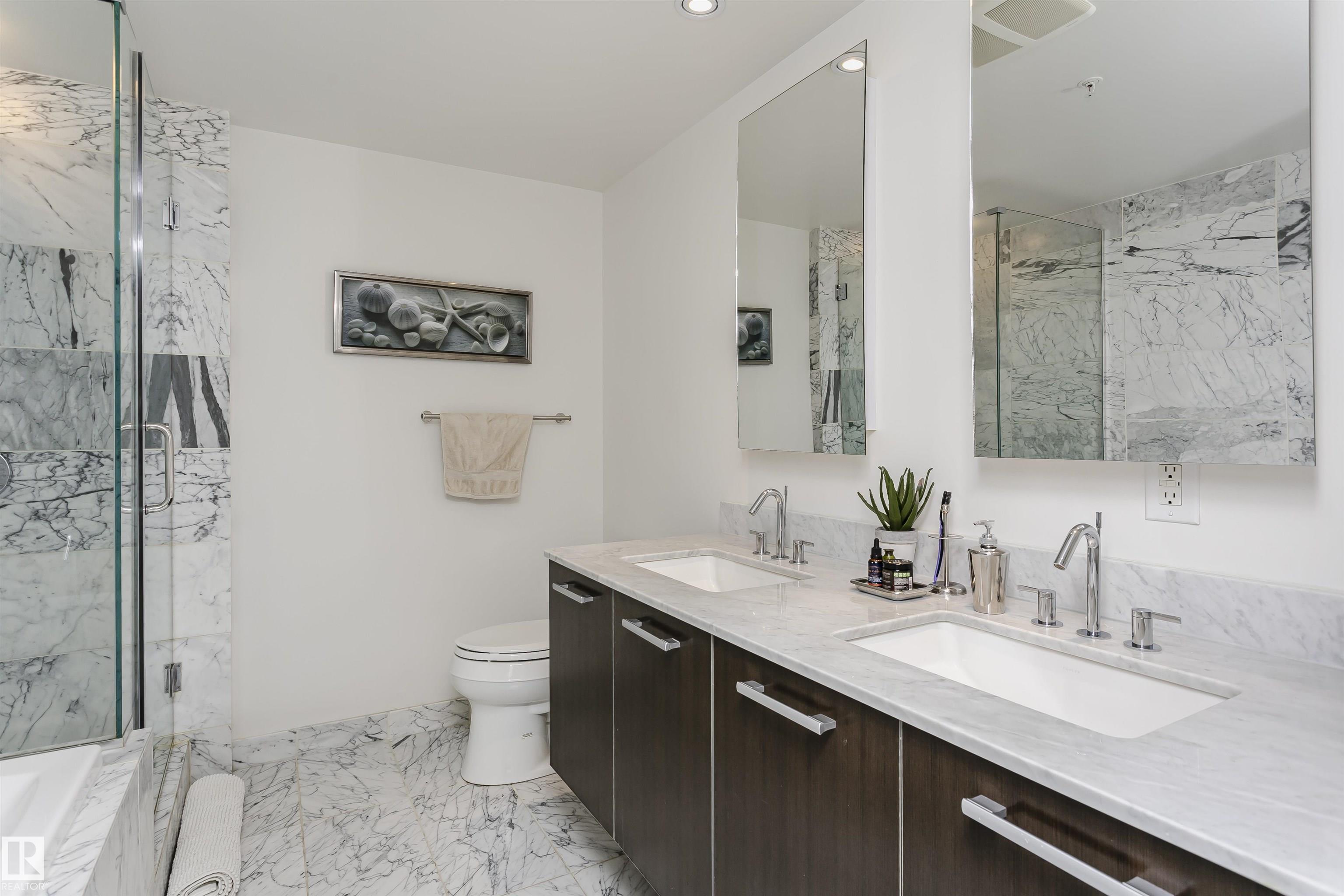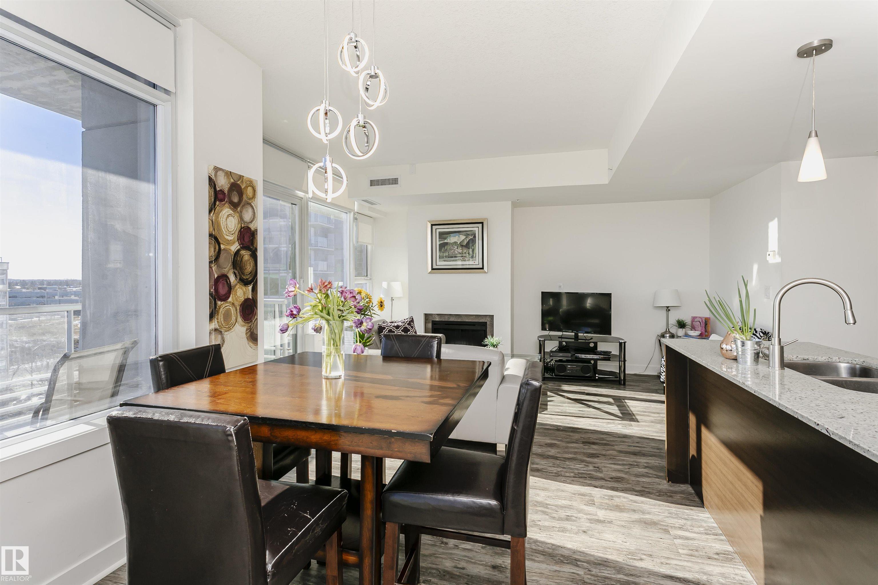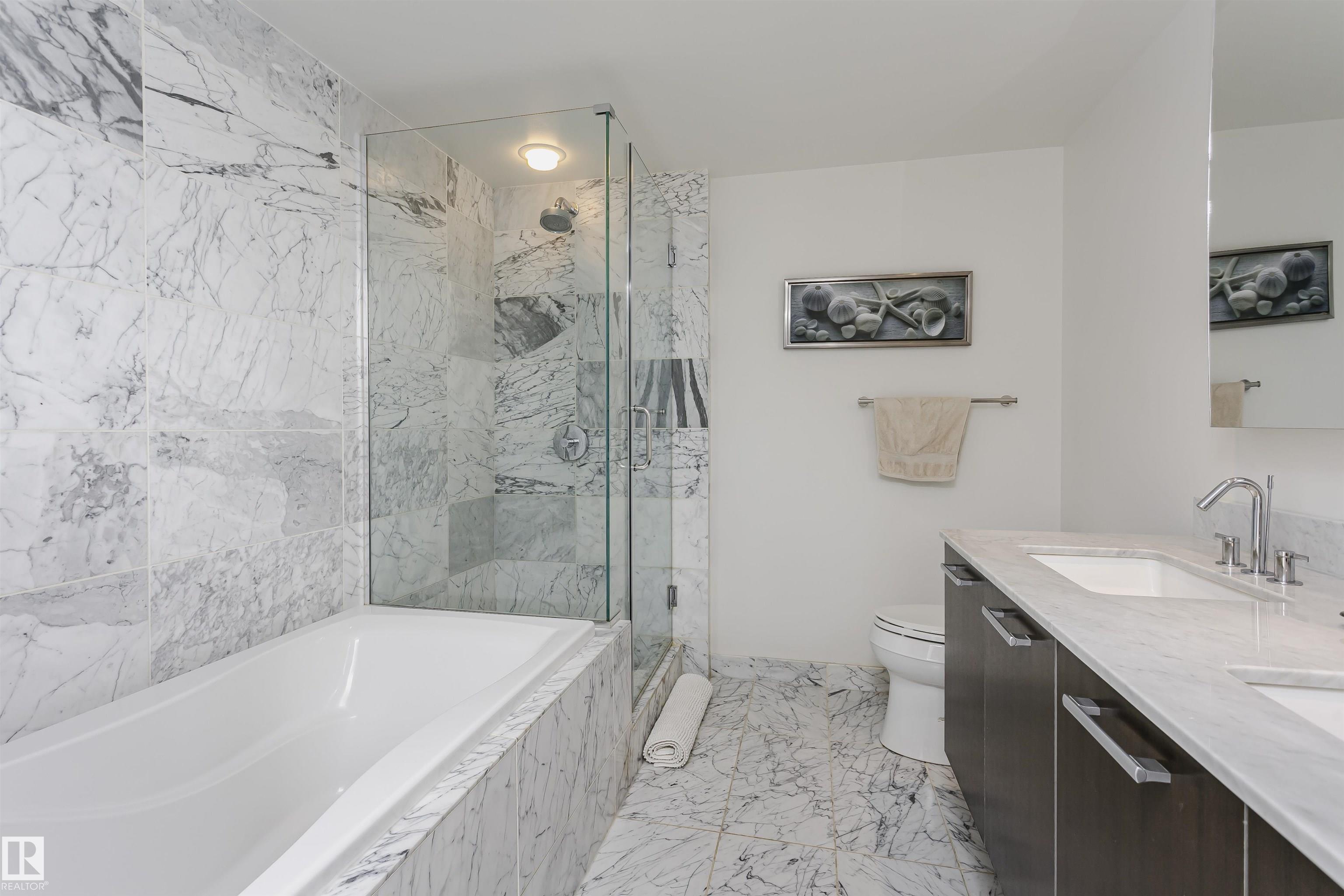 Gorgeous 2-bed, 2-bath south-west facing corner unit in a CONCRETE/STEEL building offering low-maintenance living and impressive quality throughout. Step inside to a bright open-concept layout filled with natural light. The chef's kitchen features stainless steel appliances, a gas countertop range with drawers, granite countertops, pendant lighting, and a large island. Vinyl flooring flows throughout the suite, while the living room is highlighted by an electric fireplace and patio doors leading to a spacious balcony. The primary bedroom is generously sized with two closets and a spa-inspired 5-piece ensuite complete with soaker tub, separate glass shower, double sinks, and marble tile. The second bedroom is equally spacious with a 4-piece bathroom just steps away. Additional features include secure floor access, in-suite laundry, titled heated underground parking, titled storage cage, visitor parking, and a fitness centre. Exceptional location within walking distance to all amenities and Century Park!
