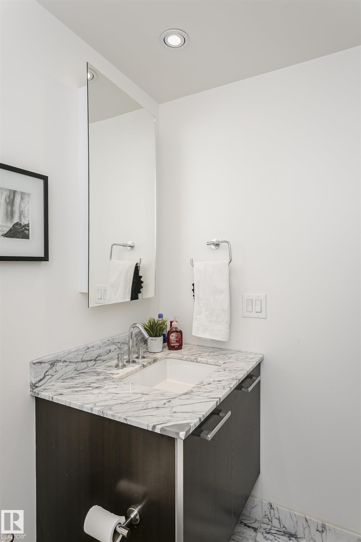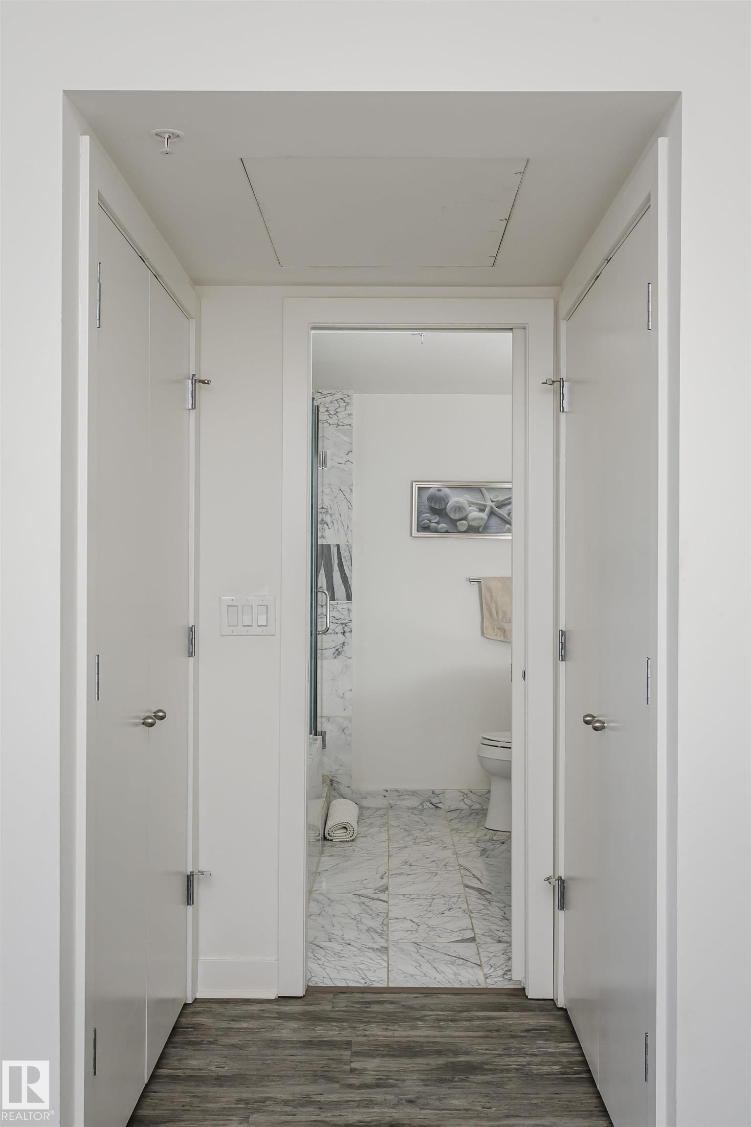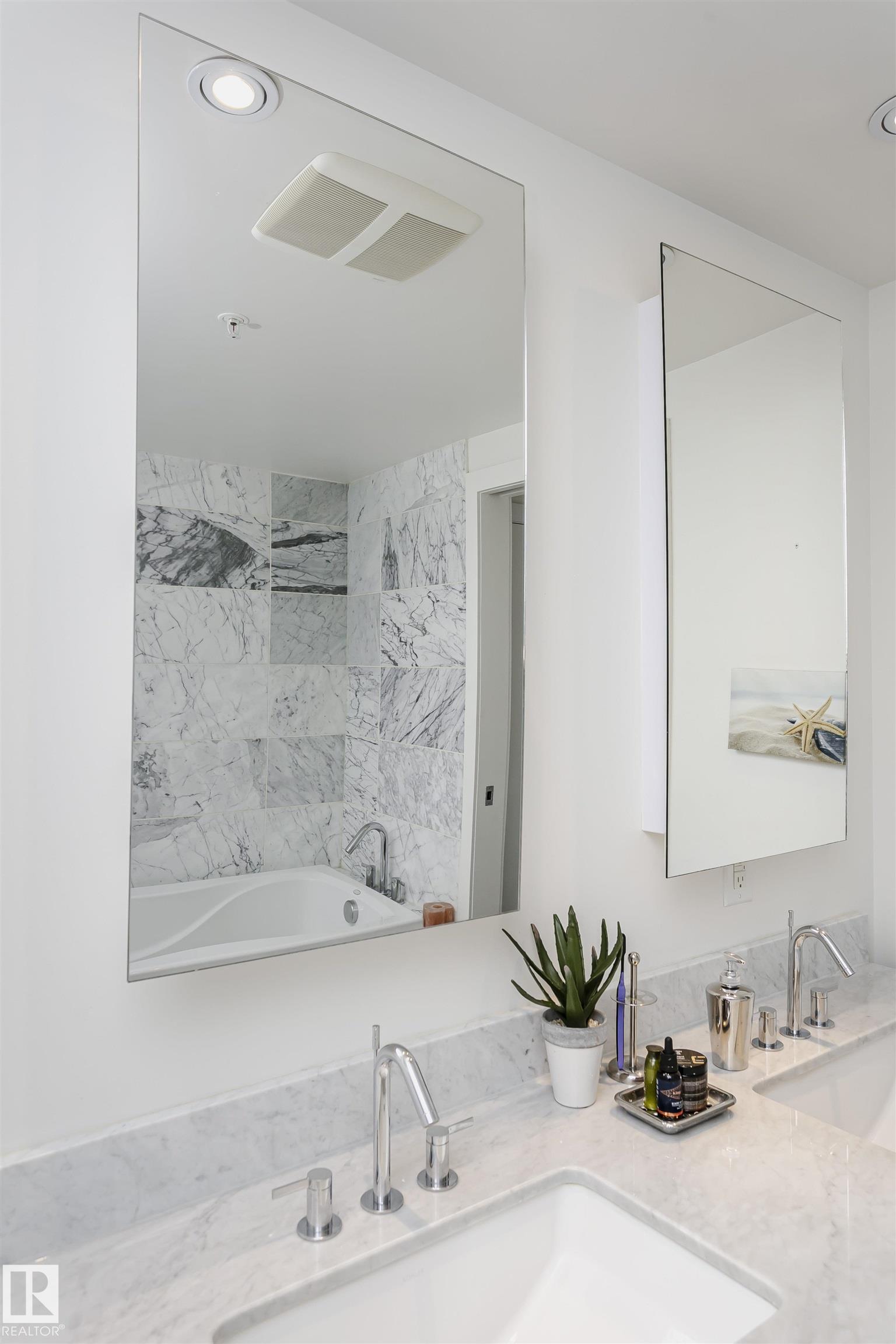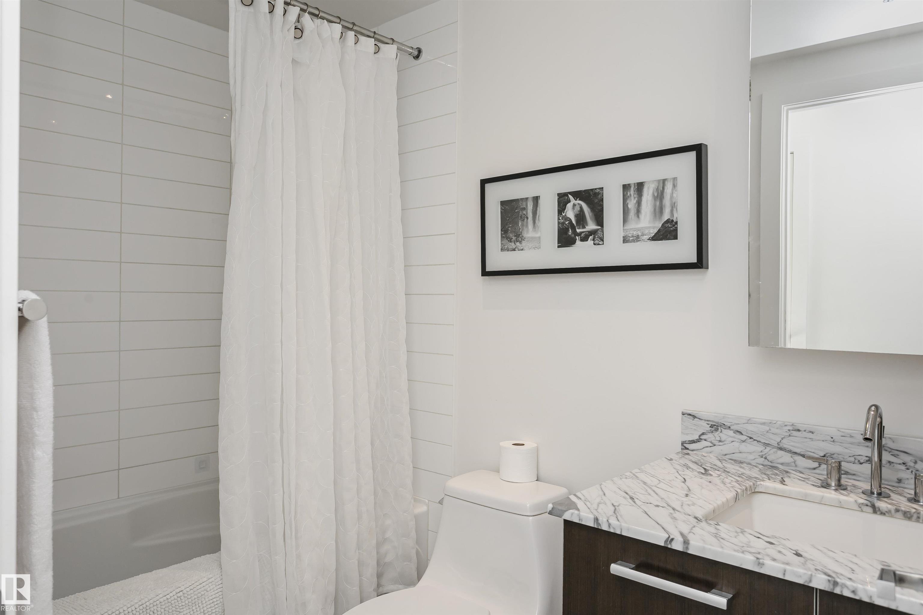 Gorgeous 2-bed, 2-bath south-west facing corner unit in a CONCRETE/STEEL building offering low-maintenance living and impressive quality throughout. Step inside to a bright open-concept layout filled with natural light. The chef's kitchen features stainless steel appliances, a gas countertop range with drawers, granite countertops, pendant lighting, and a large island. Vinyl flooring flows throughout the suite, while the living room is highlighted by an electric fireplace and patio doors leading to a spacious balcony. The primary bedroom is generously sized with two closets and a spa-inspired 5-piece ensuite complete with soaker tub, separate glass shower, double sinks, and marble tile. The second bedroom is equally spacious with a 4-piece bathroom just steps away. Additional features include secure floor access, in-suite laundry, titled heated underground parking, titled storage cage, visitor parking, and a fitness centre. Exceptional location within walking distance to all amenities and Century Park!