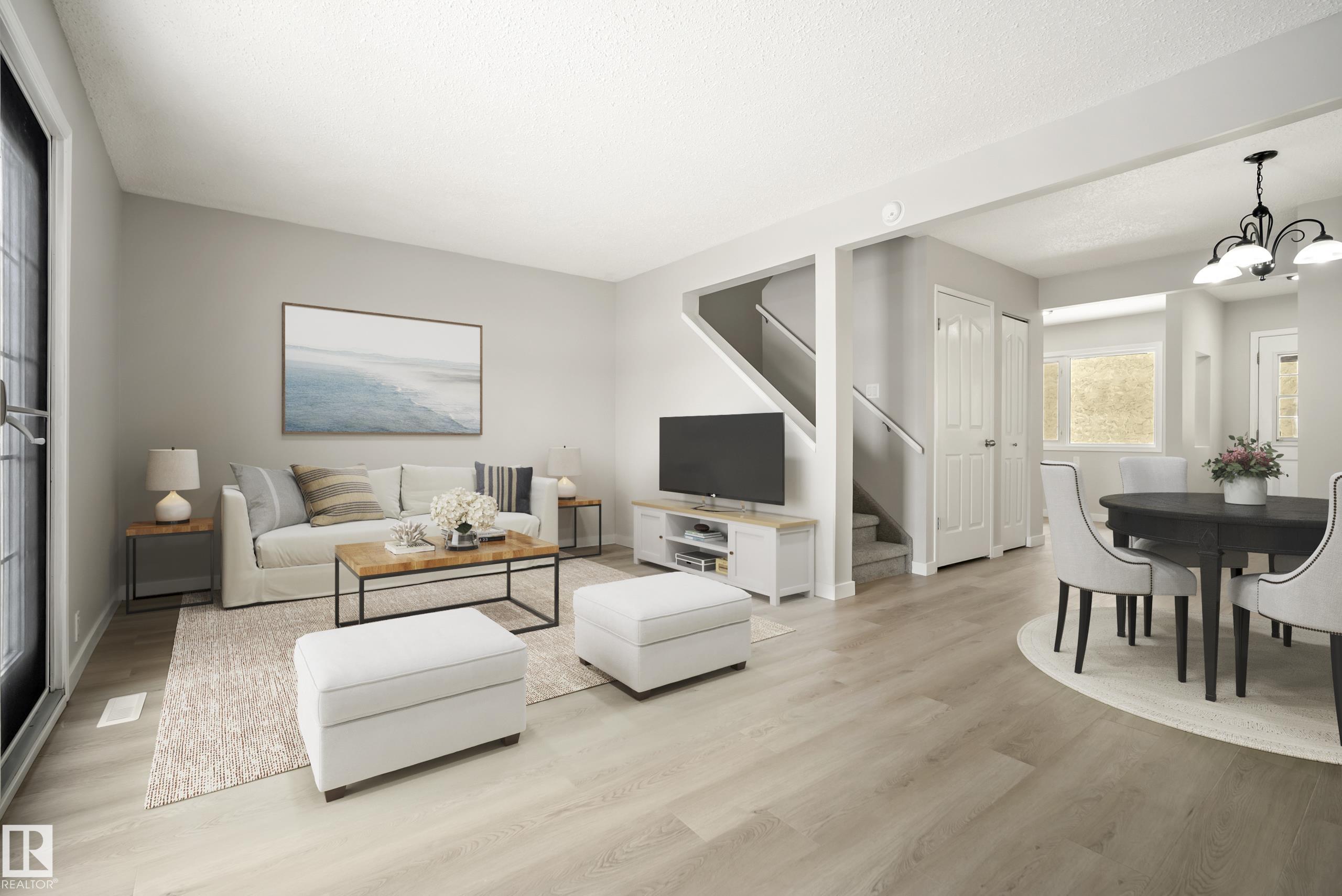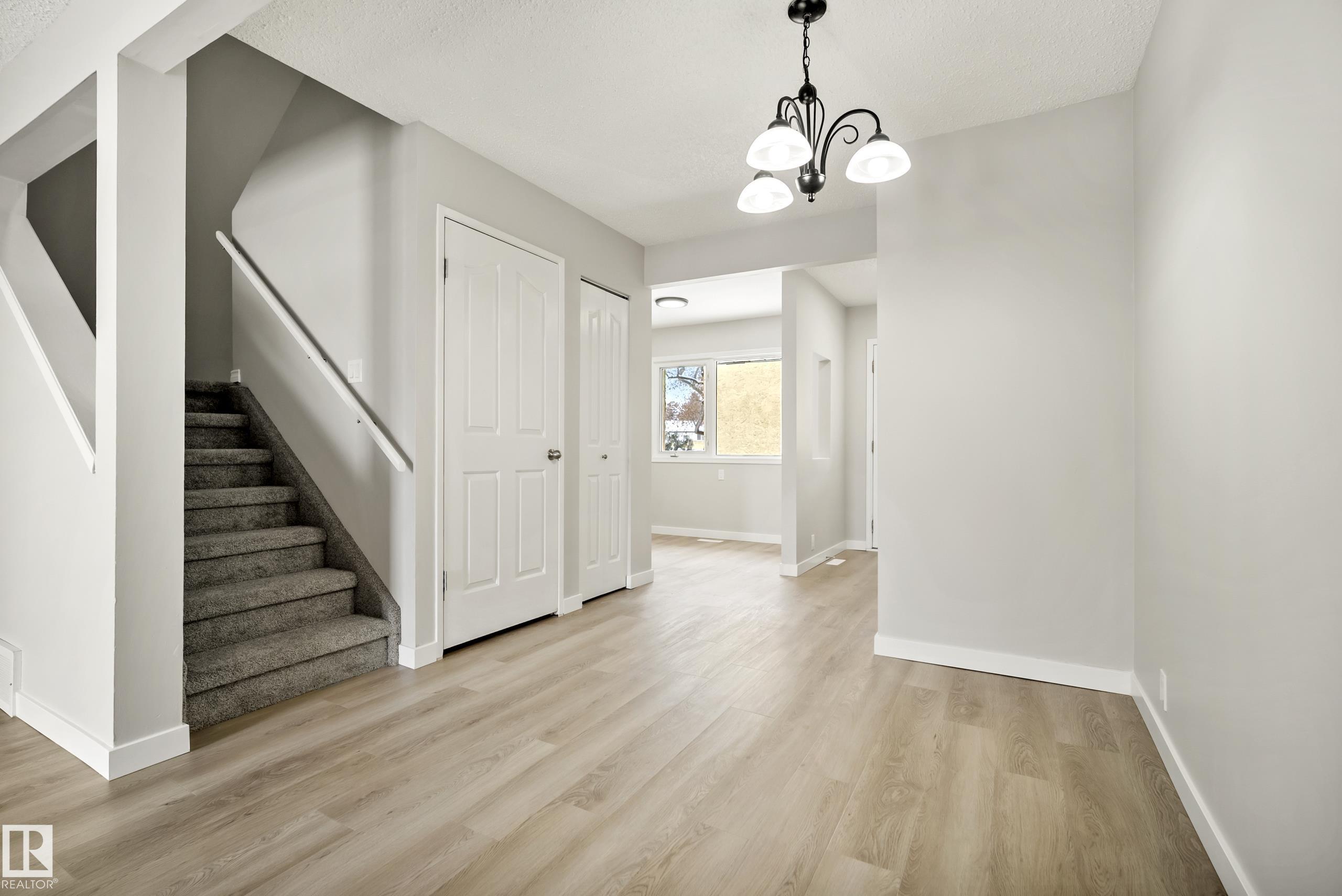 Move-in ready! Beautifully updated 3-bedroom, 1.5-bathroom home offering a bright and functional layout in a convenient location. The main floor features new vinyl plank flooring, fresh paint, new light fixtures, and a stunning renovated kitchen with quartz countertops, white cabinetry, and stainless steel appliances. A newly updated 2-piece bathroom completes the main level. Upstairs you'll find three well-sized bedrooms with durable hard surface flooring throughout. The fully finished basement adds valuable living space with a large rec room, laundry area, and plenty of storage. Enjoy the spacious, fully fenced backyard, perfect for relaxing or entertaining. Includes an assigned parking stall. Ideally located just steps to public transit, schools, and everyday amenities, with quick access to Victoria Trail, Yellowhead Trail, and Anthony Henday Drive. (Some photos have been virtually staged with furniture)