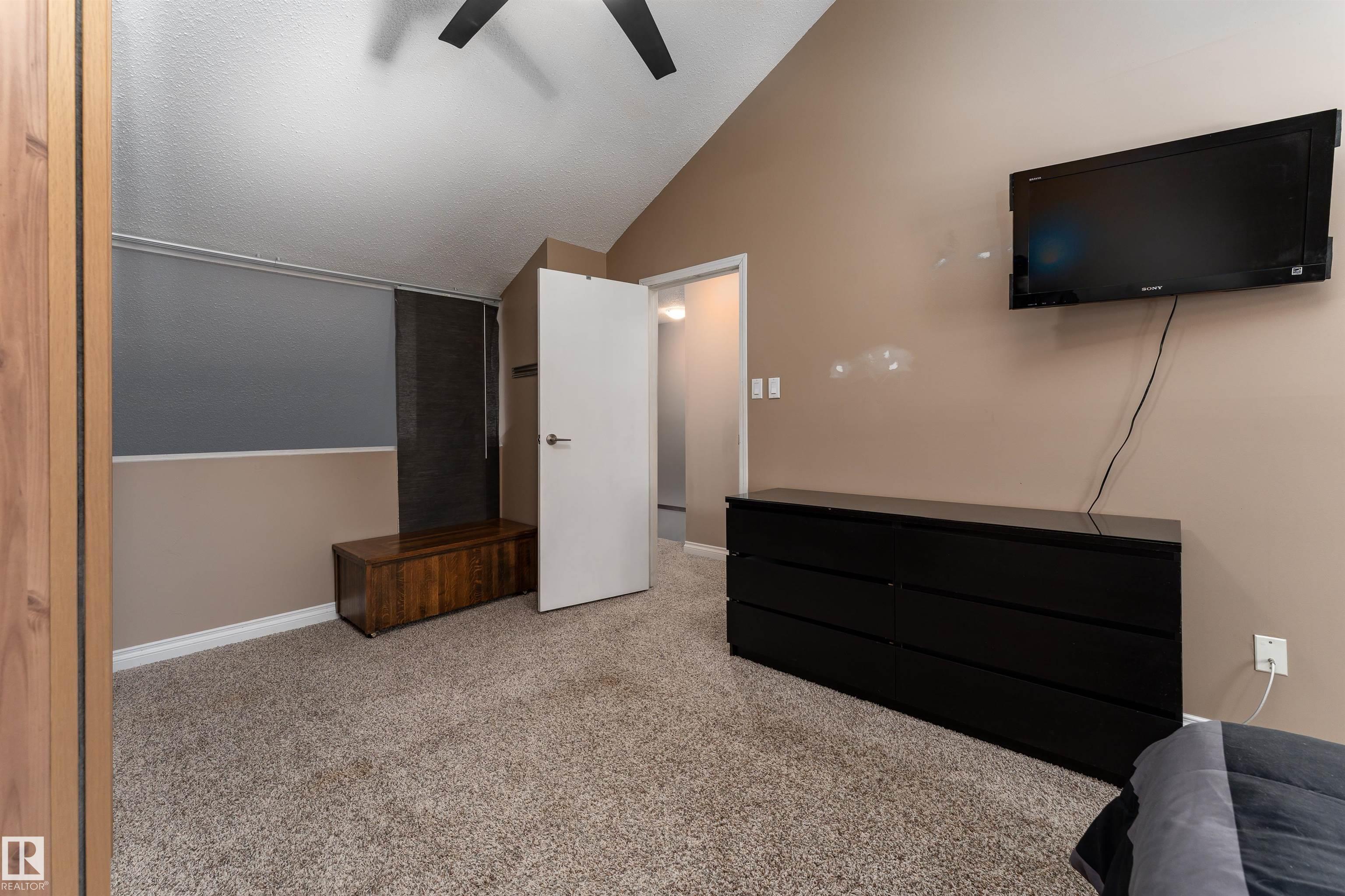 Stop searching and start packing because this uniquely designed 1,222 sq. ft. Hillview Crescent gem is the one you've been waiting for! The main floor features a grand living room with high vaulted ceilings and a cozy stone-surround wood fireplace. The modern kitchen is a dream. Designed with warm wood cabinetry, beautiful tile backsplash, dark counters, and a bright breakfast nook by the window. Hosting is a breeze in the large dining room, while neutral-toned flooring and a 2-pc bath complete the level. Upstairs, the open-to-below design enhances the space, leading to a massive primary suite with vaulted ceilings and an attached flex room, a second generous bedroom with cozy carpeting. The partially finished basement has a full bath, laundry room, and 3rd bedroom. Outside, enjoy the private deck and west-facing yard for afternoon sun. Complete with 2 assigned parking stalls, and close proximity to schools and shopping. Your perfect home awaits! (Furnace replaced in 2025).