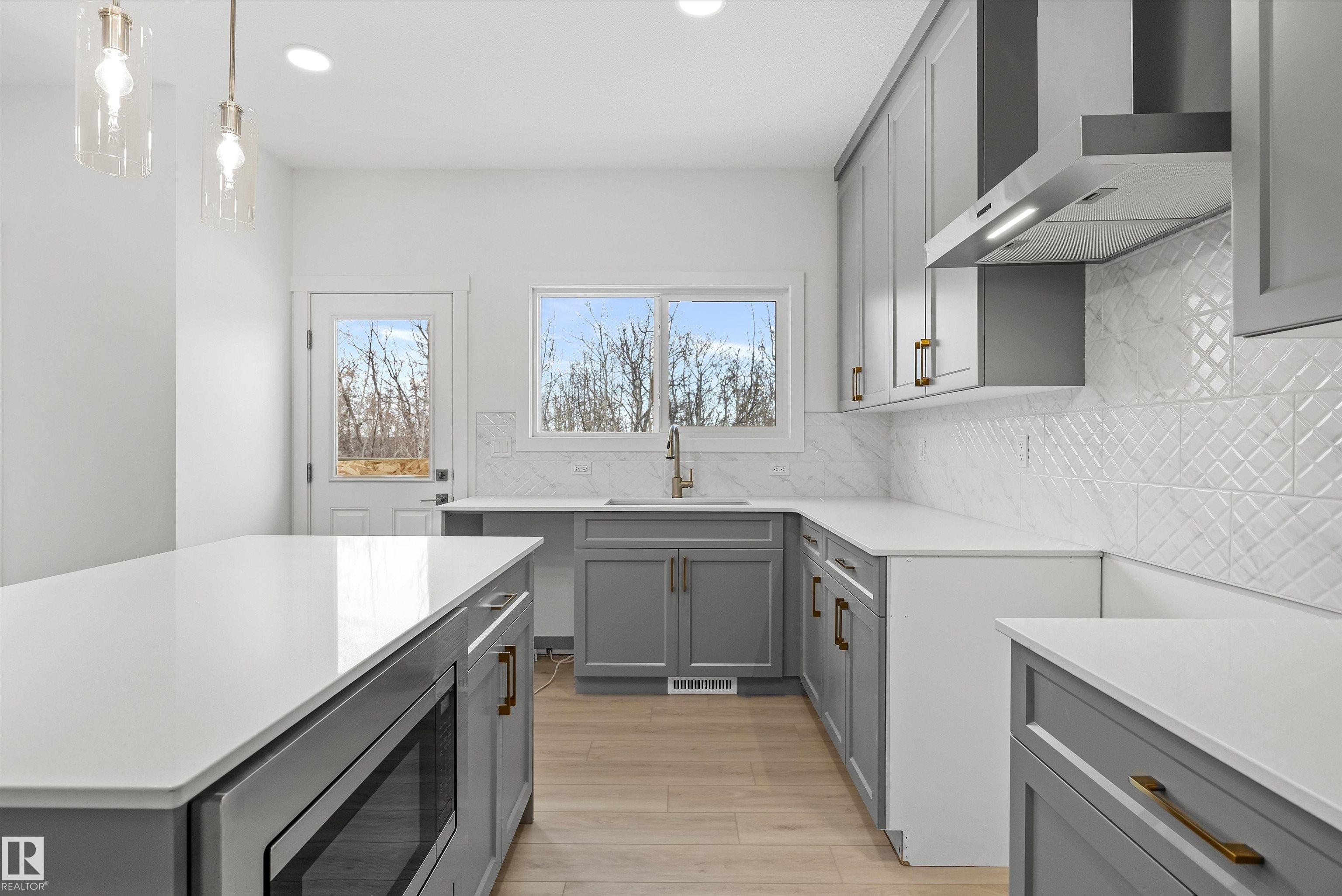 Built by Sterling Homes, this front-attached home in Lakeview offers bright, modern living with a family-friendly layout. Triple-pane windows and 9' ceilings enhance the open main floor, where a welcoming foyer leads to a stylish kitchen with quartz counters, a large island, ceiling-height cabinetry, chimney hood fan, built-in microwave, and walk-through pantry to the mudroom. The great room features an electric fireplace and large rear windows, with patio doors off the dining nook. A half bath and built-in bench add convenience. Upstairs includes a spacious primary suite with walk-in closet and 3-piece ensuite, bonus room, full bath, laundry, and two bedrooms. LVP flooring, upgraded railings, side entrance, double garage with drain, and basement rough-ins complete this practical, stylish home.
