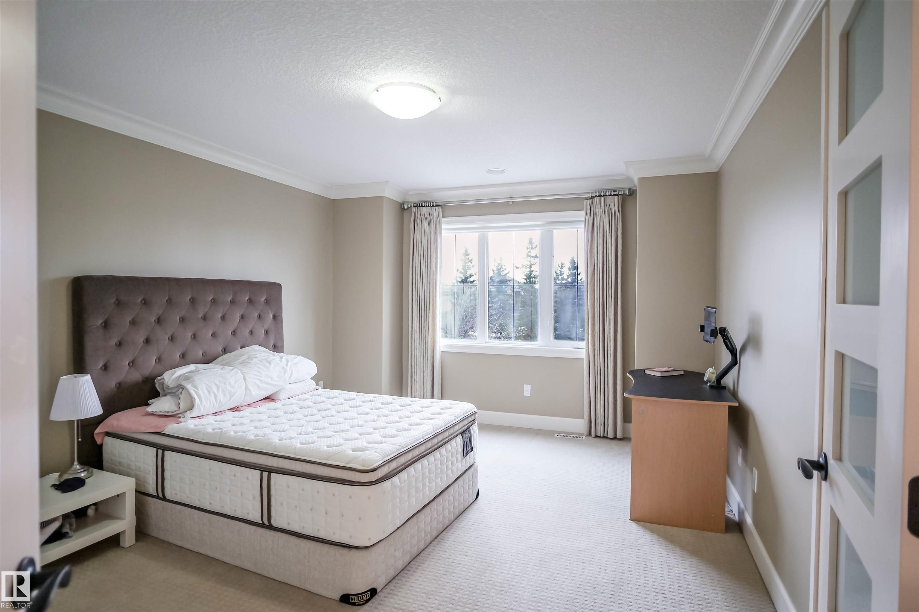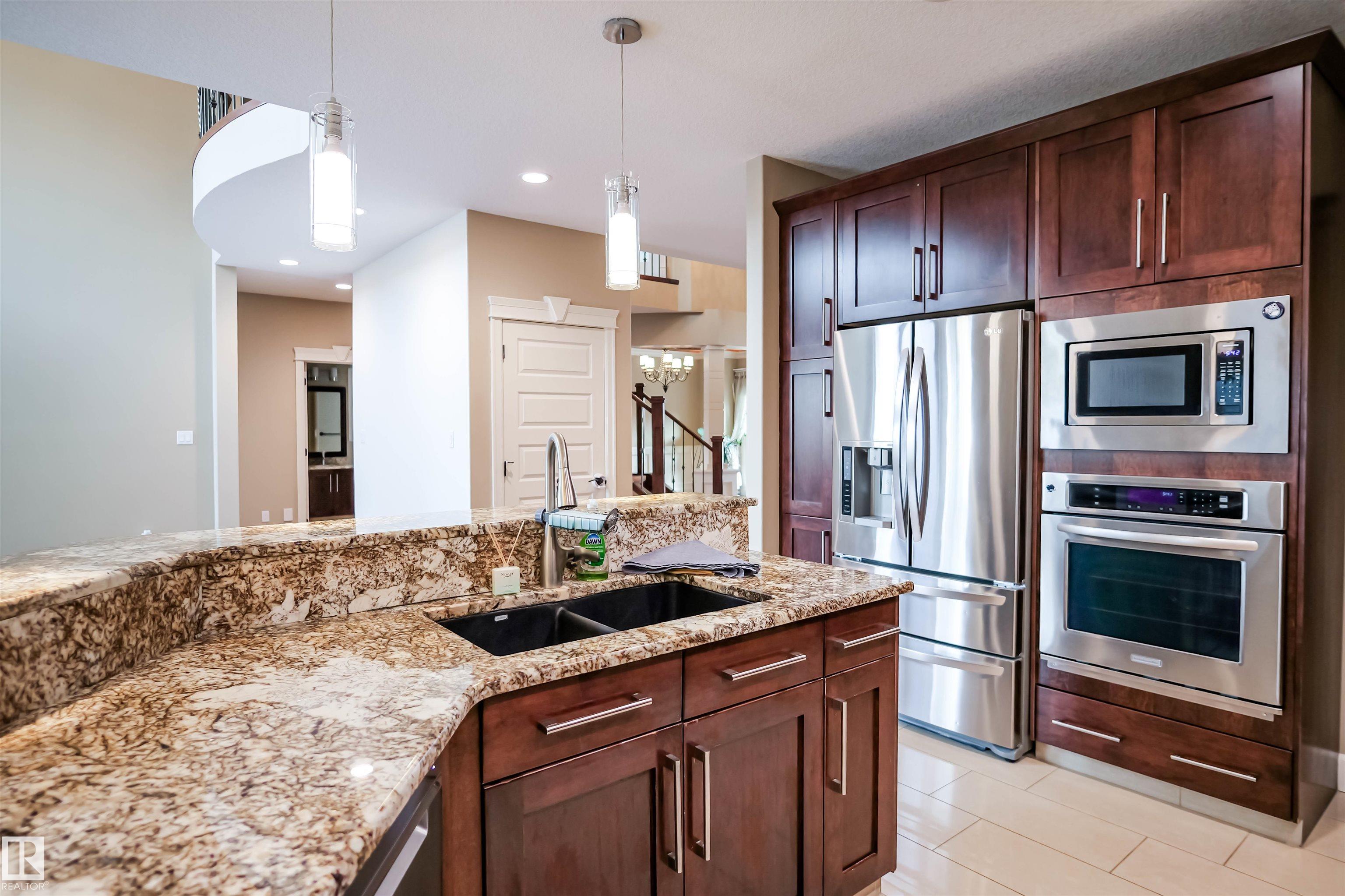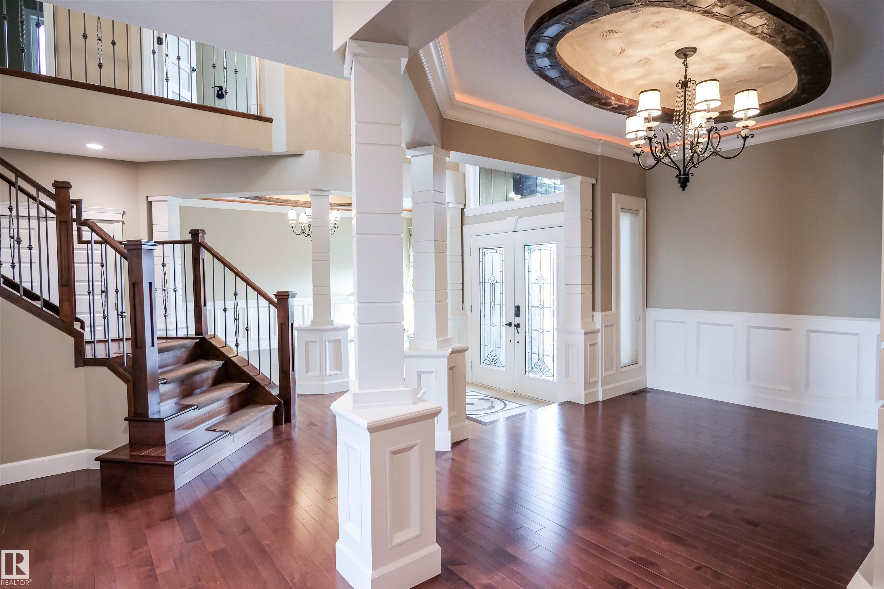 Sunny with stunning water view at Mactaggart! This FAMILY HOME offers 3 levels of upscale living, a TRIPLE garage, and a fenced yard in one of Edmonton's most prestigious communities. Step inside to soaring 24' coffered ceilings, grand double doors, and high-end finishes throughout. The gourmet kitchen features built-in appliances, granite countertops, a massive island, and a separate spice kitchen. Enjoy breathtaking views from the family room, highlighted by a statement fireplace and large windows. Main floor includes a bedroom and full 4pc bath, ideal for guests or extended family. Upstairs offers 4 spacious bedrooms and 3 full baths. The primary retreat boasts a private balcony, fireplace, and spa-inspired 6pc ensuite with walk-in closet. The professionally finished basement features HEATED FLOORS, 2 additional bedrooms, a theatre room wired for 7.1 surround sound, wet bar, wine room, gym area, and full bath. Exceptional design property with Direct access to scenic walking trails & parks.
