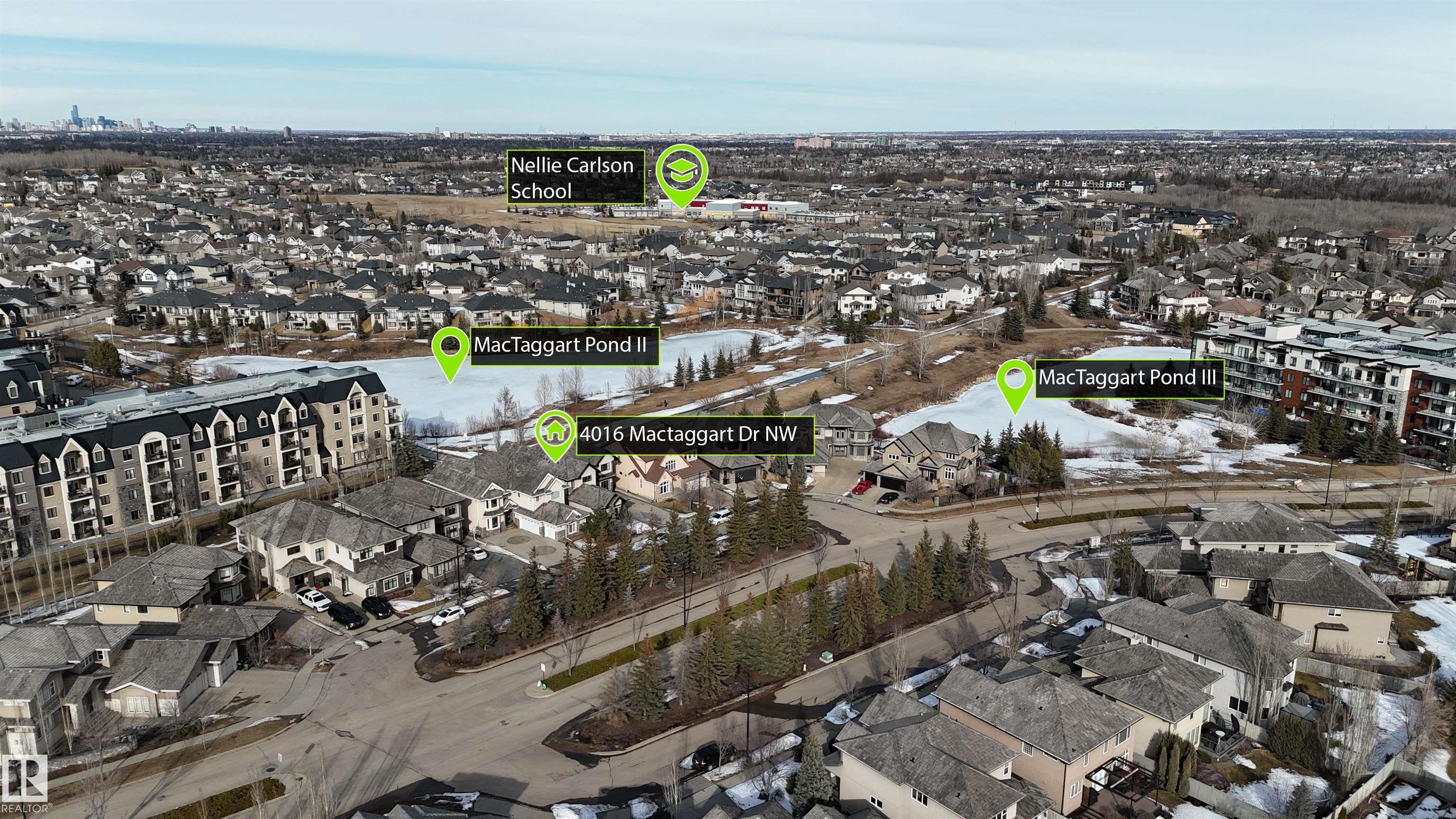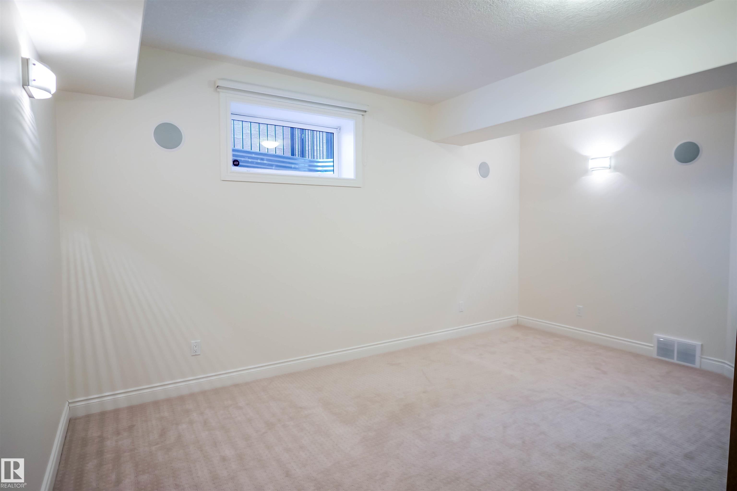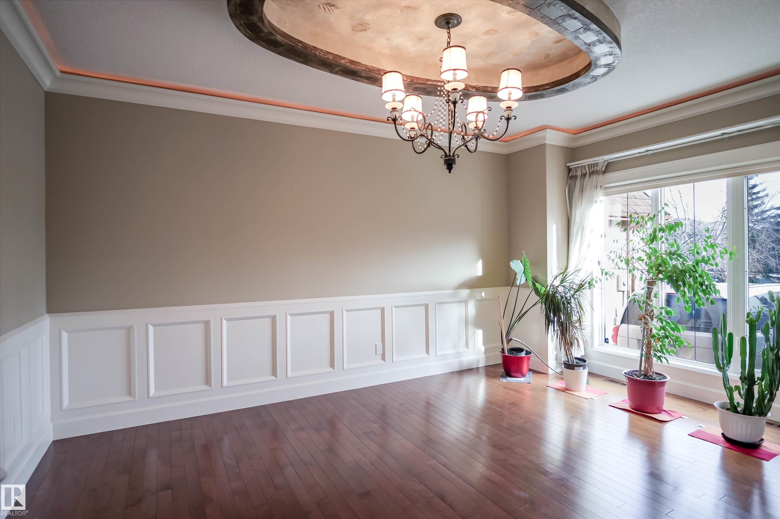 Sunny with stunning water view at Mactaggart! This FAMILY HOME offers 3 levels of upscale living, a TRIPLE garage, and a fenced yard in one of Edmonton's most prestigious communities. Step inside to soaring 24' coffered ceilings, grand double doors, and high-end finishes throughout. The gourmet kitchen features built-in appliances, granite countertops, a massive island, and a separate spice kitchen. Enjoy breathtaking views from the family room, highlighted by a statement fireplace and large windows. Main floor includes a bedroom and full 4pc bath, ideal for guests or extended family. Upstairs offers 4 spacious bedrooms and 3 full baths. The primary retreat boasts a private balcony, fireplace, and spa-inspired 6pc ensuite with walk-in closet. The professionally finished basement features HEATED FLOORS, 2 additional bedrooms, a theatre room wired for 7.1 surround sound, wet bar, wine room, gym area, and full bath. Exceptional design property with Direct access to scenic walking trails & parks.