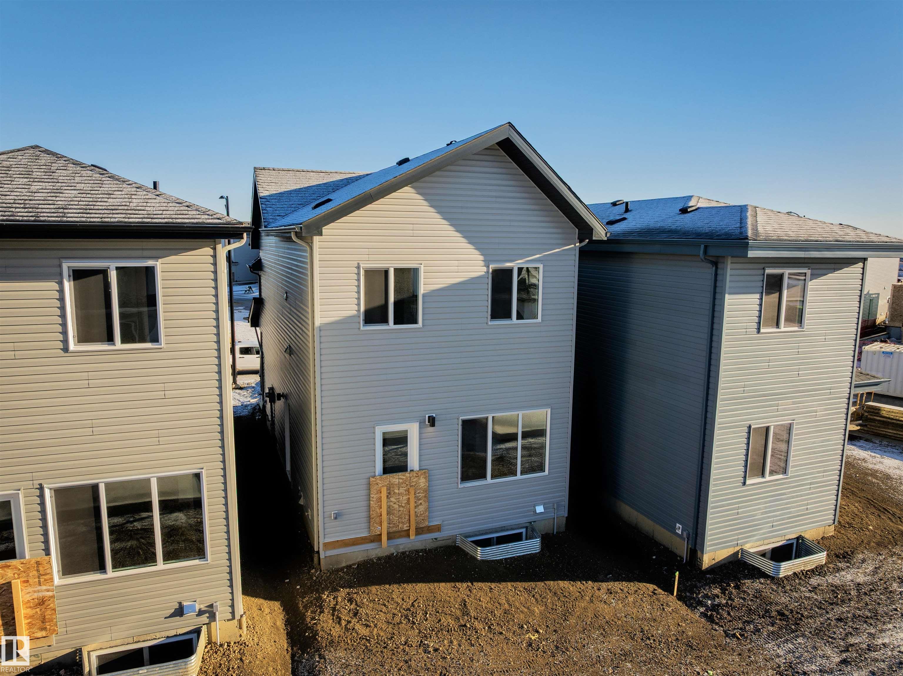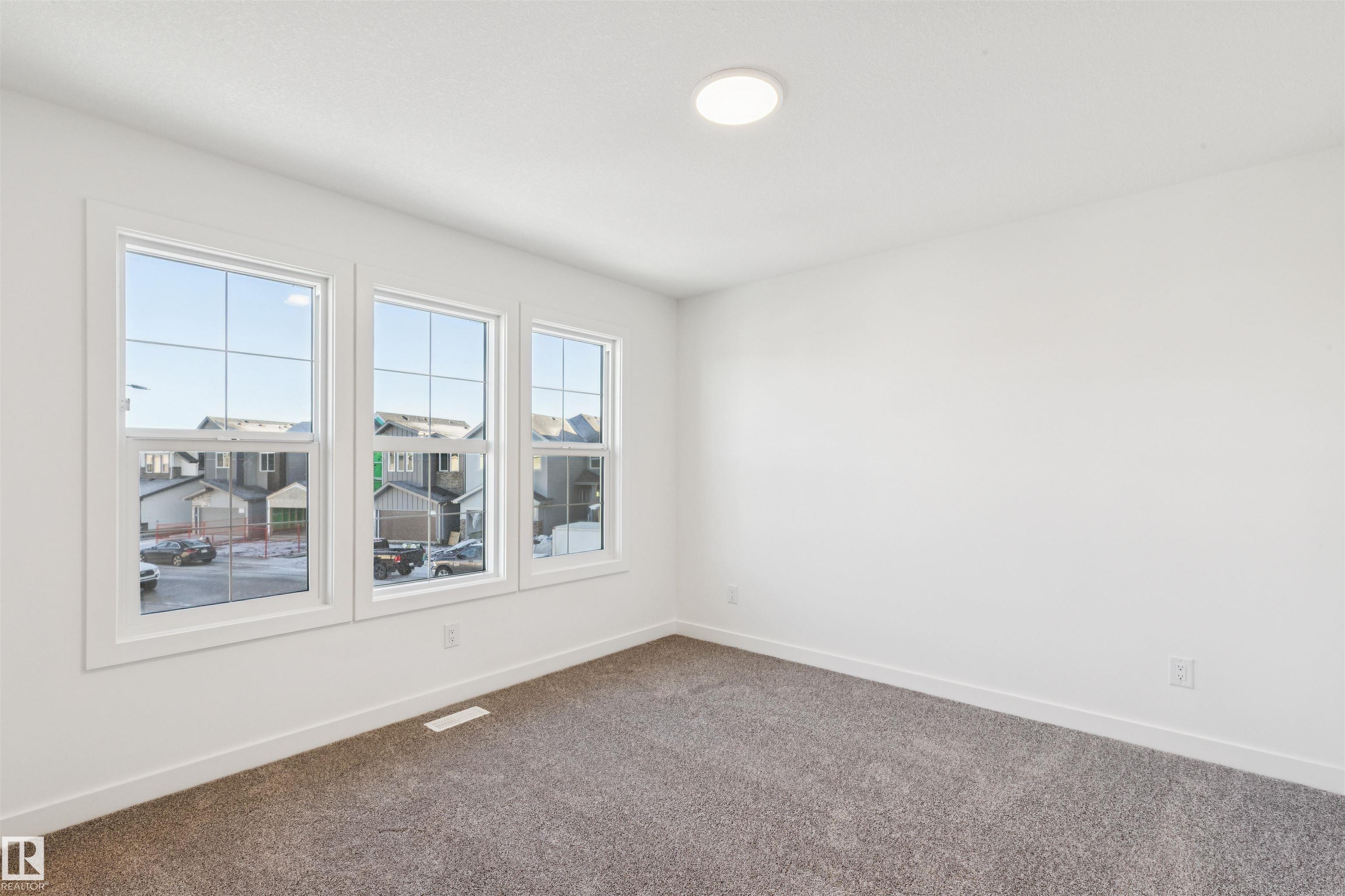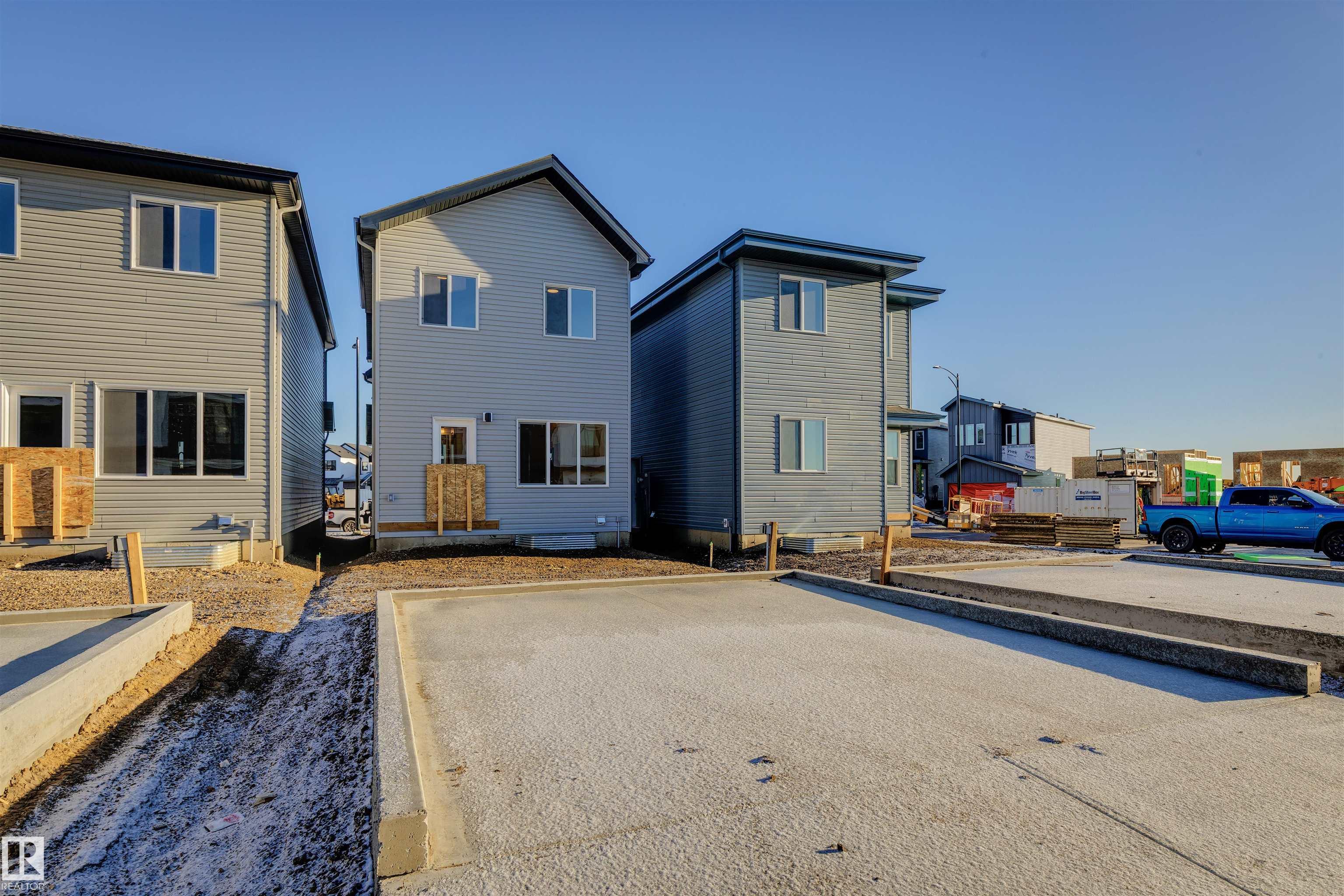 The Stellar combines modern design with everyday functionality in a bright, thoughtfully planned layout. The main floor showcases luxury vinyl plank flooring throughout, a welcoming foyer with coat closet, and a sun-filled great room framed by a large front window. At the heart of the home, the kitchen features quartz countertops, an undermount composite sink, a central island with eating ledge, profiled Thermofoil cabinetry, and a generous pantry. The rear dining area enjoys views of the backyard, while a conveniently placed powder room and back entry lead to a spacious yard and parking pad. Upstairs offers an open loft, a primary suite with walk-in closet and 3-piece ensuite with tub/shower, plus two additional bedrooms, a main 3-piece bath, and stackable laundry closet. This home includes 9' ceilings on the main and basement, a separate side entrance, basement rough-in plumbing, and upgraded brushed nickel fixtures.