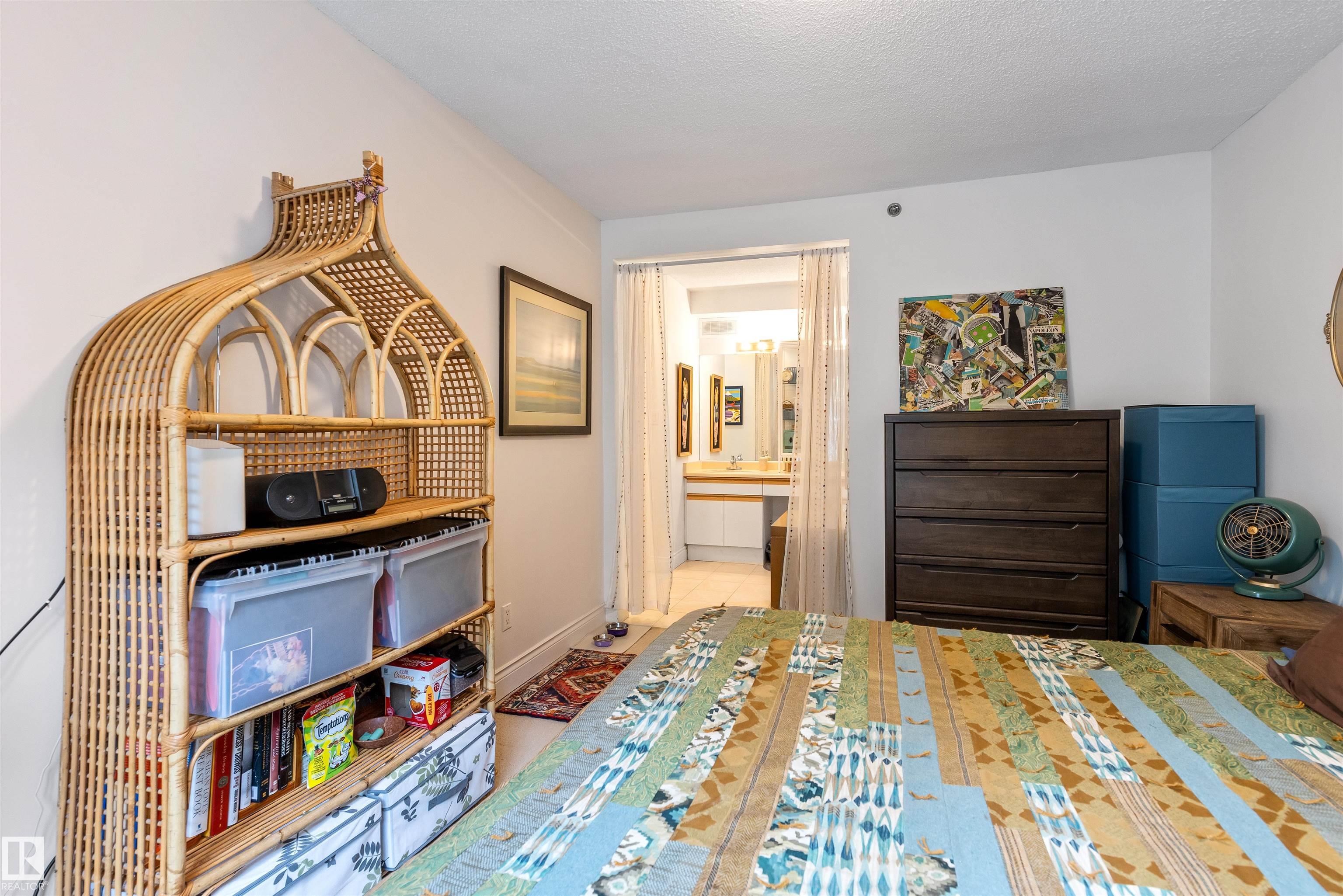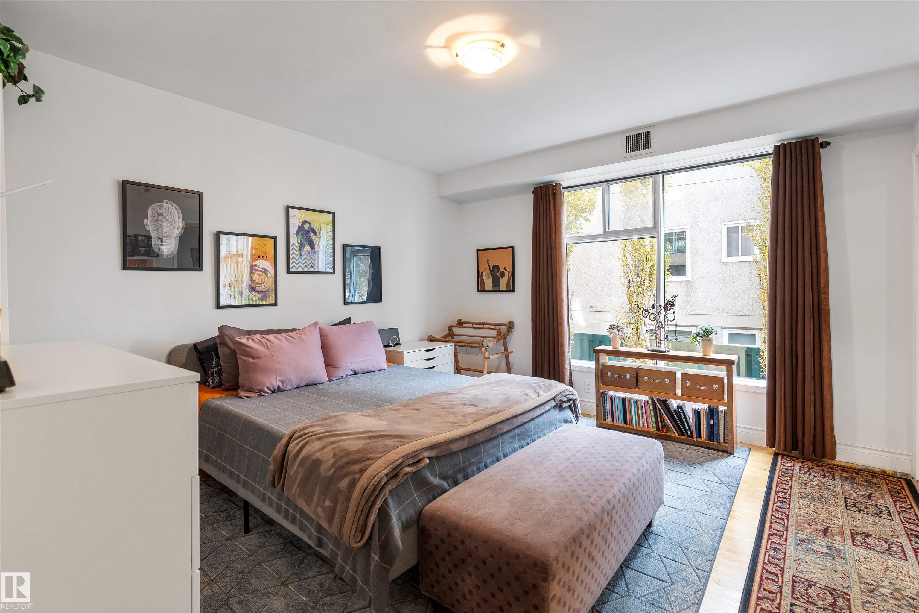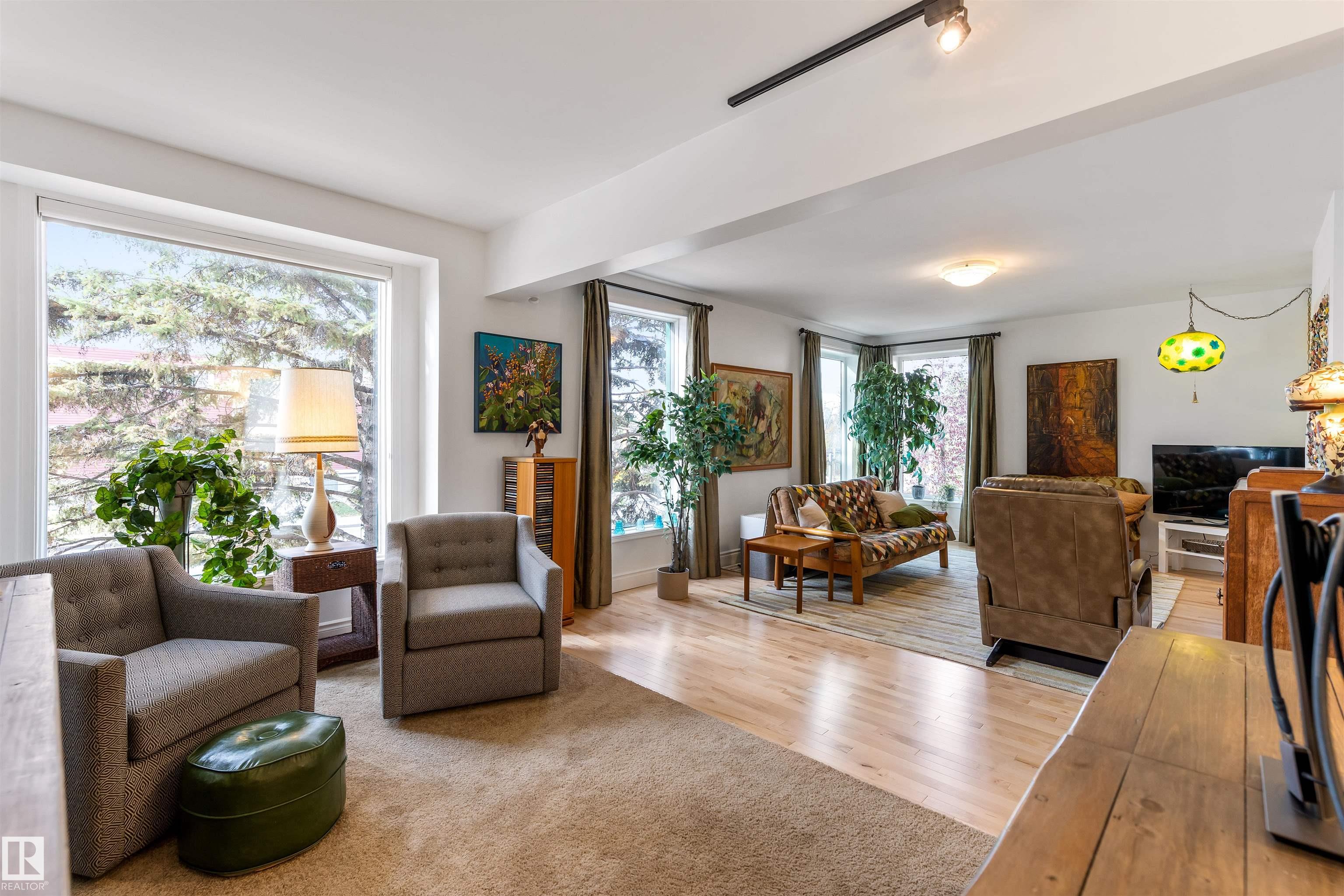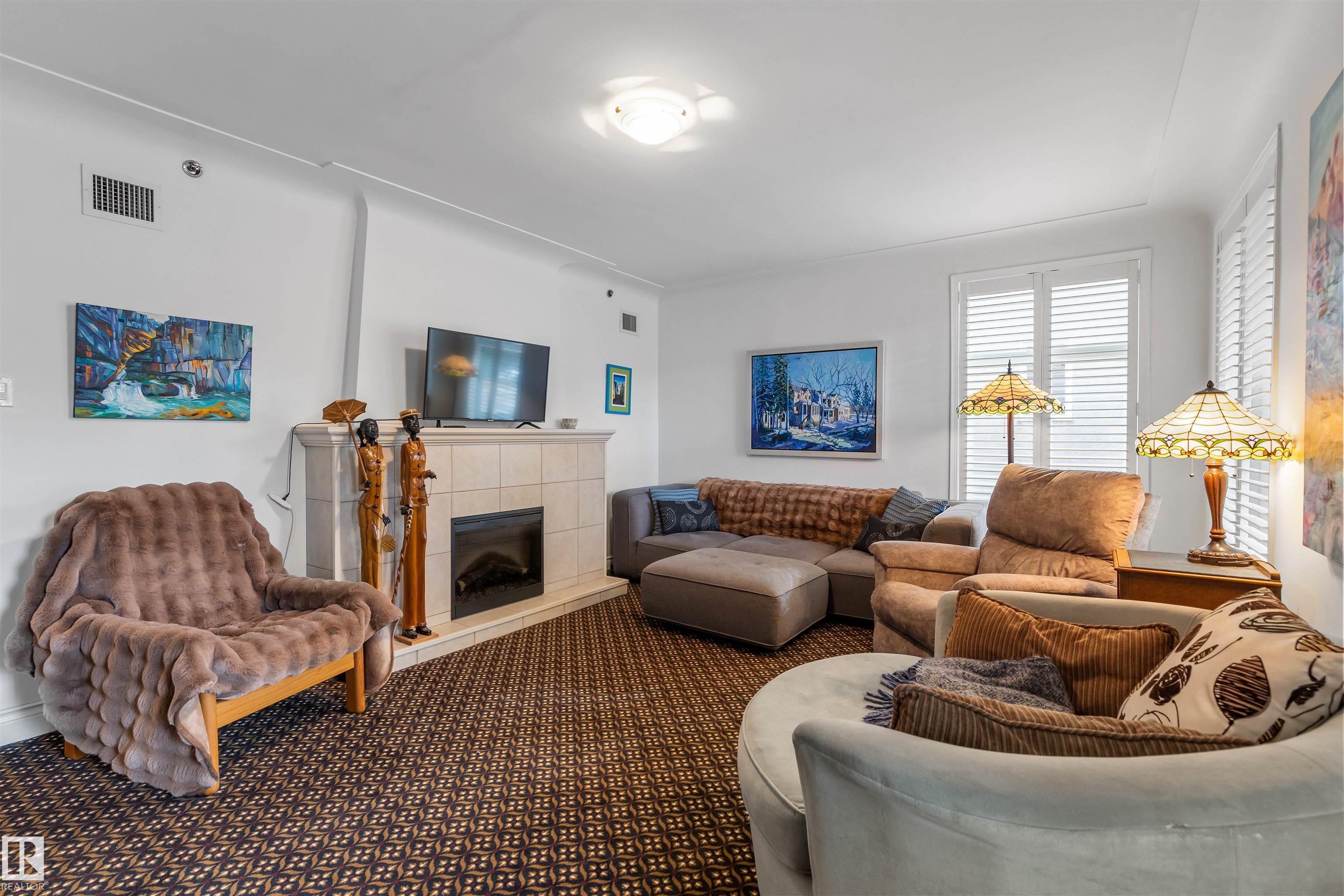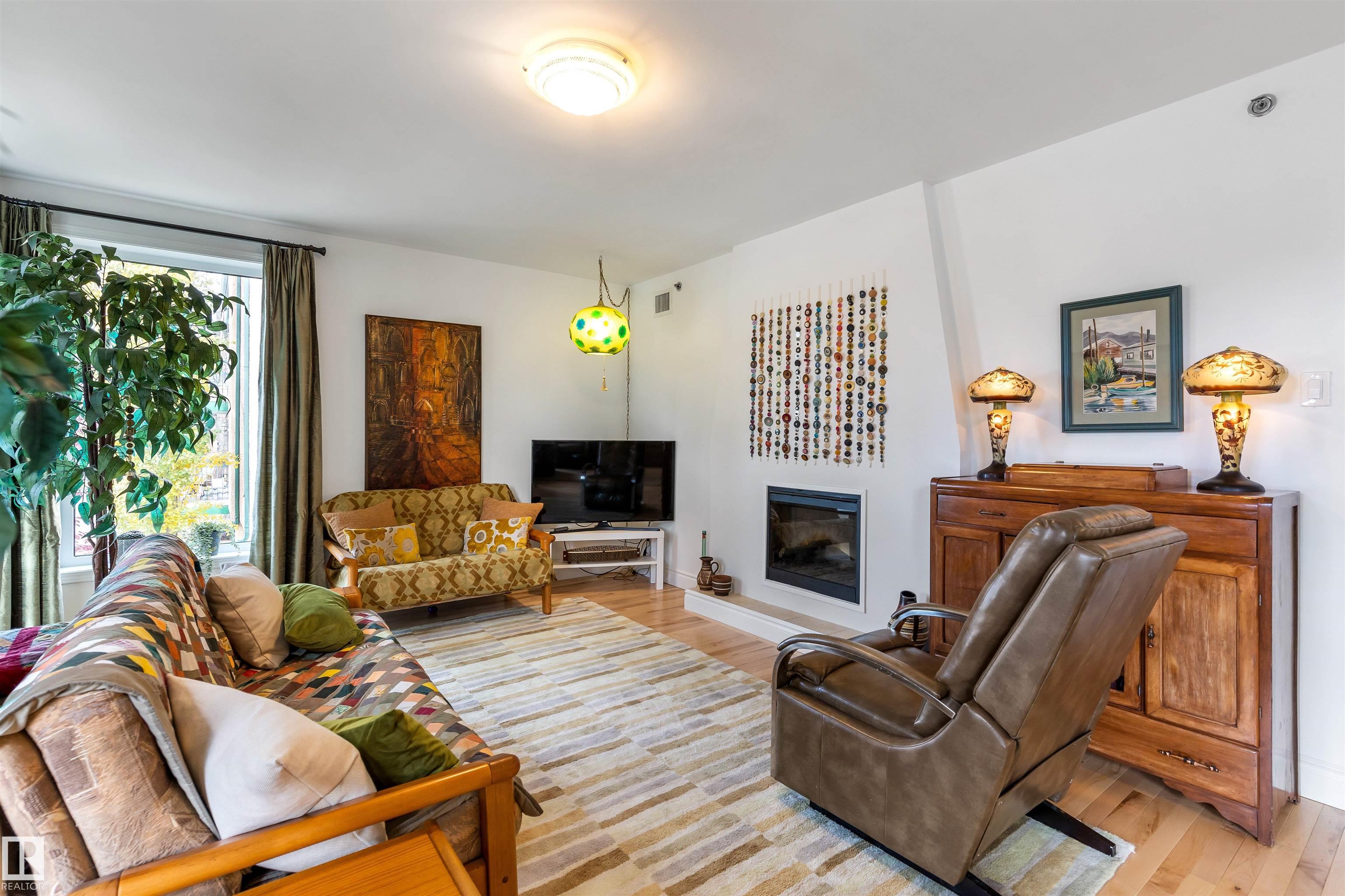 Steps from the Edmonton River Valley & MILL CREEK RAVINE, discover this SPACIOUS ONE OF A KIND CONDO in the Rembrandt. The unit opens into the kitchen w/ European style cabinetry, tiled back splash & pot/pan drawers. HARDWOOD FLOORING in living & dining room. Dining room can easily accommodate entertaining & includes a bay window w/ views of the River Valley & an abundance of storage w/ 2 closets. FRENCH DOORS separate the dining room from the central hall. Living room is huge w/ WALLS OF WINDOWS & features a stunning electric FIREPLACE. The living room includes flex space on one end to accommodate an office. There are 2 BEDROOMS & a large DEN that could be utilized as a 3rd bedroom. The den features a 2ND FIREPLACE & access to a large covered balcony. The primary bedroom features a 5pce ensuite w/ double sinks. There is a 3pce bathroom & in suite laundry. This is a unique building w/ only 16 suites. ALL UTILITIES are included in the condo fee. Pet Friendly & 1 assigned underground HEATED PARKING STALL!