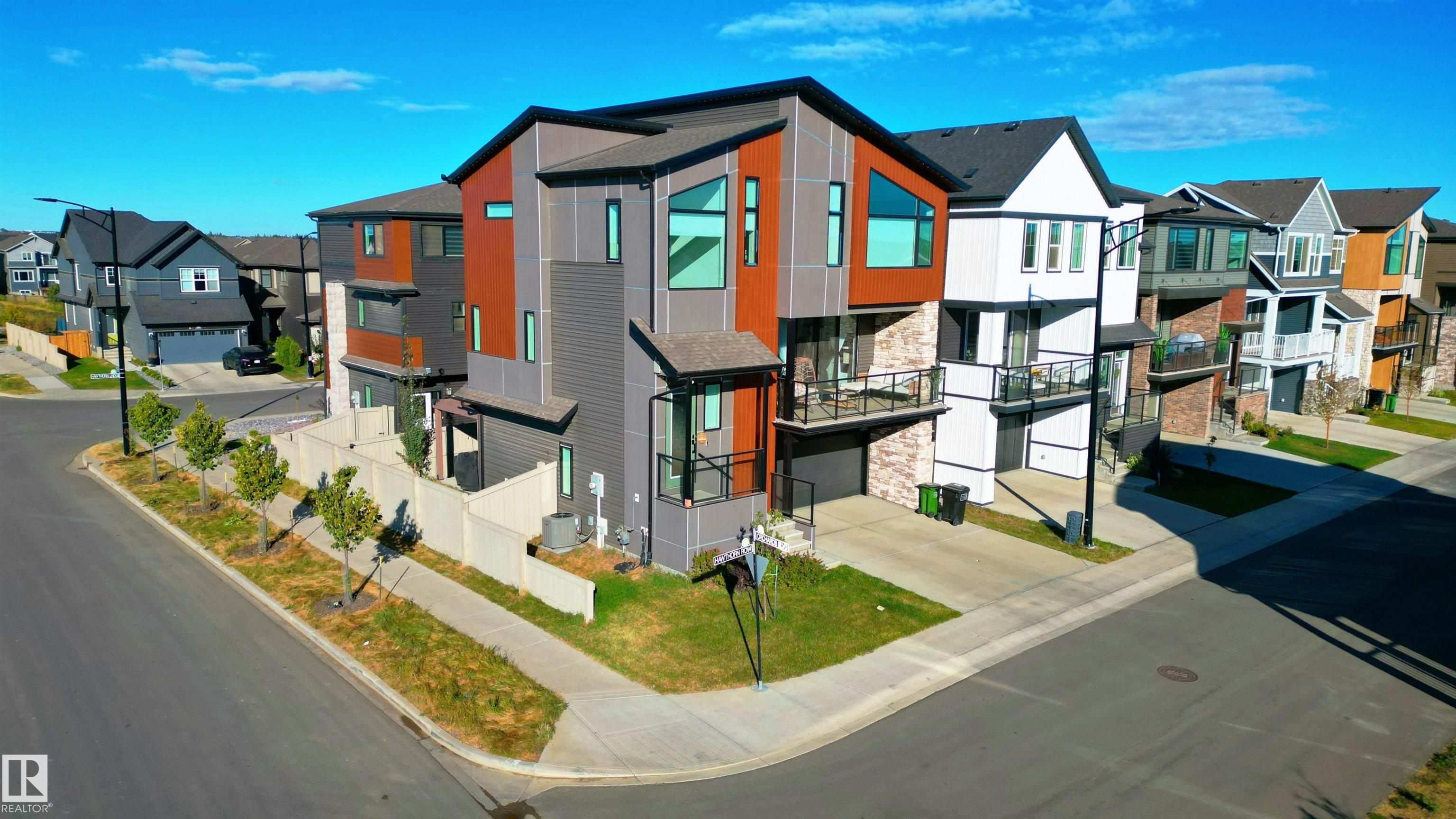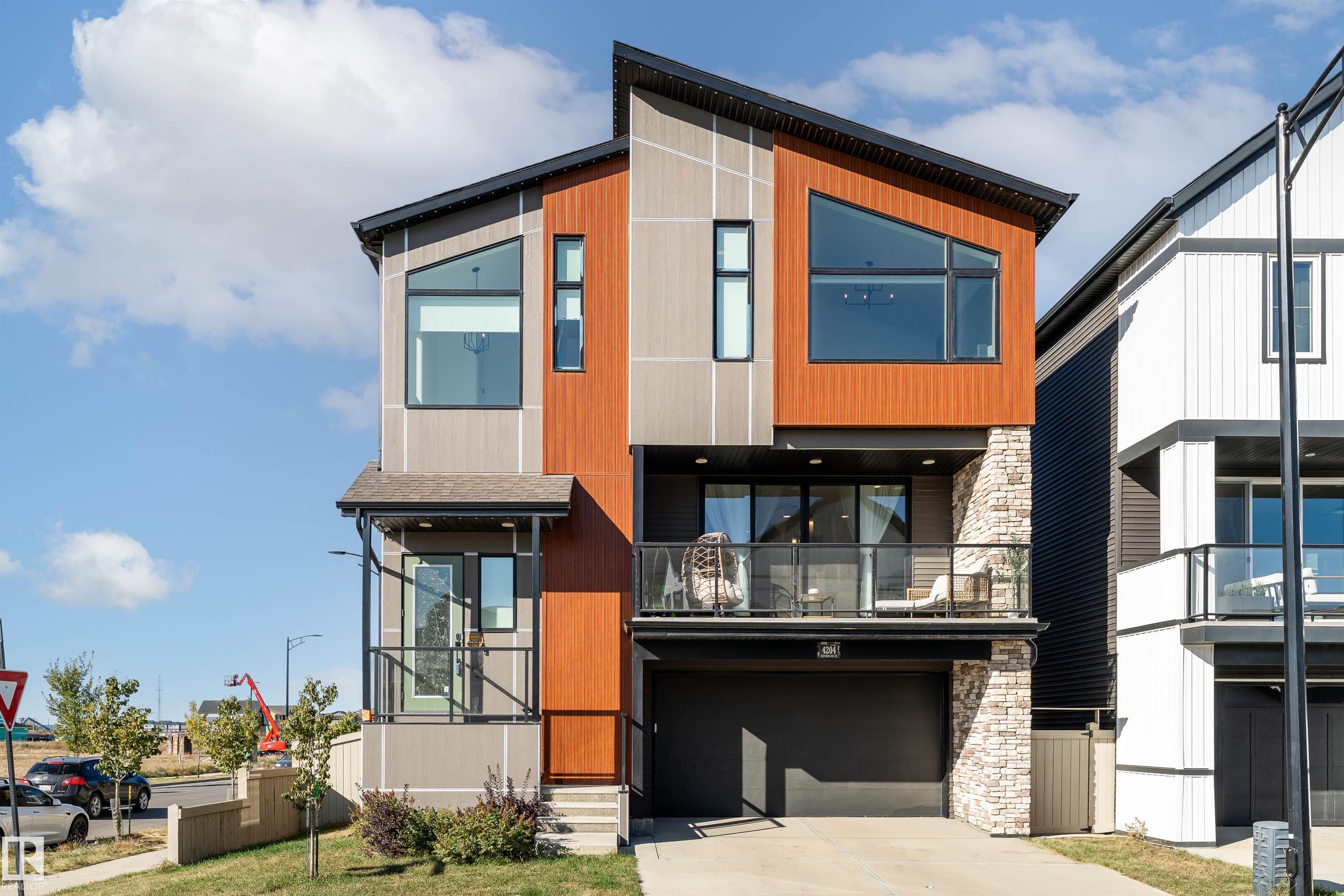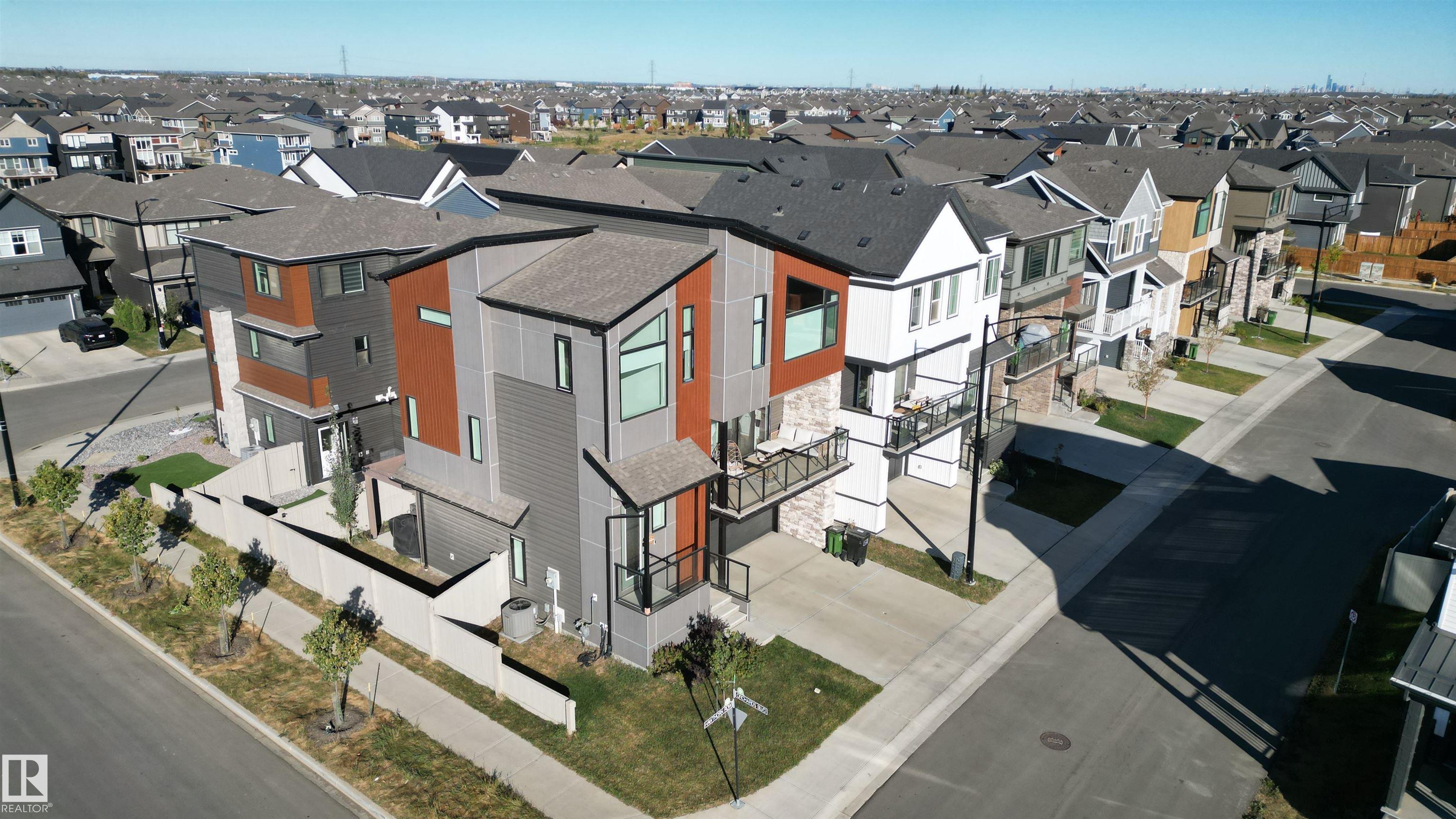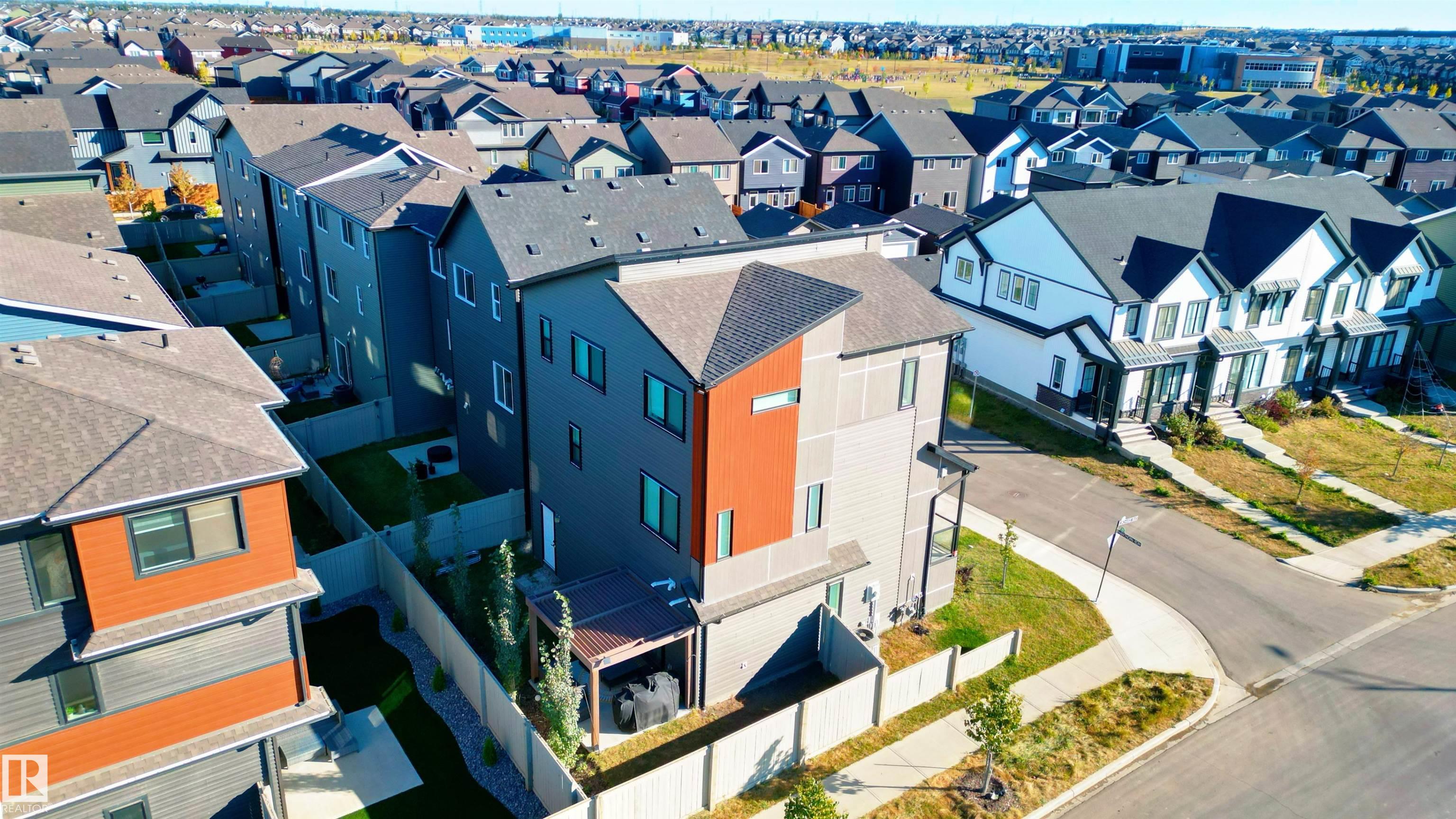 Welcome to this immaculate 3-storey, 2212 sq. ft. Showhome, nestled on a corner lot in the highly sought-after community of The Orchards at Ellerslie. The main floor boasts 9-ft ceilings, an abundance of natural light that fills the bright living room, and a striking tile-wrapped fireplace. The chef-inspired kitchen features a stunning waterfall island, modern cabinetry, and stainless steel appliances. Access to a cozy balcony provides a seamless indoor-outdoor flow for year-round enjoyment. Upstairs, the spacious primary bedroom is a retreat with a large walk-in closet and a luxurious 5-piece ensuite. Two additional bedrooms, a 4-piece bathroom, and a convenient upstairs laundry room enhance the home's functionality and convenience. The walk-out lower level offers a fourth bedroom, and access to a beautifully landscaped backyard, complete with a concrete patio, a charming pergola, and outdoor permanent lighting. With Central A/C, double attached garage and schools close by, this home has it all!