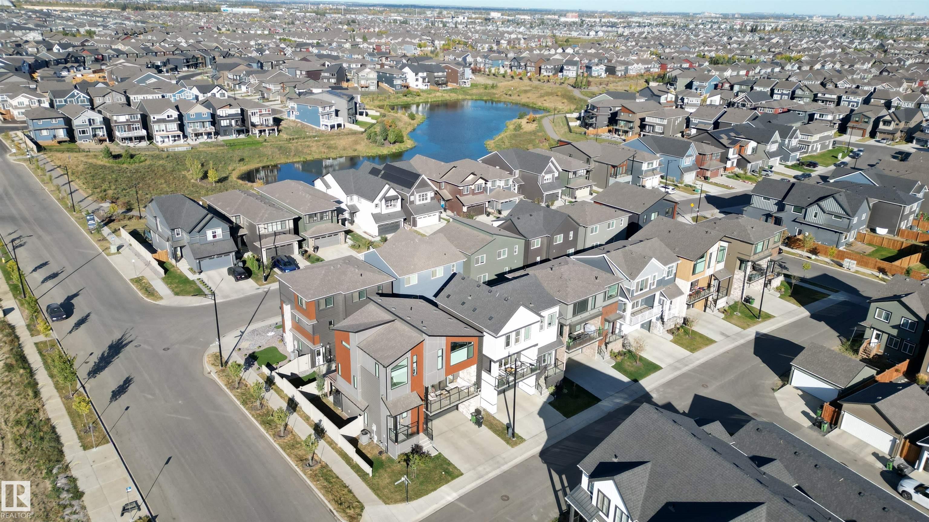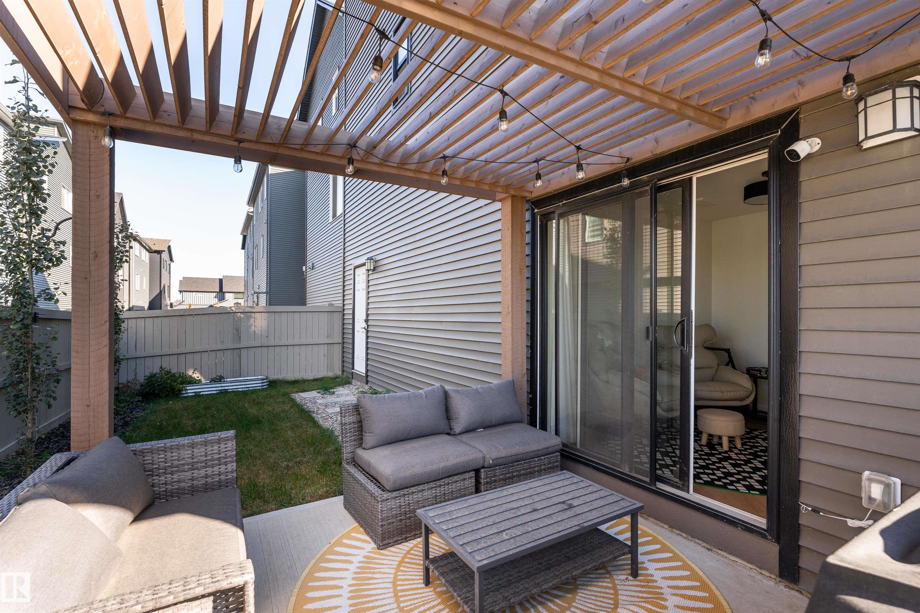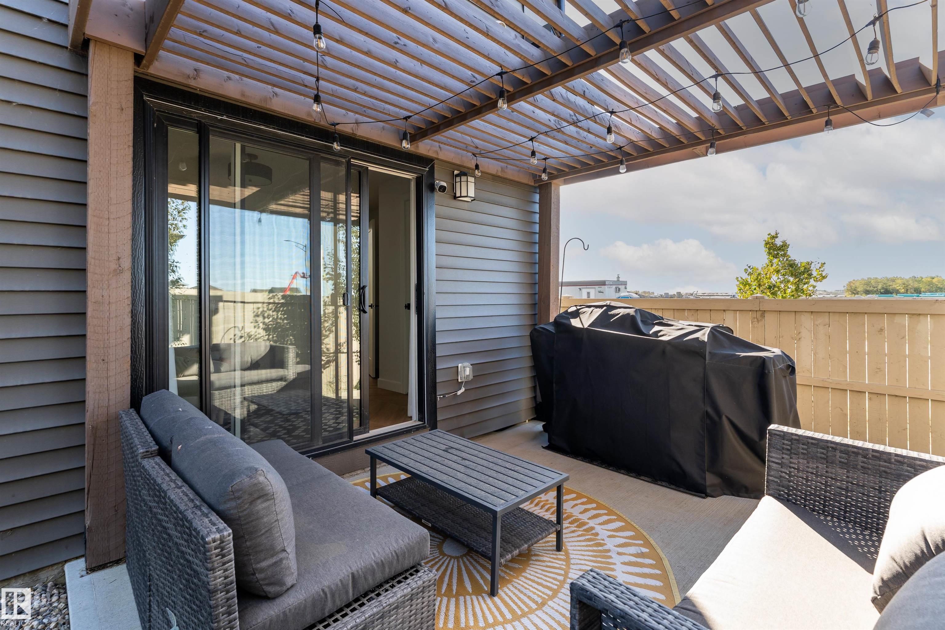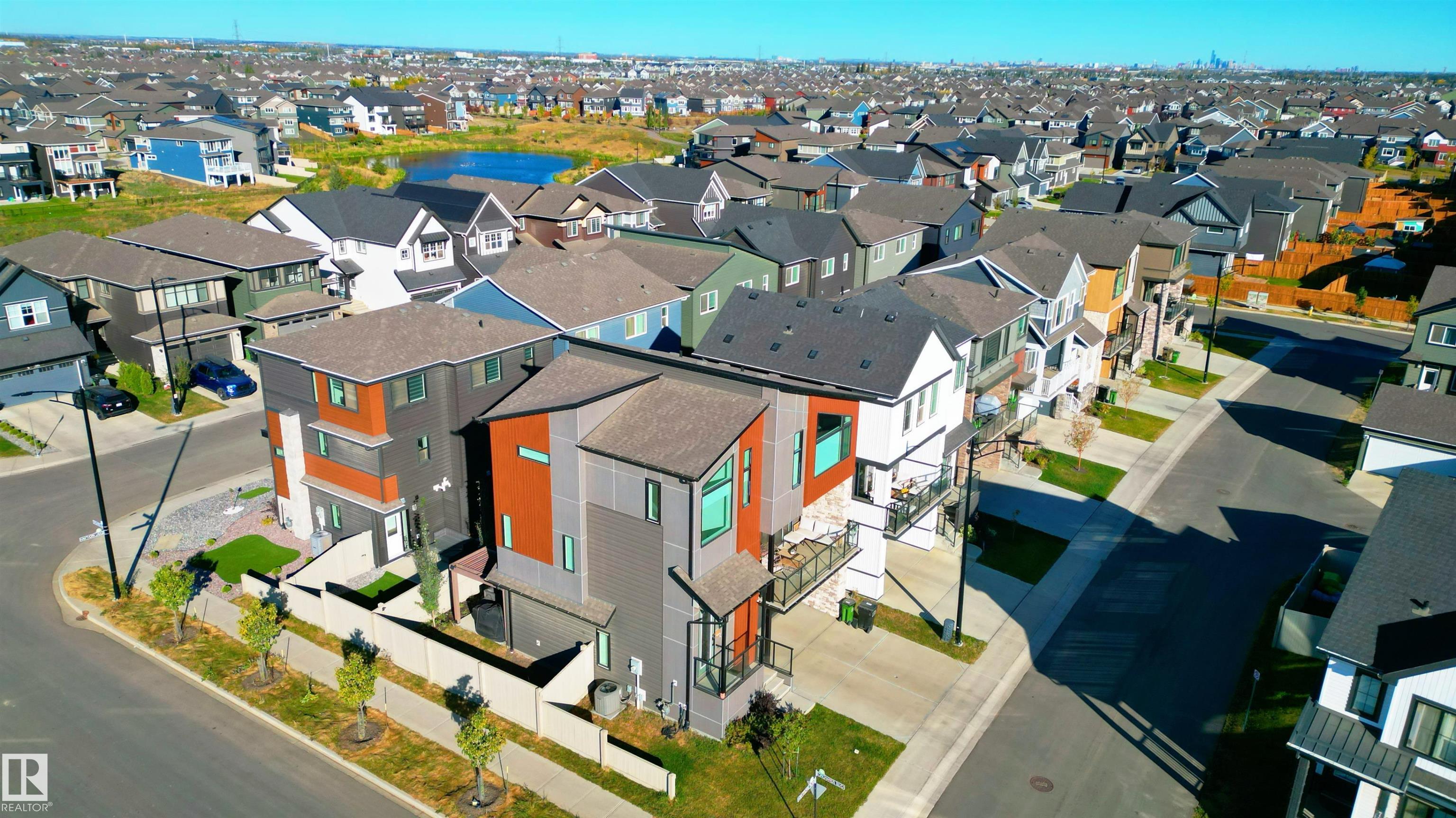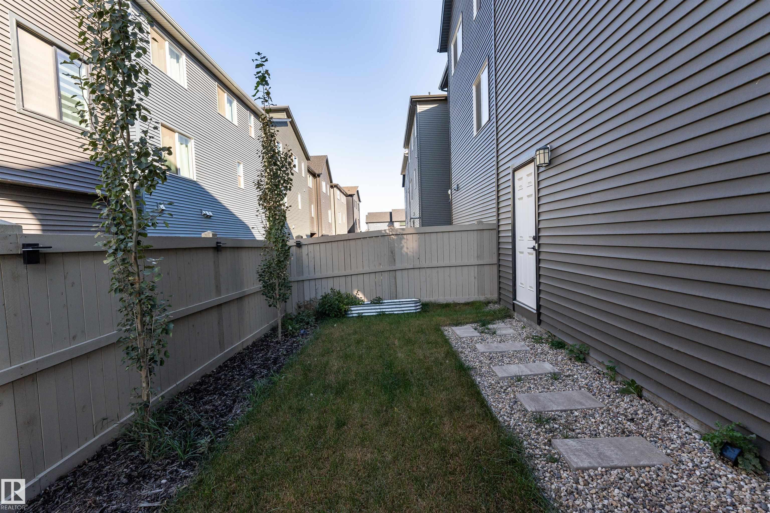 Welcome to this immaculate 3-storey, 2212 sq. ft. Showhome, nestled on a corner lot in the highly sought-after community of The Orchards at Ellerslie. The main floor boasts 9-ft ceilings, an abundance of natural light that fills the bright living room, and a striking tile-wrapped fireplace. The chef-inspired kitchen features a stunning waterfall island, modern cabinetry, and stainless steel appliances. Access to a cozy balcony provides a seamless indoor-outdoor flow for year-round enjoyment. Upstairs, the spacious primary bedroom is a retreat with a large walk-in closet and a luxurious 5-piece ensuite. Two additional bedrooms, a 4-piece bathroom, and a convenient upstairs laundry room enhance the home's functionality and convenience. The walk-out lower level offers a fourth bedroom, and access to a beautifully landscaped backyard, complete with a concrete patio, a charming pergola, and outdoor permanent lighting. With Central A/C, double attached garage and schools close by, this home has it all!