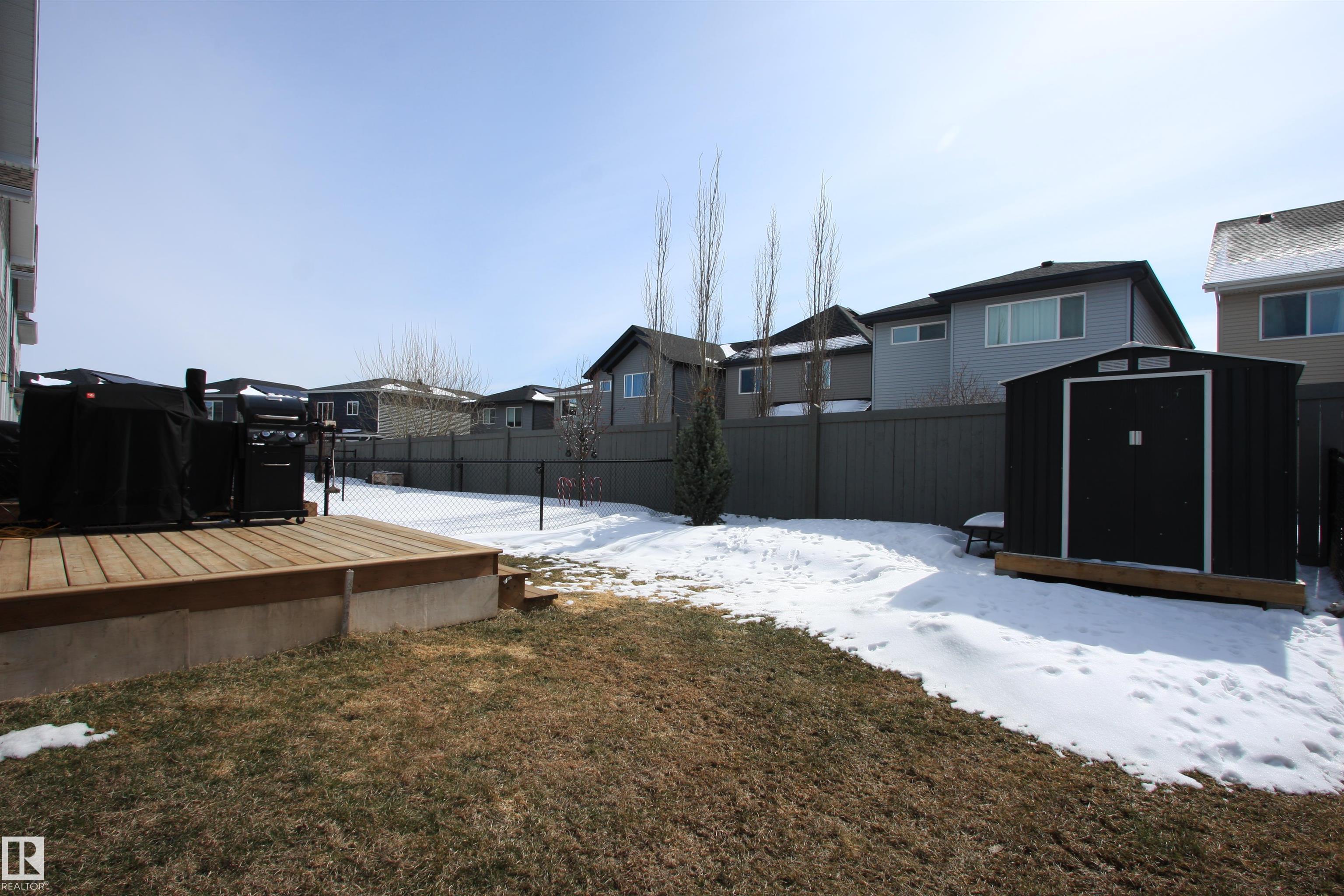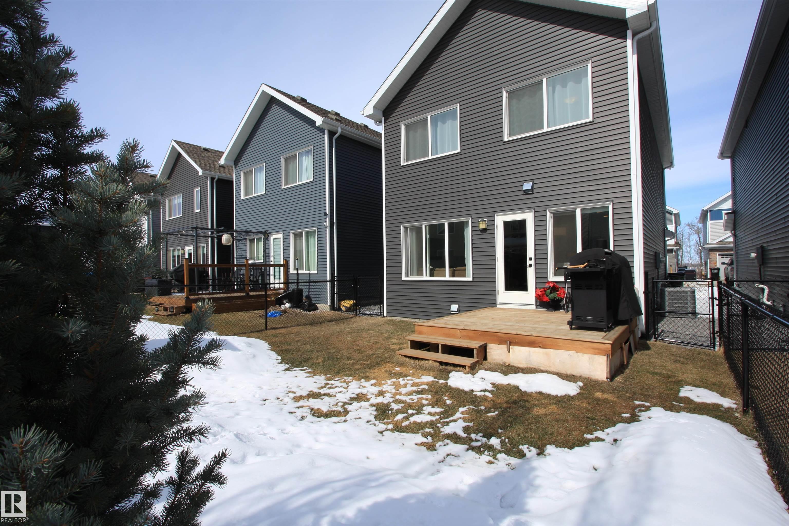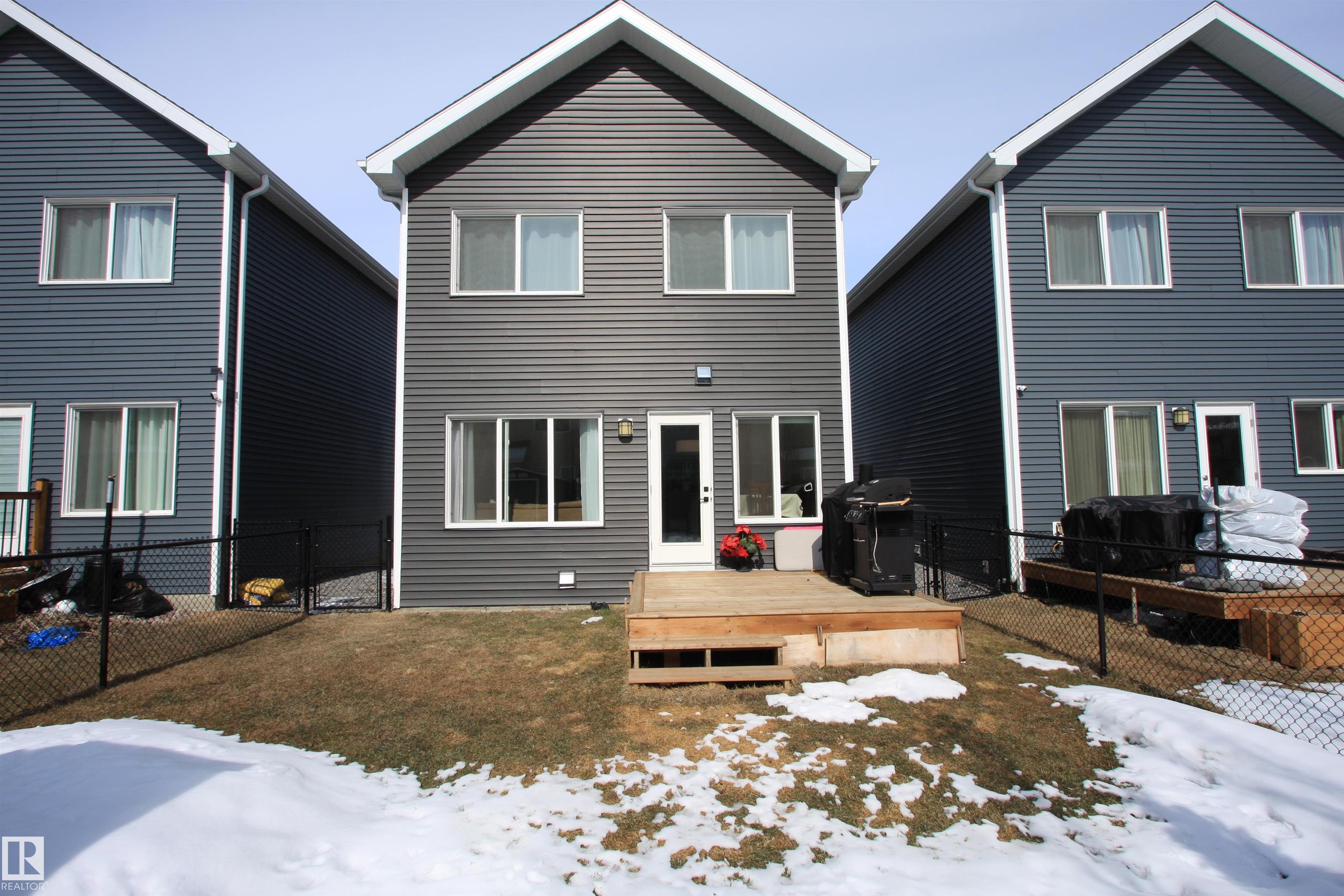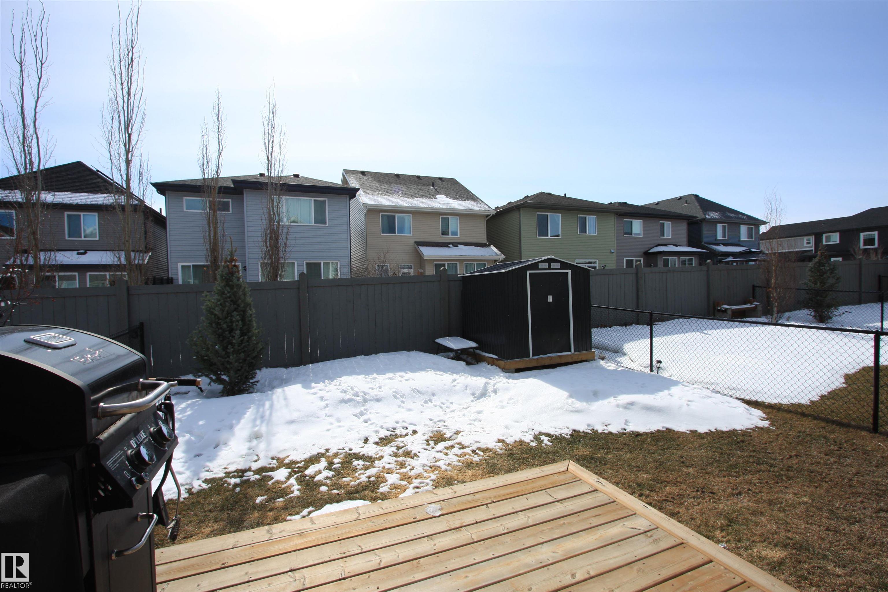Welcome home to sun-filled living, a south-facing backyard, and beautiful paved trails just steps away. This stylish 2-storey home in The Village at Trumpeter offers 1,424 sq ft of bright, functional living space well-maintained and designed for easy living on a quiet street. The open-concept main floor features large windows, modern matte-black accents, white cabinetry, quartz countertops, and stainless-steel appliances. Upstairs you'll find 3 generous bedrooms, including a spacious primary suite with walk-in closet and 4-pc ensuite, plus convenient second-floor laundry. Stay comfortable year-round with central A/C. The fully fenced and landscaped backyard includes a deck and storage shed--perfect for relaxing outdoors or planting a small garden. The single attached garage is insulated and drywalled. Enjoy walking distance to scenic paved trails--perfect for biking, evening strolls, or walking the dog--with quick access to the Henday and Yellowhead.