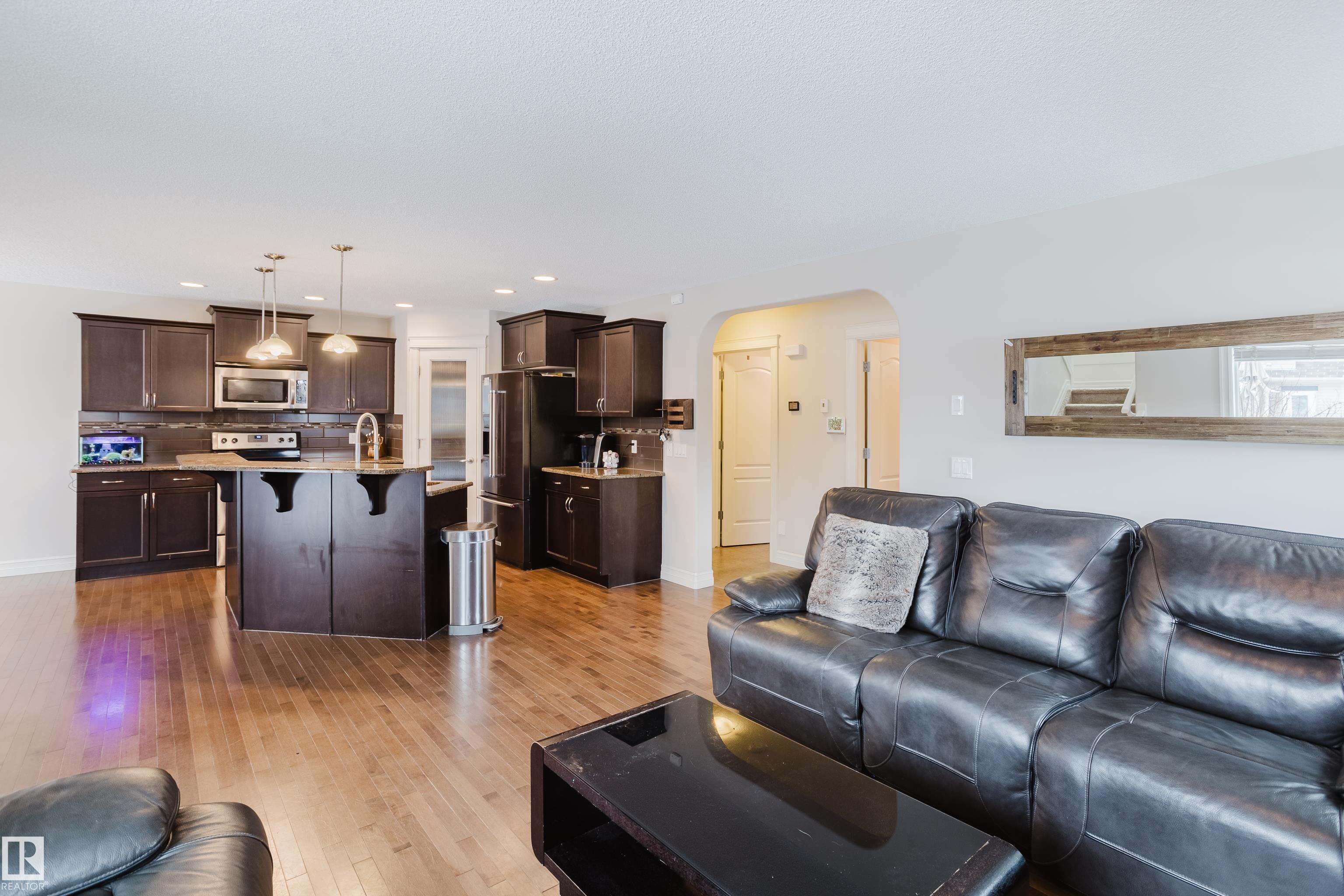 Live the good life in the sought-after community of Walker. This impressive 2-storey home on corner lot welcomes you with a spacious, inviting foyer that opens to a beautifully designed main floor. The open-concept layout highlights a stylish kitchen featuring rich dark maple cabinetry, granite countertops, a large island & a convenient walk-through pantry. The adjoining living room feels warm & elegant, centred around a tile-surround fireplace & complemented by hardwood & ceramic tile flooring. A main-floor laundry room adds everyday practicality. At the rear of the home, the staircase leads to an impressive bonus room, perfect for an office. The generous primary bdrm offers a luxurious ensuite with dual sinks, walk-in shower & a relaxing corner soaker tub. The unfinished basement awaits your imagination! Outside, the west-facing yard features a newer deck, perfect for enjoying long summer evenings. Just one block from an elementary and junior high school, minutes to Ellerslie shopping & Henday access.