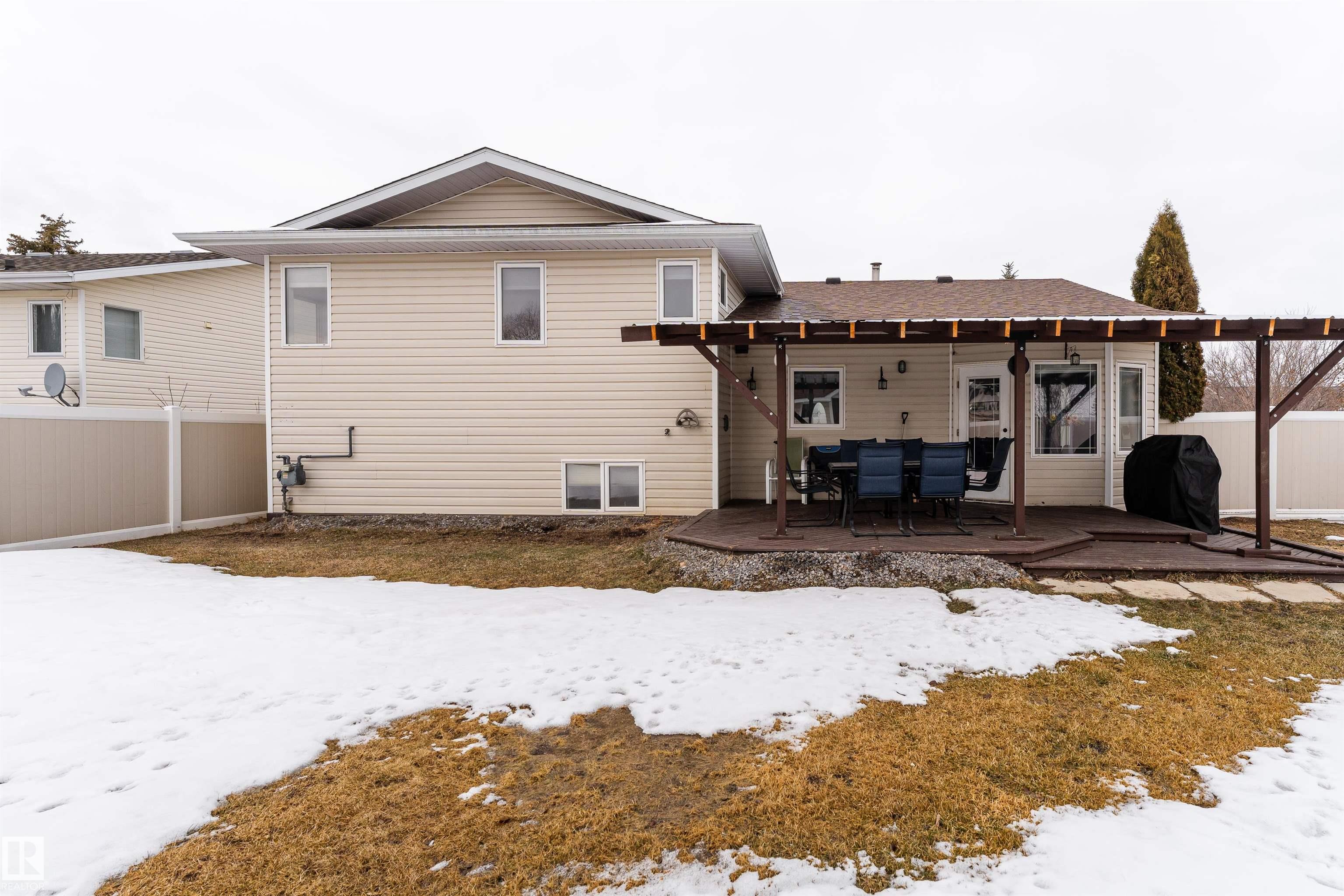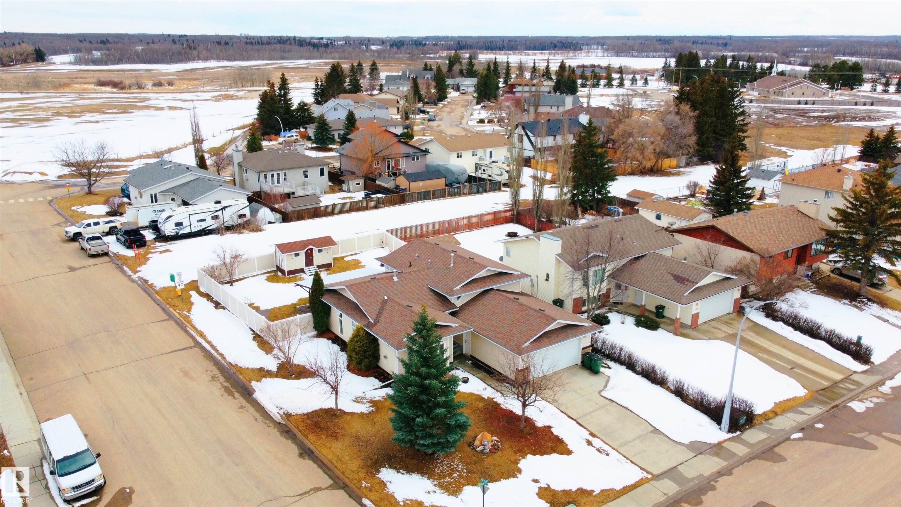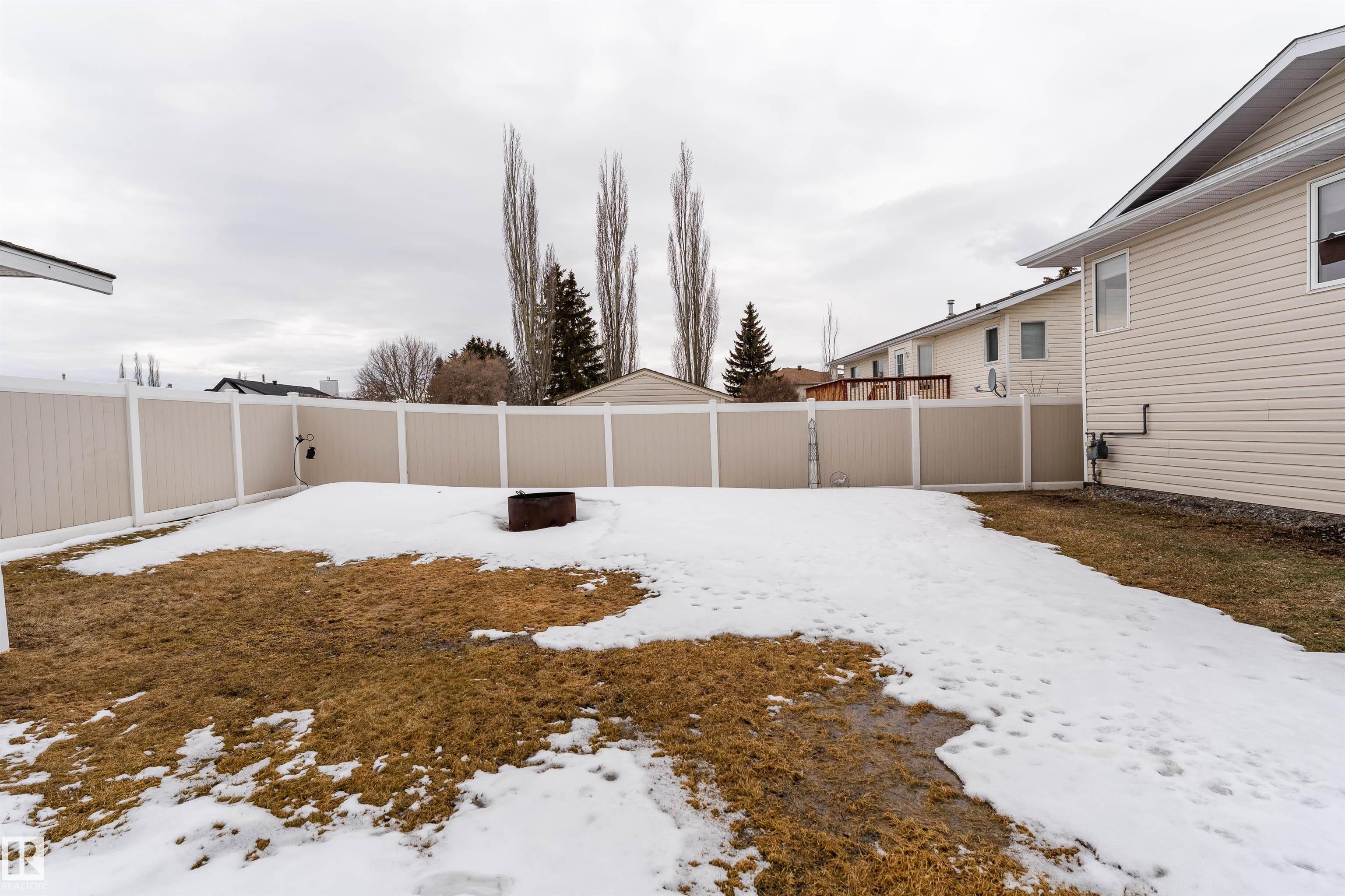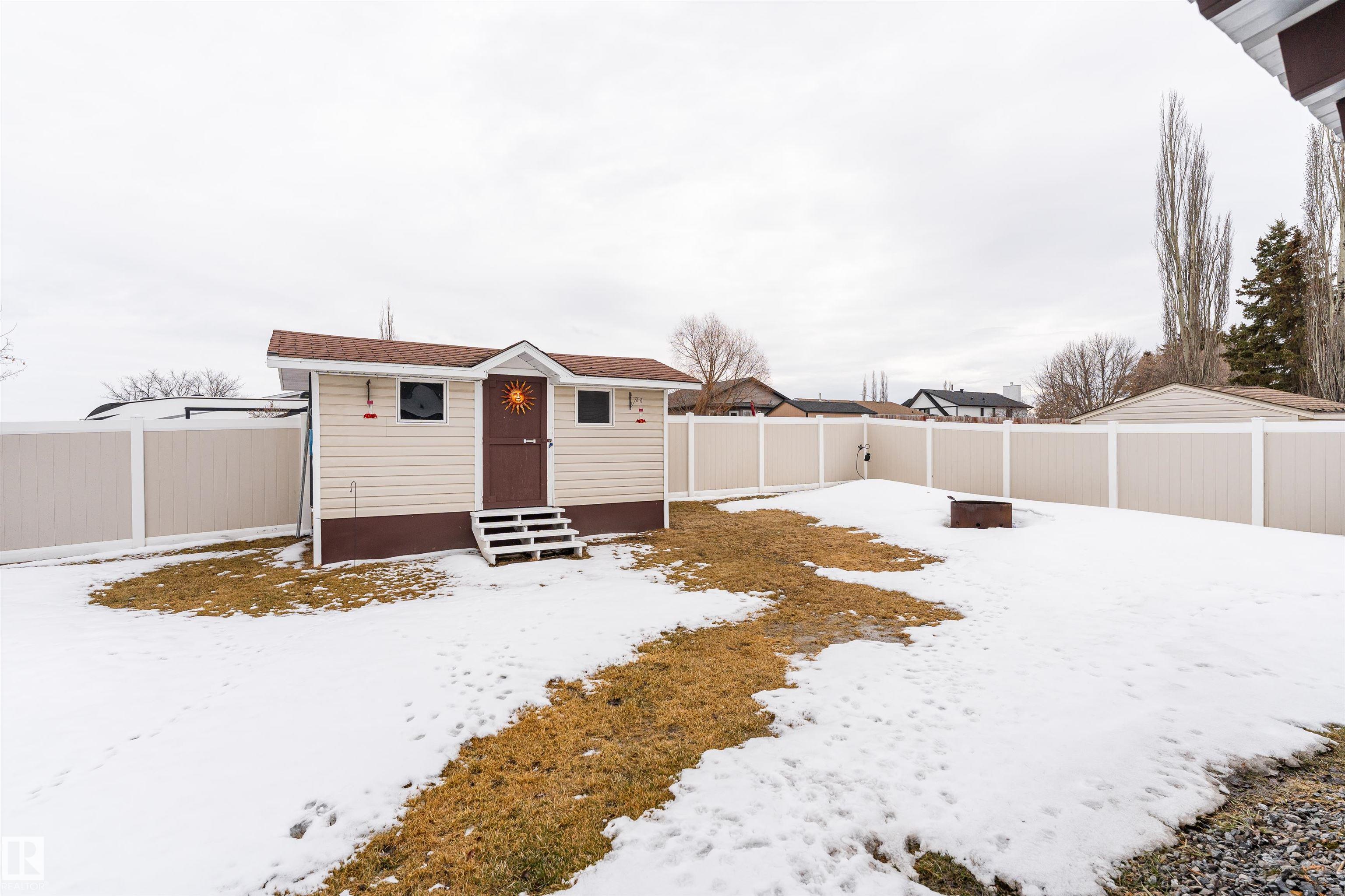 Beautifully maintained home in the quiet community of Onoway. This 3-Bed, 3-Bath property sits on a spacious corner lot and features a fully fenced and landscaped yard. The entry welcomes you into a bright living room complete with a cozy fireplace. The large dining area flows seamlessly into the kitchen, with a new dishwasher and stove (2025). Upstairs, you'll find two well-sized bedrooms, including the primary suite, which offers a 4pc ensuite with a jetted tub. The basement provides a comfortable additional living space, complete with a third bedroom and a 4pc bath. Enjoy the added comfort of in-floor heating in both the basement and the double attached garage. Step outside to your private backyard oasis featuring a deck, garden space, and a convenient storage shed--ideal for summer enjoyment. Located just 5mins from Salters Lake and 15mins from Alberta Beach, this home is also close to schools, shopping, and the arena, with an easy commute to Edmonton.