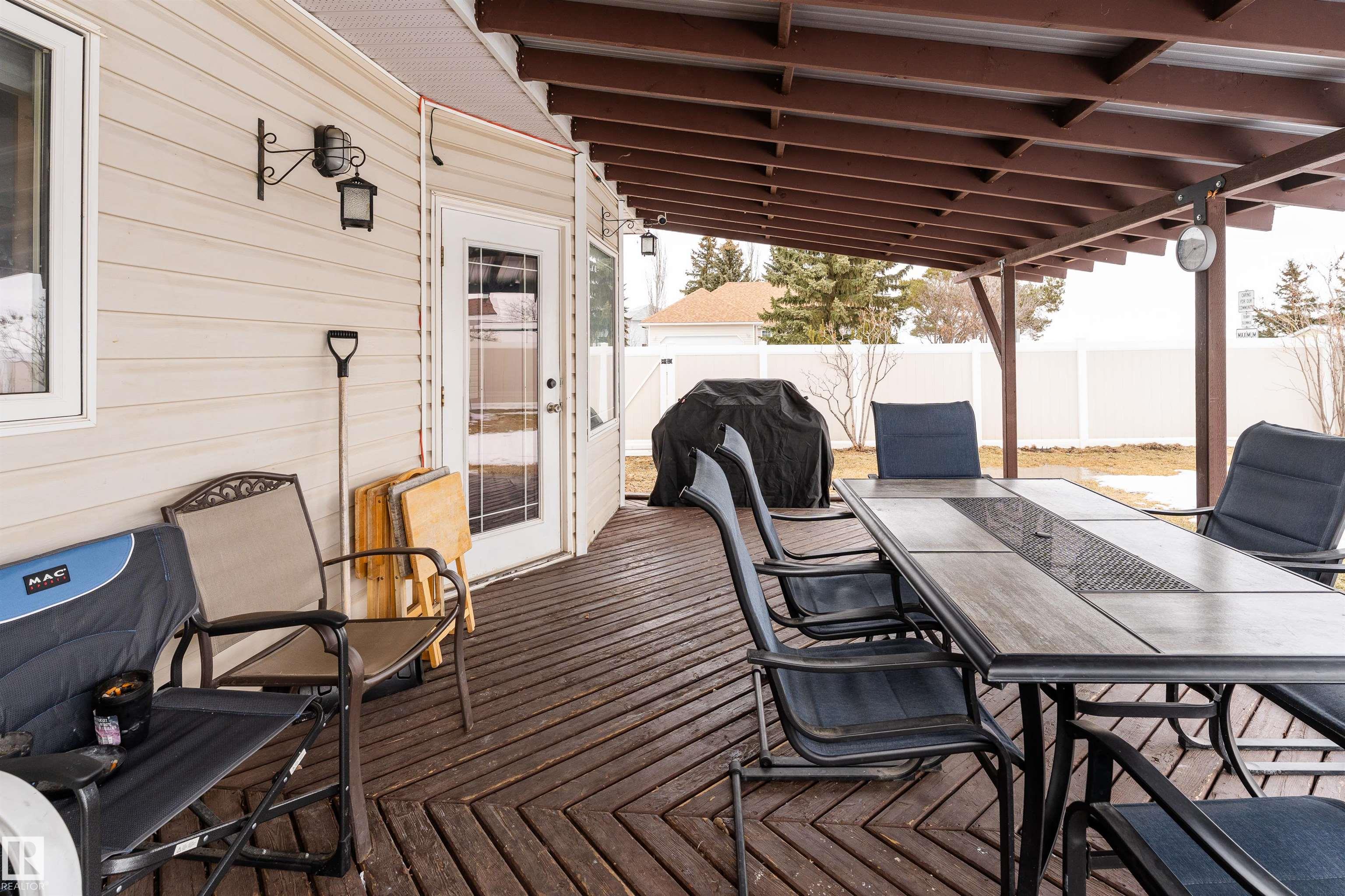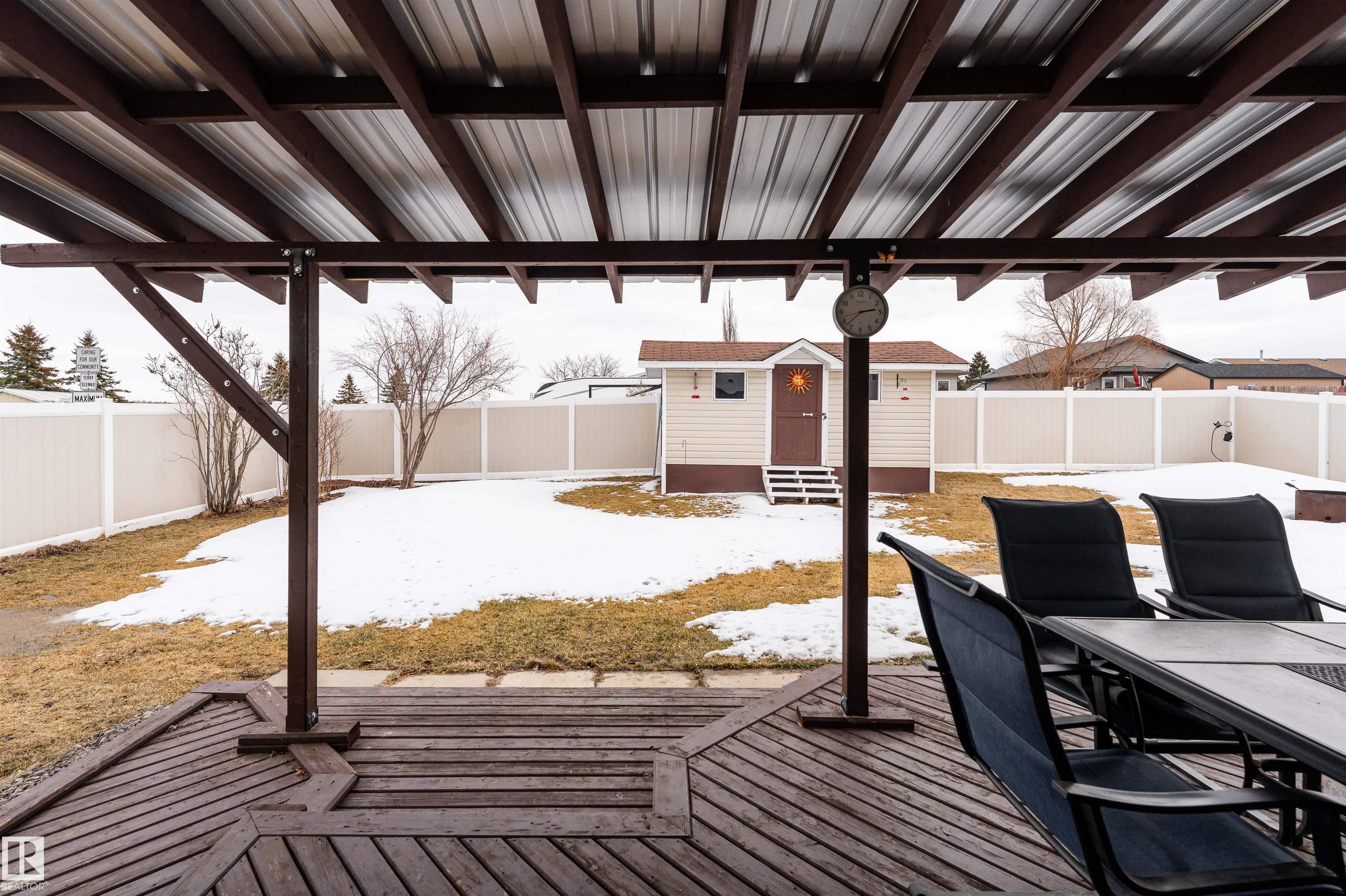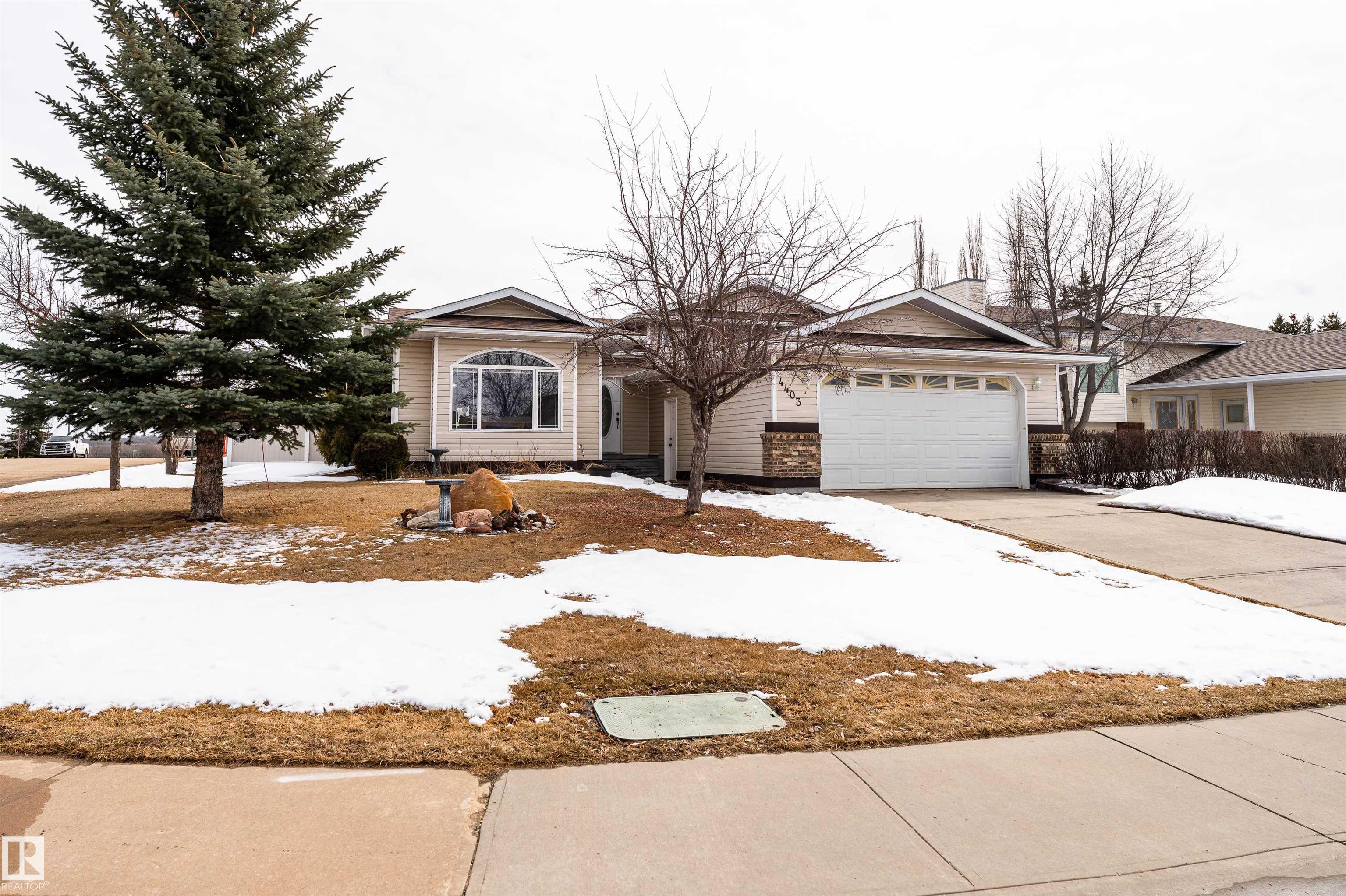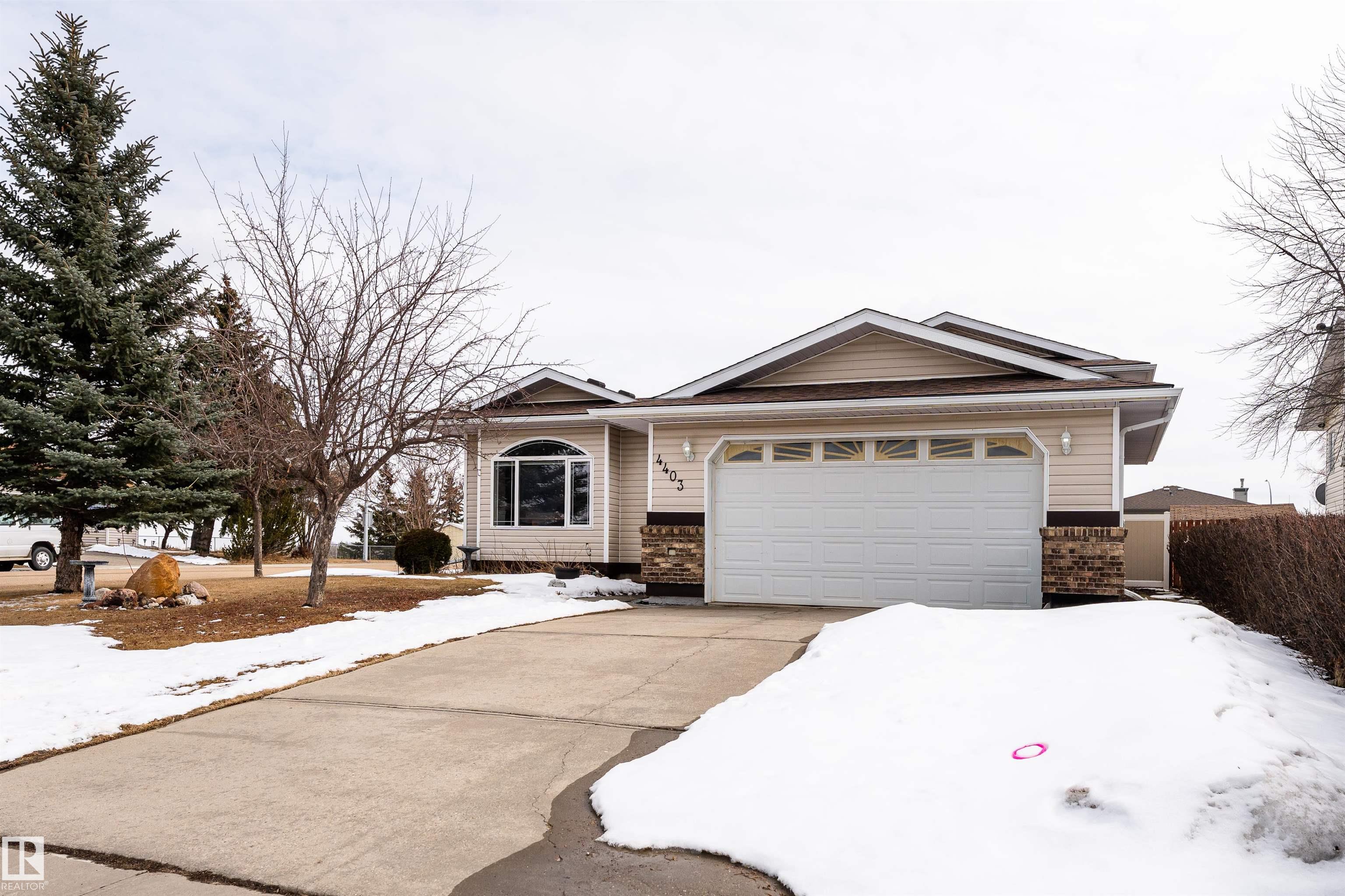 Beautifully maintained home in the quiet community of Onoway. This 3-Bed, 3-Bath property sits on a spacious corner lot and features a fully fenced and landscaped yard. The entry welcomes you into a bright living room complete with a cozy fireplace. The large dining area flows seamlessly into the kitchen, with a new dishwasher and stove (2025). Upstairs, you'll find two well-sized bedrooms, including the primary suite, which offers a 4pc ensuite with a jetted tub. The basement provides a comfortable additional living space, complete with a third bedroom and a 4pc bath. Enjoy the added comfort of in-floor heating in both the basement and the double attached garage. Step outside to your private backyard oasis featuring a deck, garden space, and a convenient storage shed--ideal for summer enjoyment. Located just 5mins from Salters Lake and 15mins from Alberta Beach, this home is also close to schools, shopping, and the arena, with an easy commute to Edmonton.
