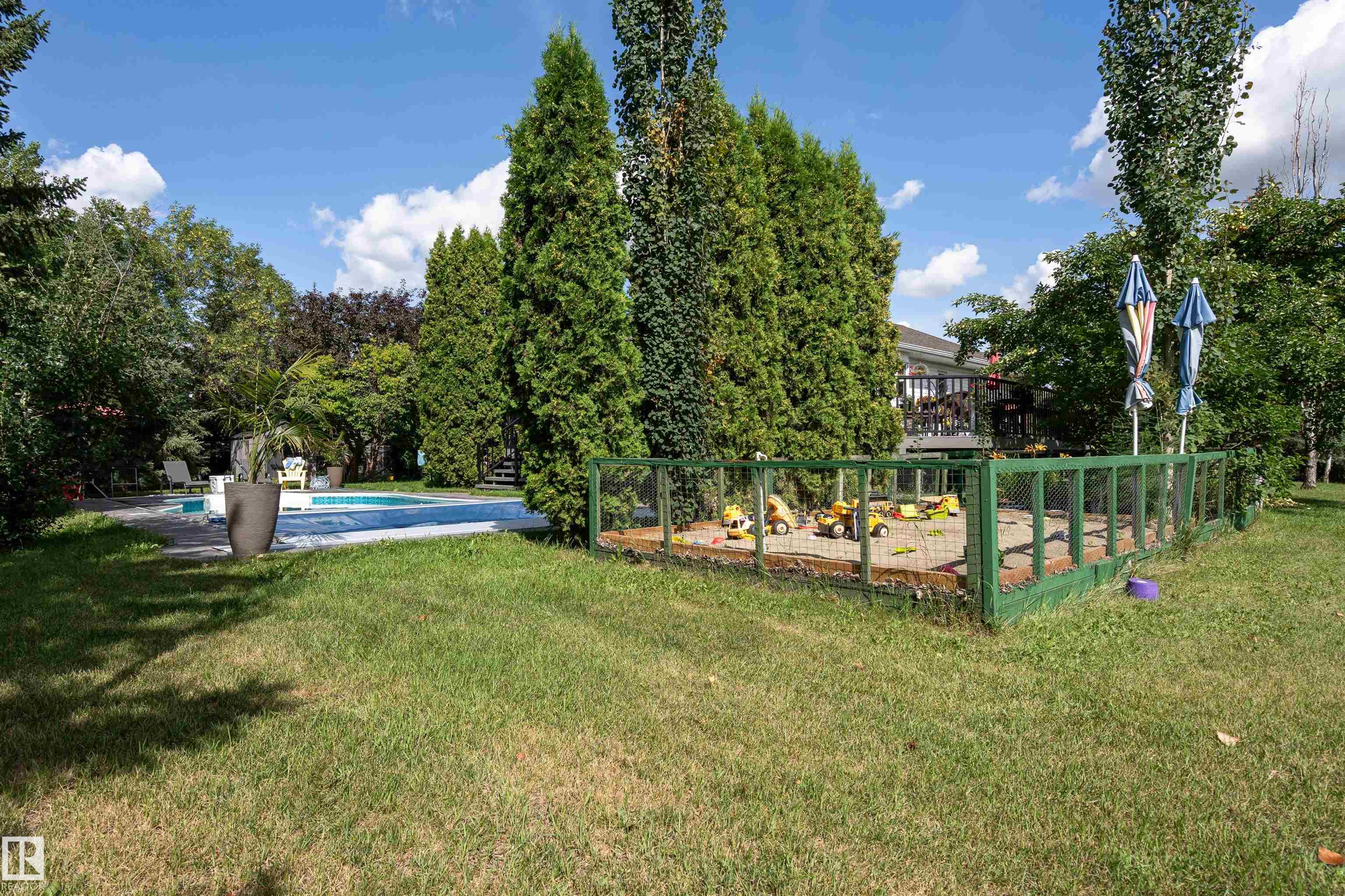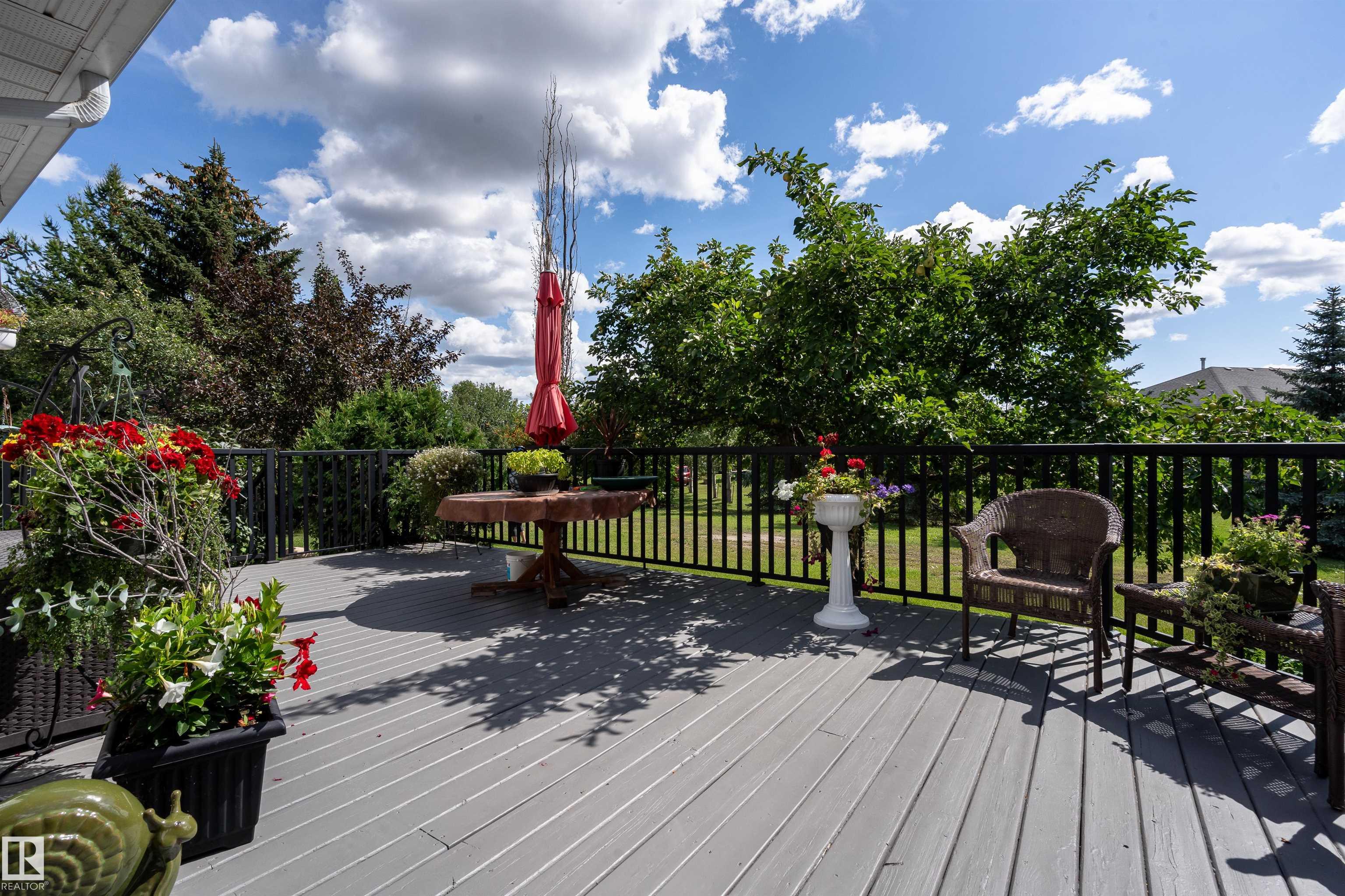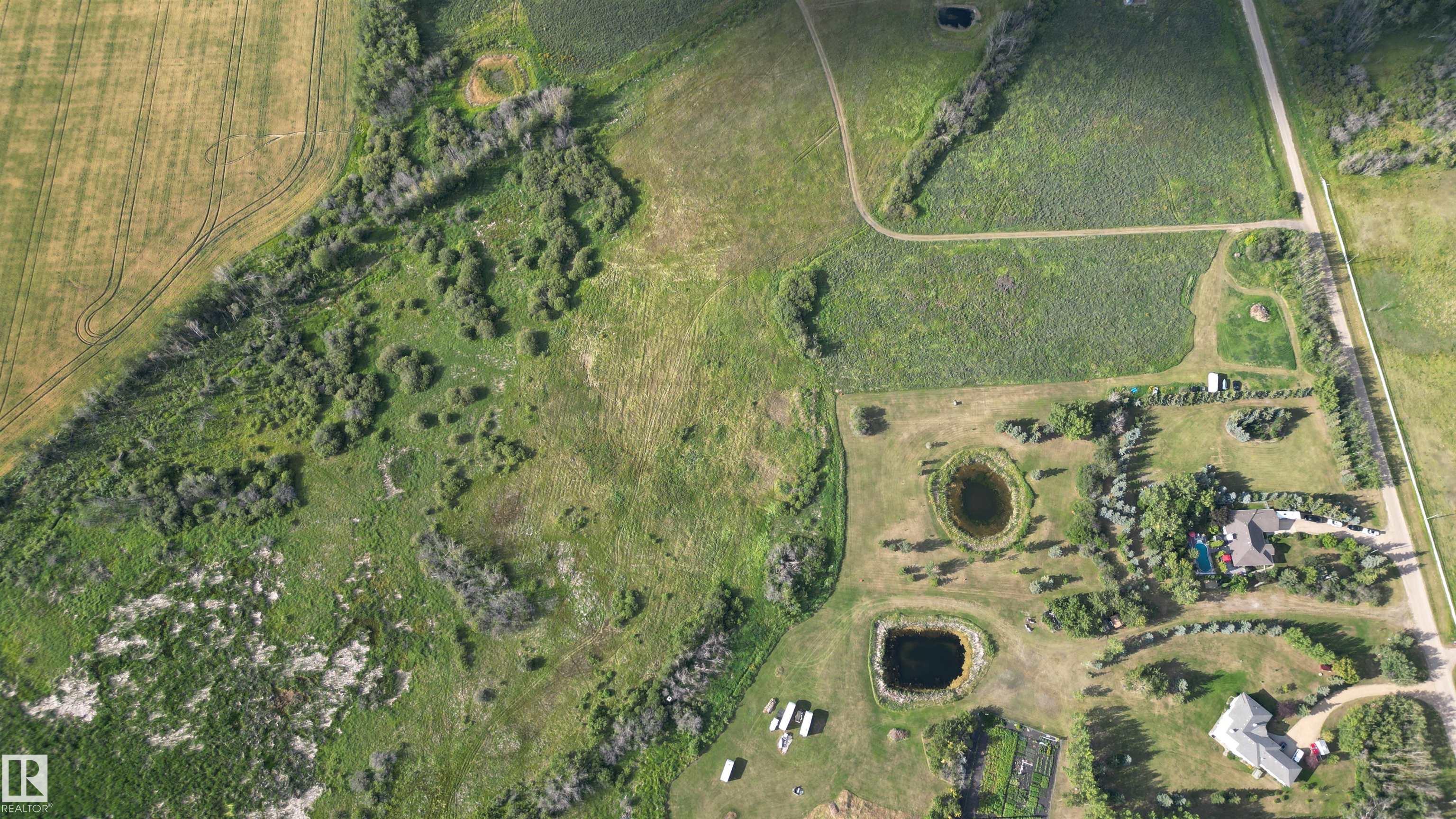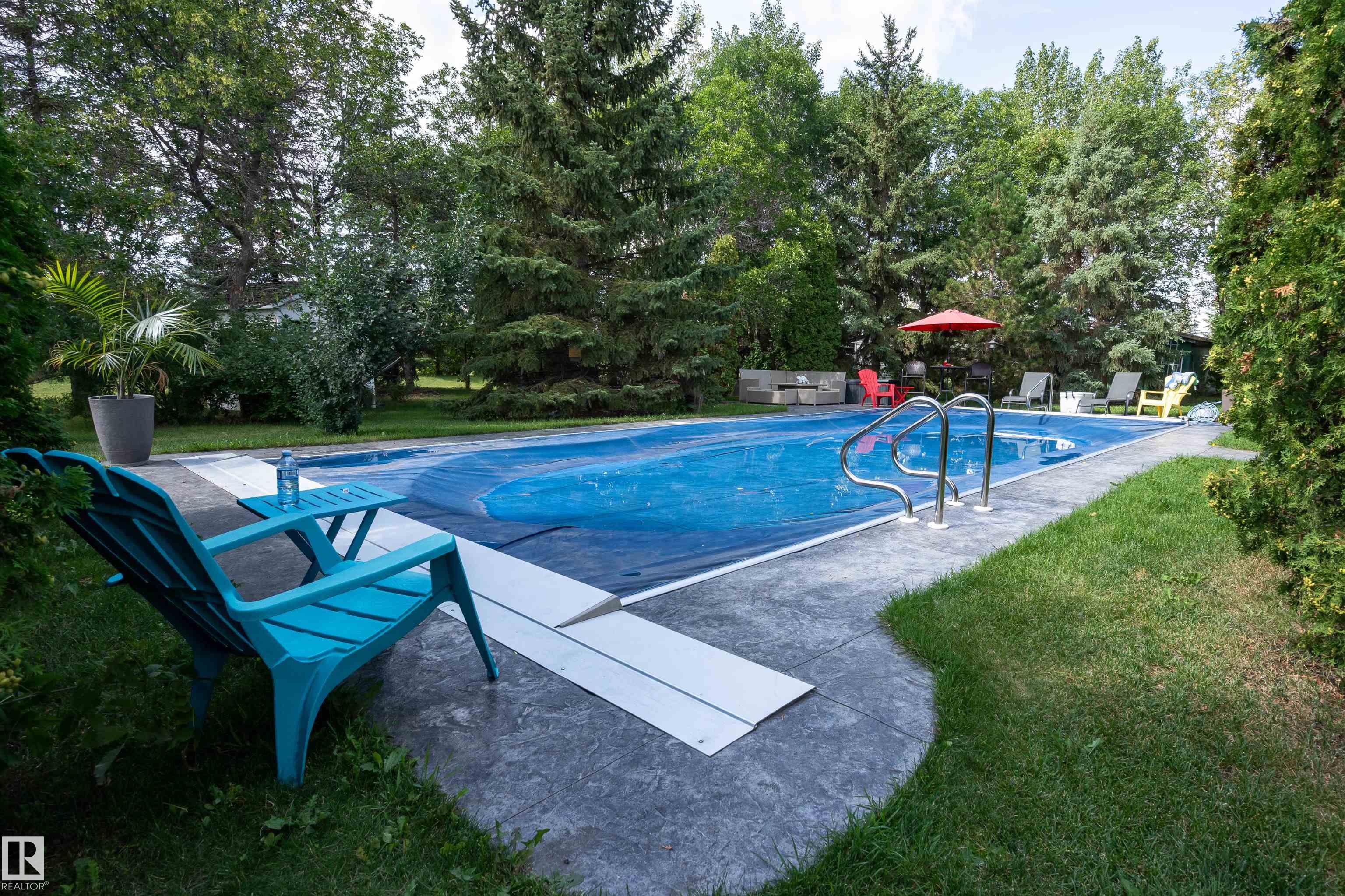 Welcome to Glenview Acres in Sturgeon County, just 5 minutes from Edmonton, where your private 15-acre retreat awaits. This 2,189 sq. ft. bungalow is thoughtfully designed for both relaxation and entertaining. The inviting country-style kitchen is built for gatherings, opening onto a spacious deck and sparkling heated pool with automatic cover. A warm, sunlit living room with a fireplace offers the perfect place to unwind. The primary suite is a true escape with a walk-in closet and 4-piece ensuite, complemented by two additional bedrooms, a 5-piece bath, and convenient main floor laundry. The fully finished basement features brand-new flooring, a sprawling rec room with fireplace--ideal for a games area, bar, or fitness space--along with a guest bedroom, 3-piece bath, and generous storage. A heated double attached garage with a half bath adds everyday comfort. Spend your summers poolside, hosting friends on the expansive deck, or simply savouring the tranquility of your secluded, endless yard.