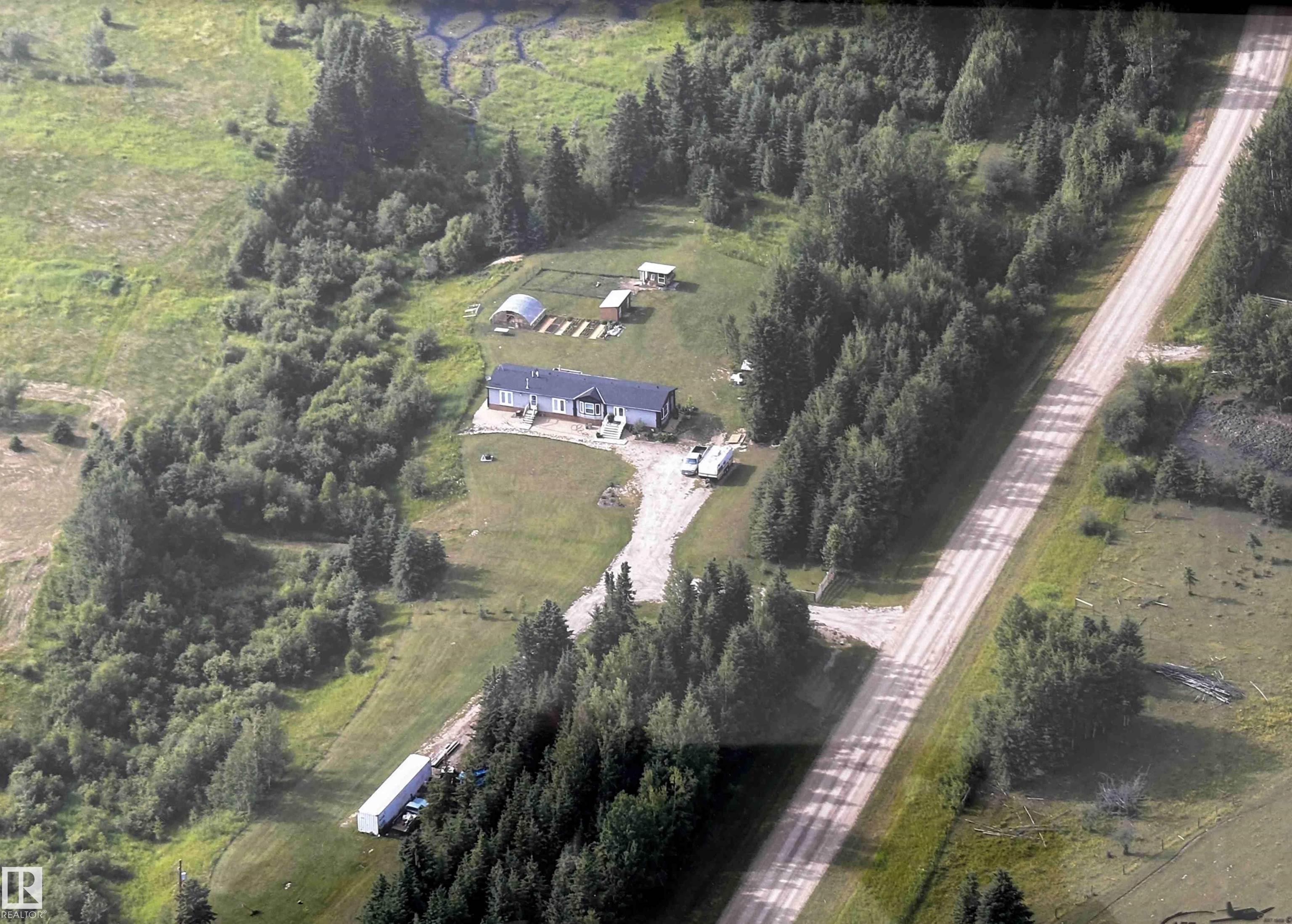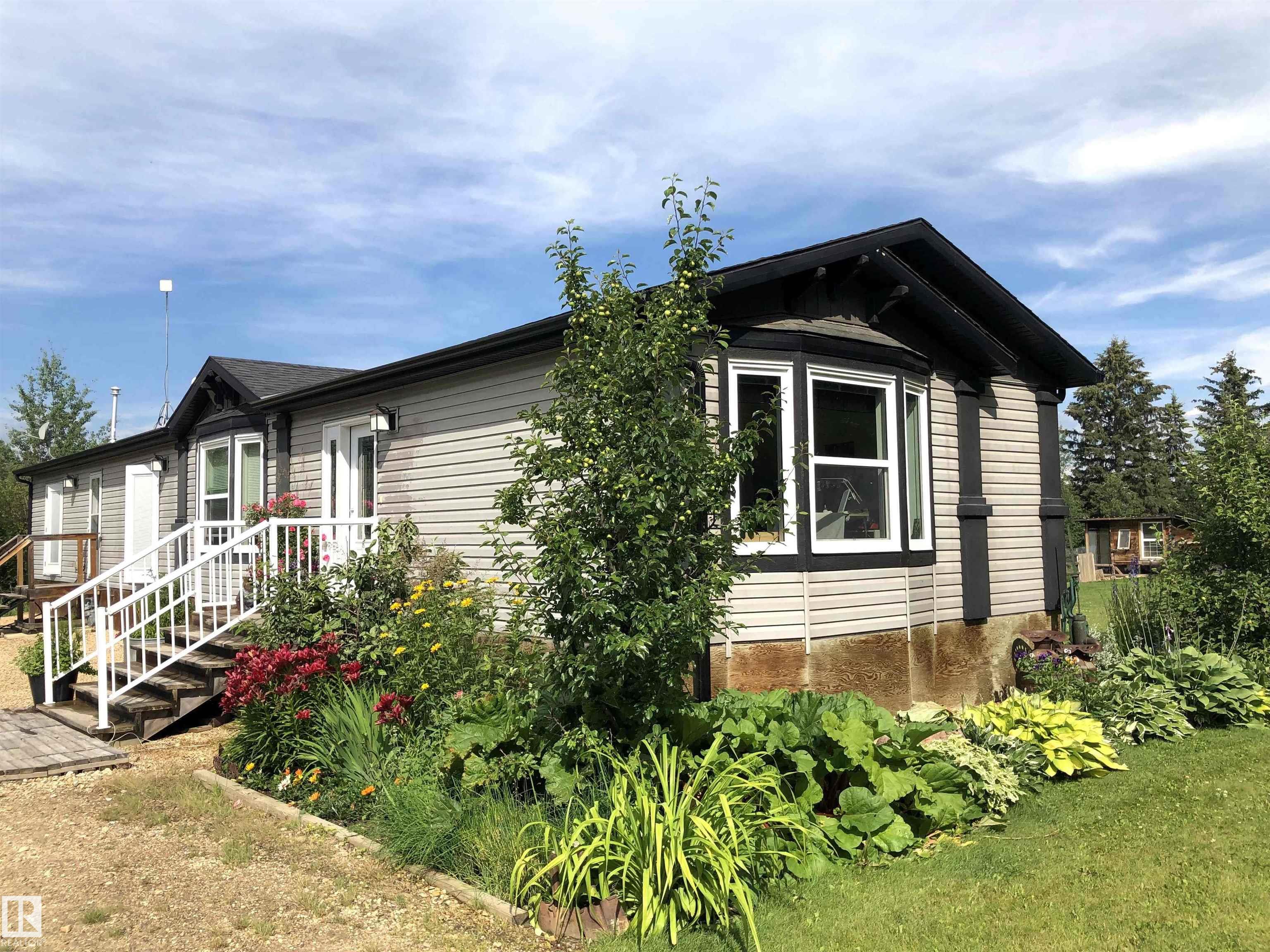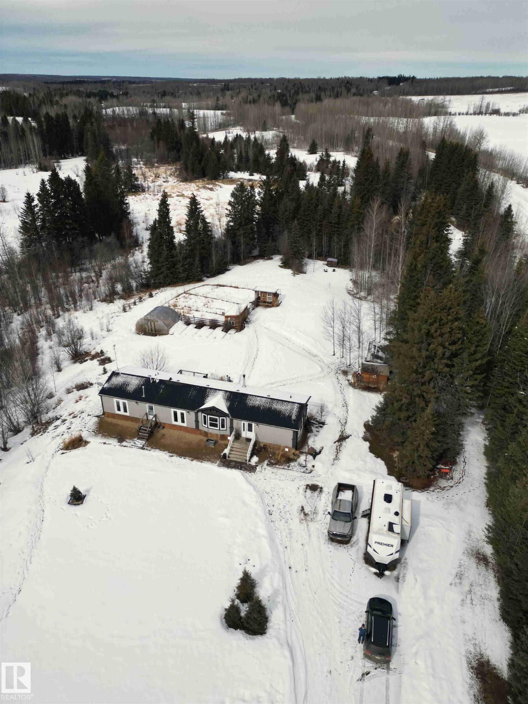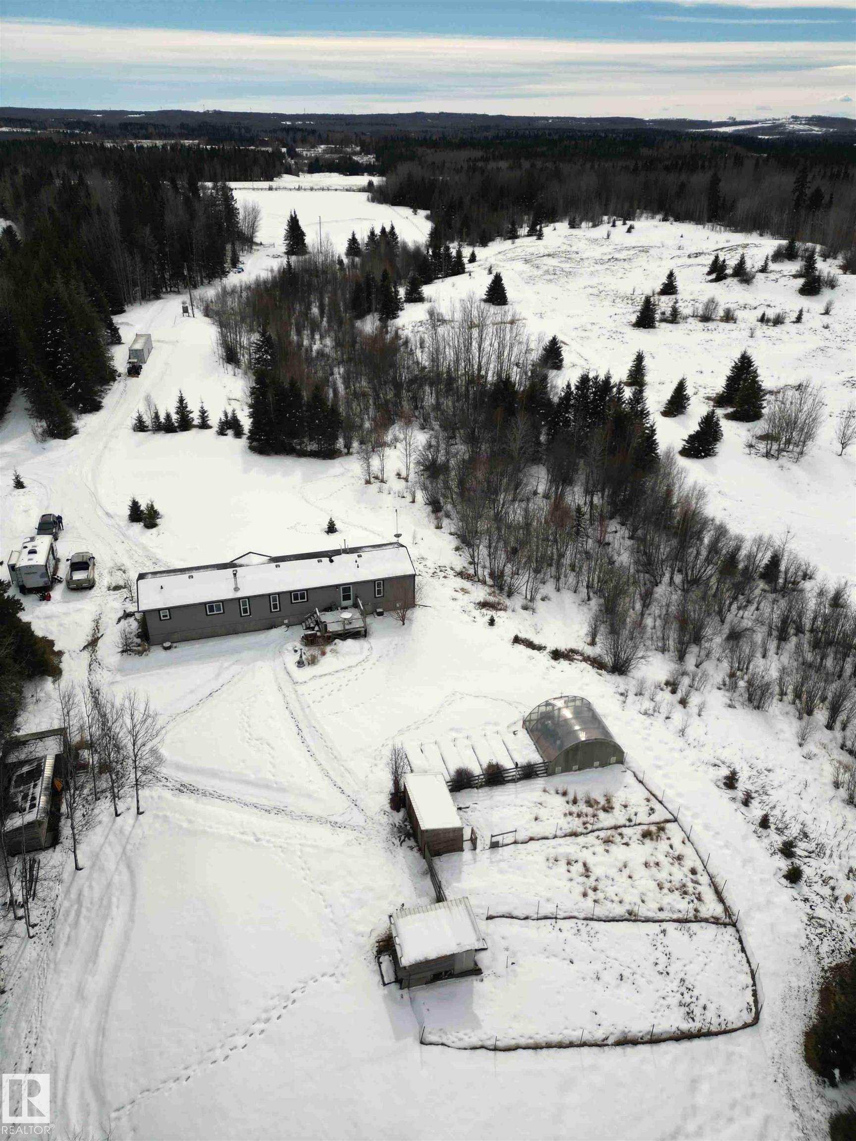 Great opportunity to embrace everything country living has to offer! This scenic 51-acre parcel features a well-maintained 1,520 sq ft mobile home (2015) set within a beautifully manicured and private yardsite. The home is thoughtfully designed with numerous south-facing windows, filling the space with natural light while providing beautiful views of the surrounding landscape. Outside, the property is perfectly set up for a hobby farm or rural lifestyle, complete with a greenhouse, raised garden beds, two chicken houses, a storage shed, woodshed and a seacan for additional storage. The property offers a versatile mix of hay and grazing land, seasonal creeks and mature trees, --ideal for horses or cattle. Conveniently located between Winfield and Breton, this unique property combines peace, privacy, and practicality in a picturesque rural setting.